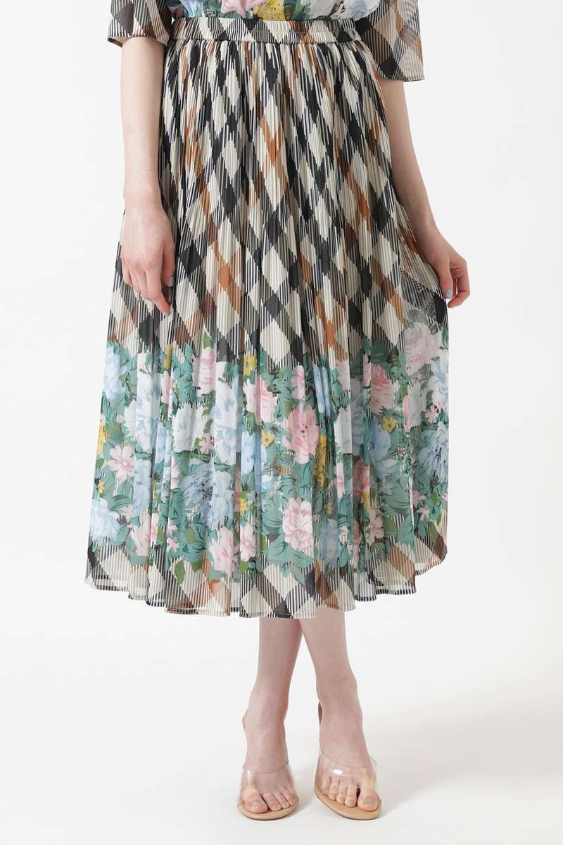 ツイルハウスチェックフラワープリントプリーツスカート