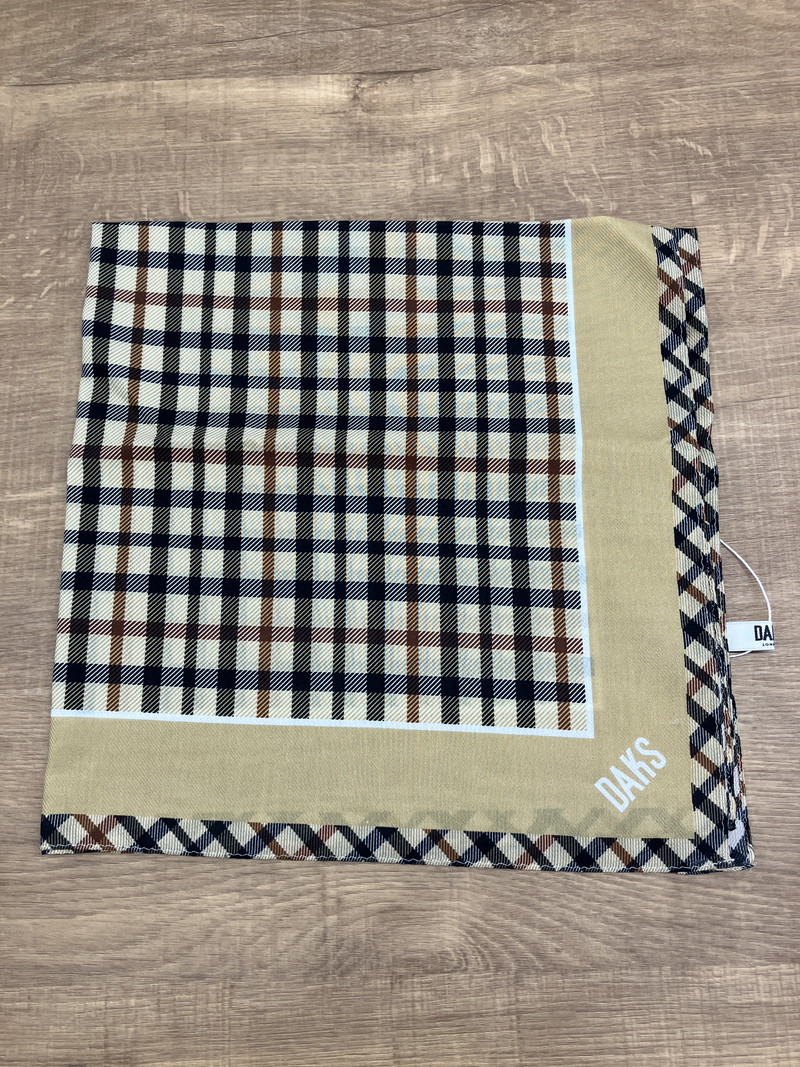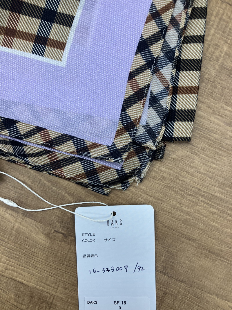 DAKSチェックのプチスカーフです。コットンシルク素材なので、スカーフとしてはもちろんハンカチとしてもお使いいただけます。首元やバッグの持ち手のちょっとしたアクセサリーなど、ギフトとしてもおすすめです。ご家庭での手洗いが可能です。
