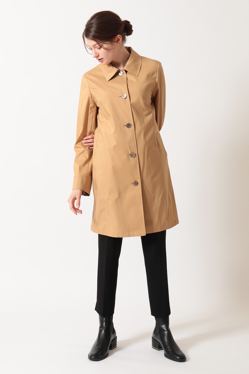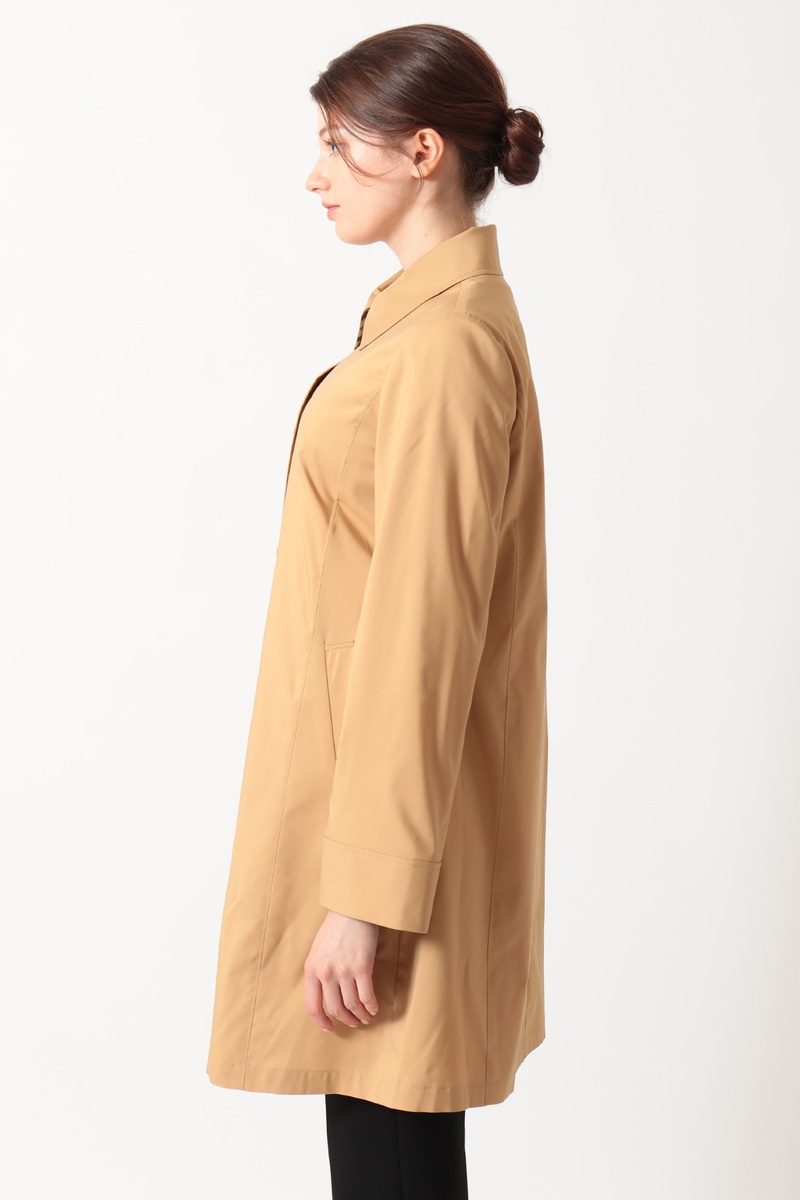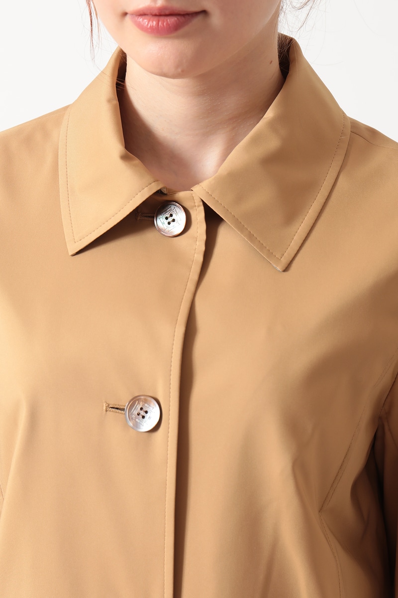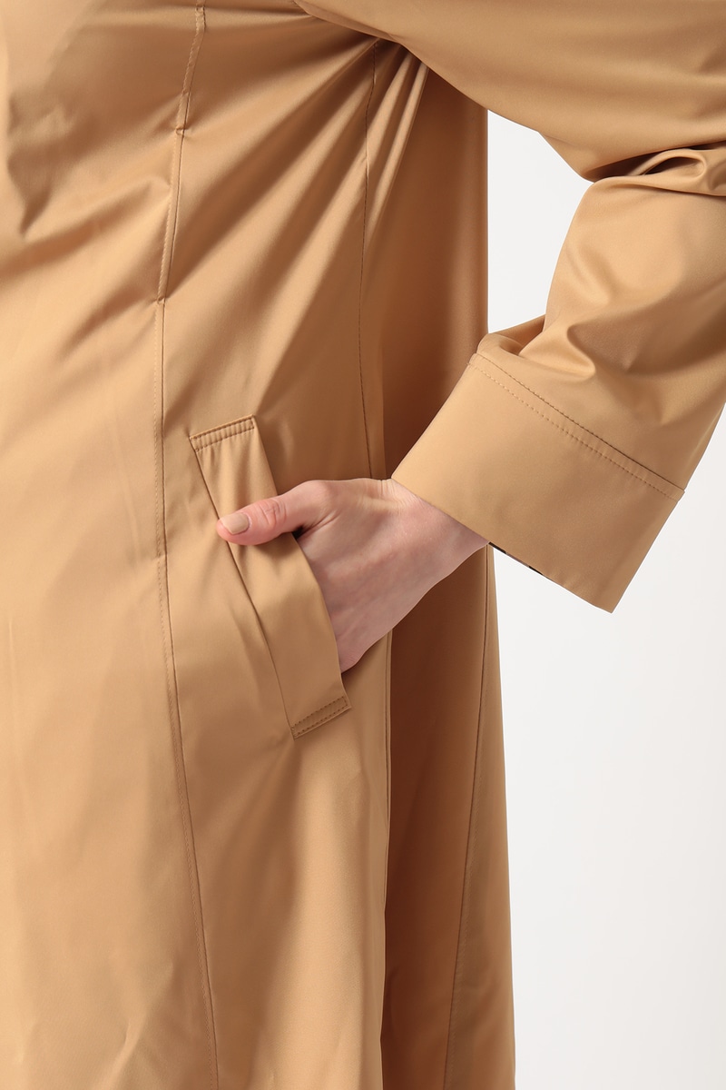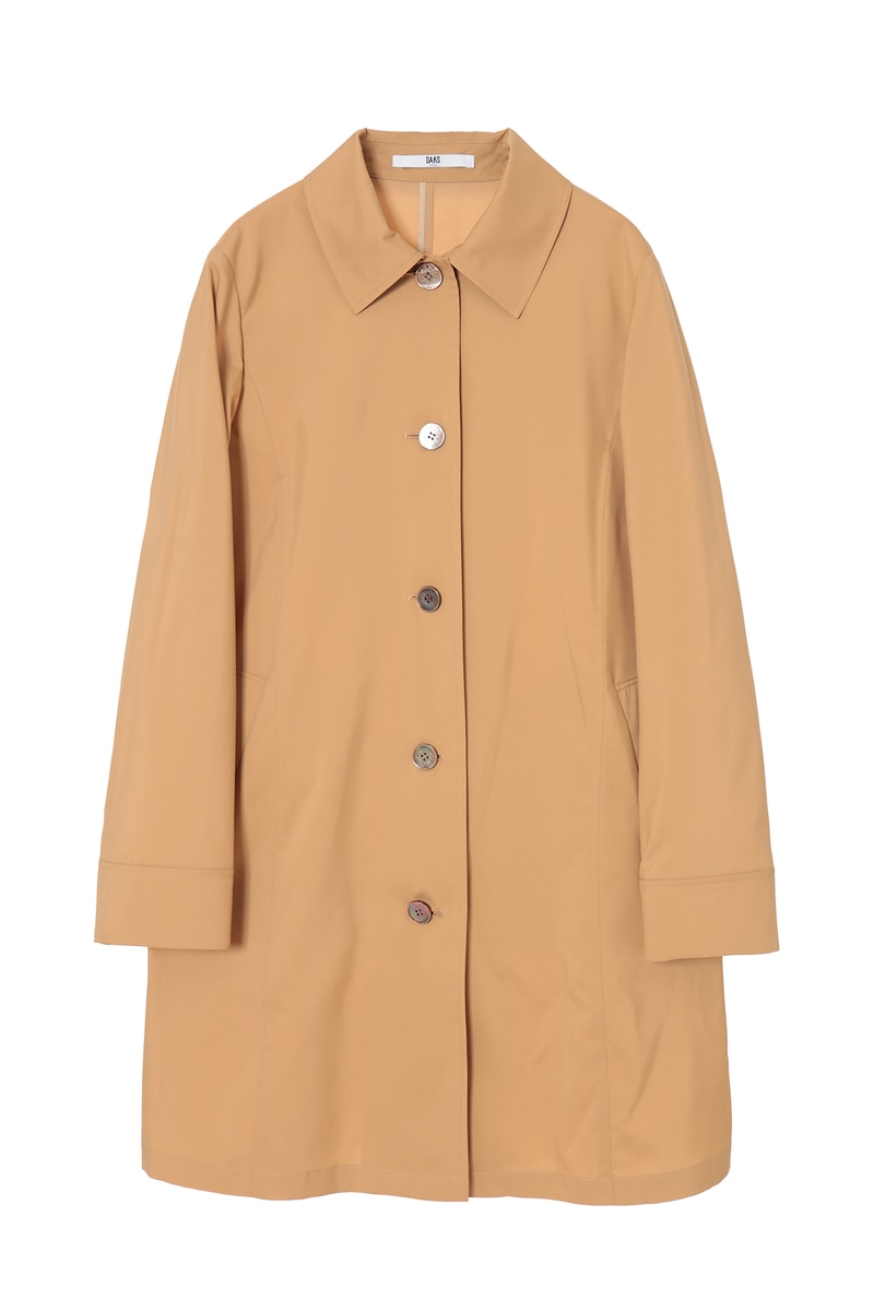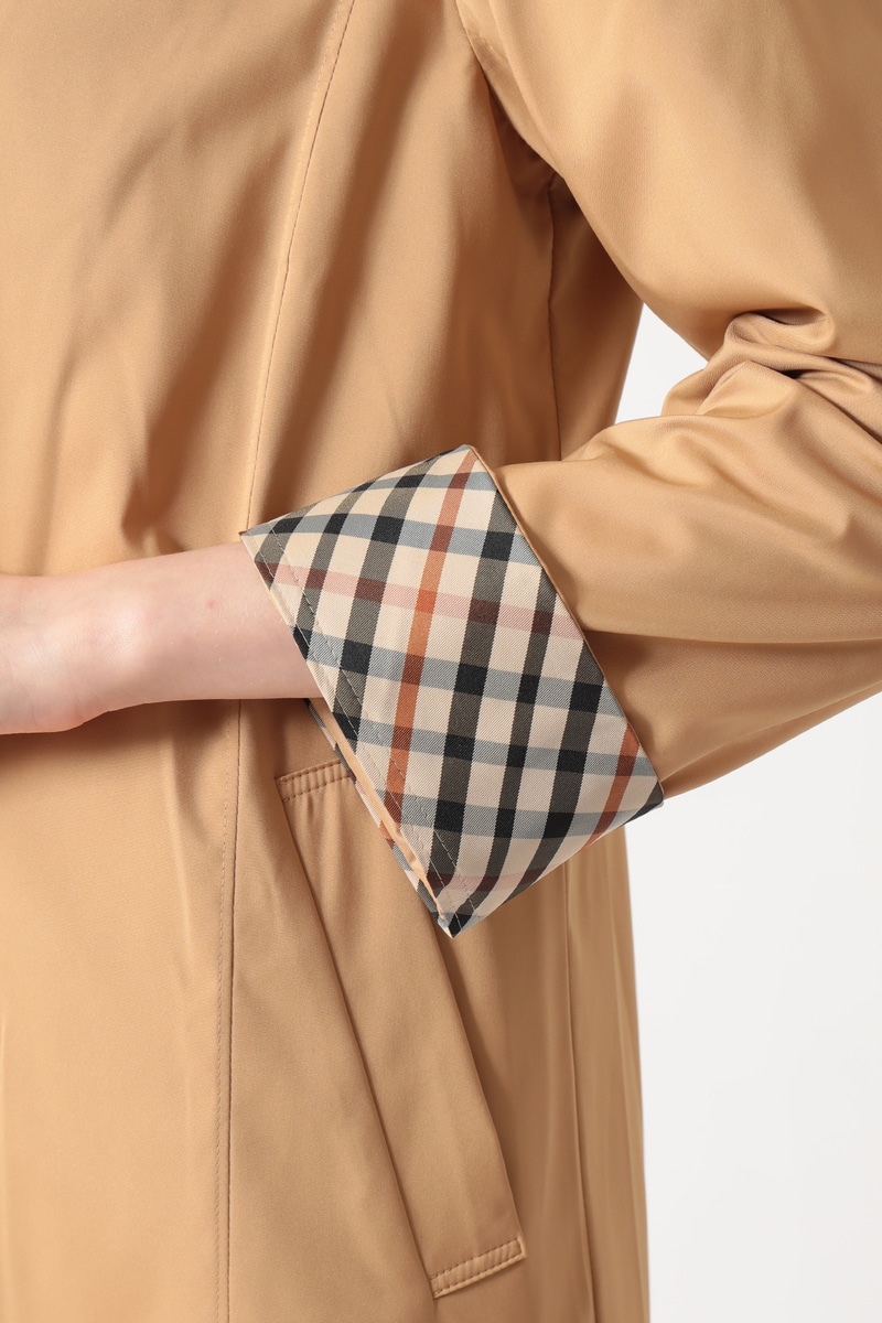 素材は、上品な光沢とハリを持つポリエステル100%の撥水タフタ。突然の雨にも対応し、シワになりにくいのが特徴です。袖口裏部分にはDAKSのハウスチェック柄があしらわれています。季節の変わり目に重宝する、上品な大人のデイリーアウターです。