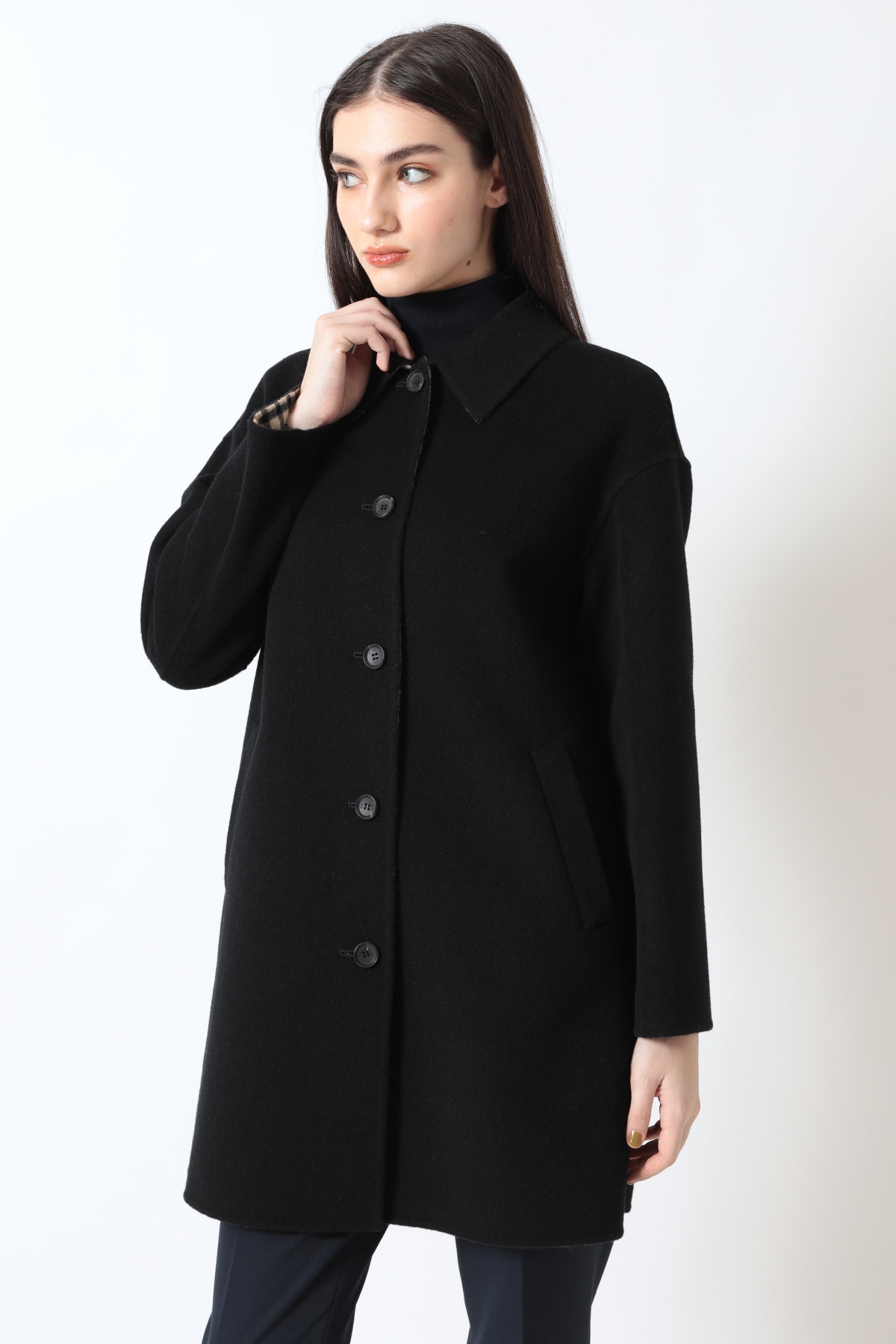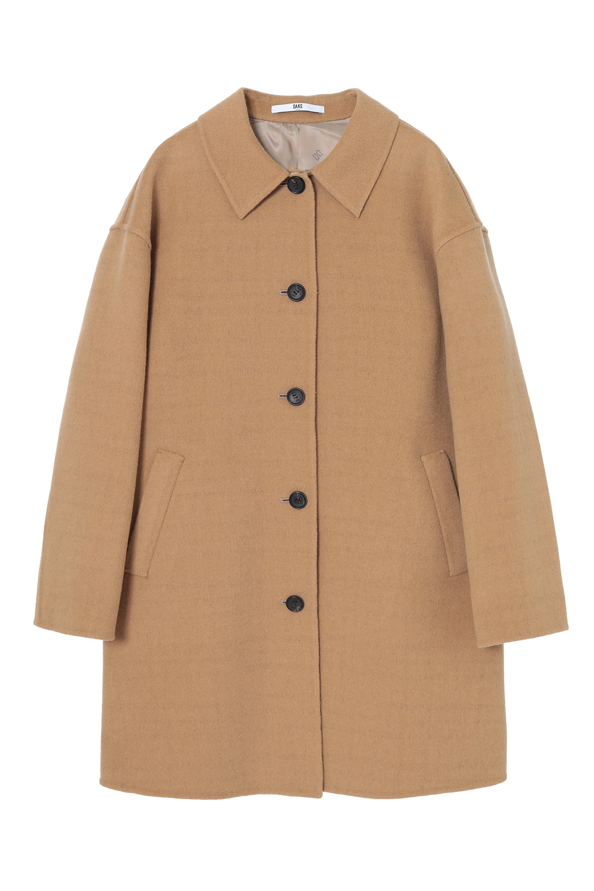 上質なウール素材を使用したショートステンカラーコート。肩まわりにゆとりを持たせたすっきりとしたAラインシルエットで、きちんと感のある表情と抜け感の両方を備えています。袖口を折り返すとDAKSのアイコンであるハウスチェックが覗き、さりげないブランドアクセントに。比翼仕立ての前立てとシンプルなポケットデザインにより、ビジネスから休日のきれいめカジュアルまで幅広い着こなしに馴染みます。裏地は滑らかなキュプラで着心地よく、国内生産ならではの仕立ての良さが光る一枚です。