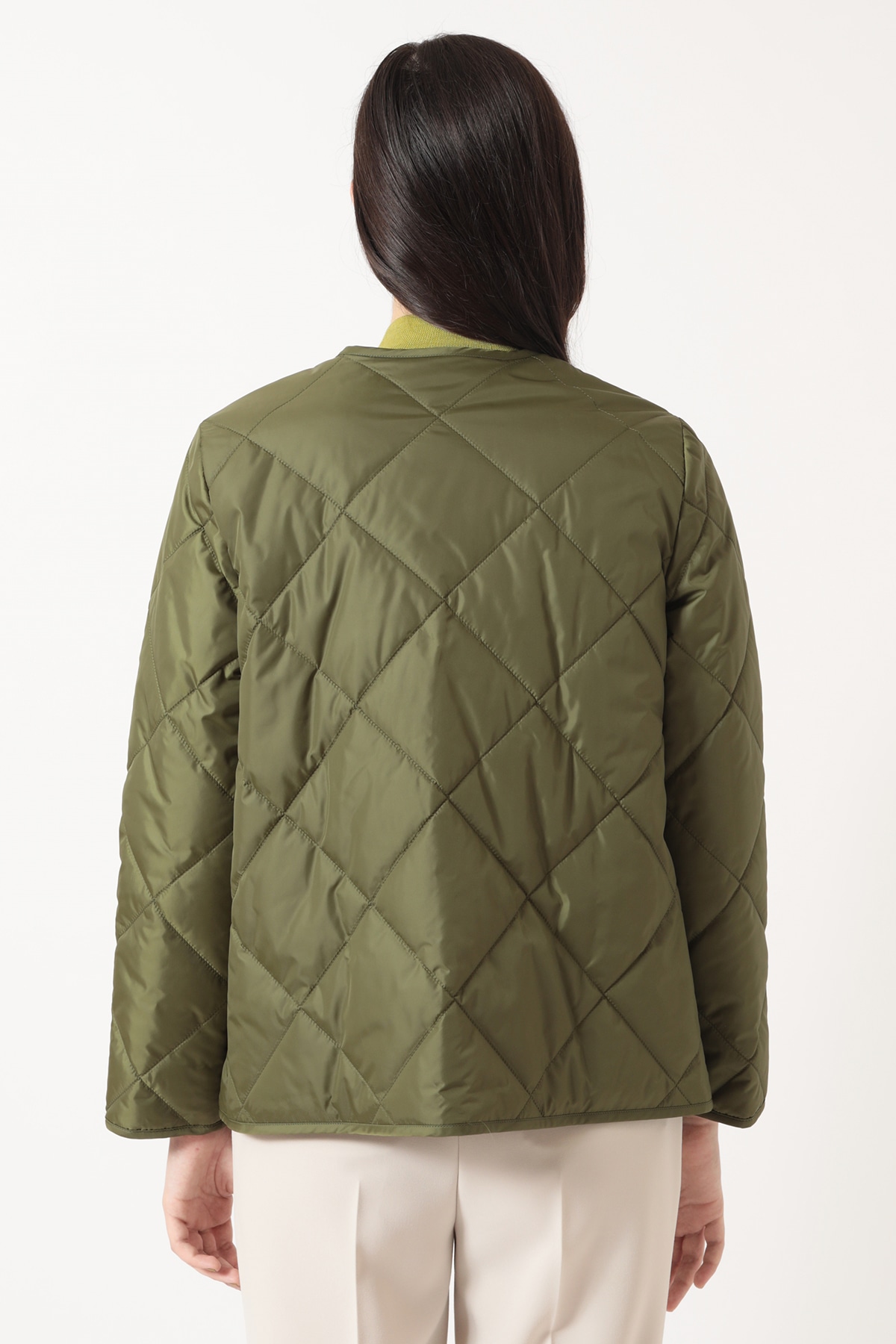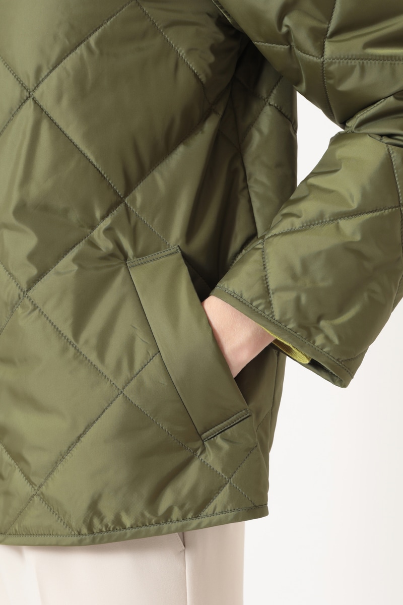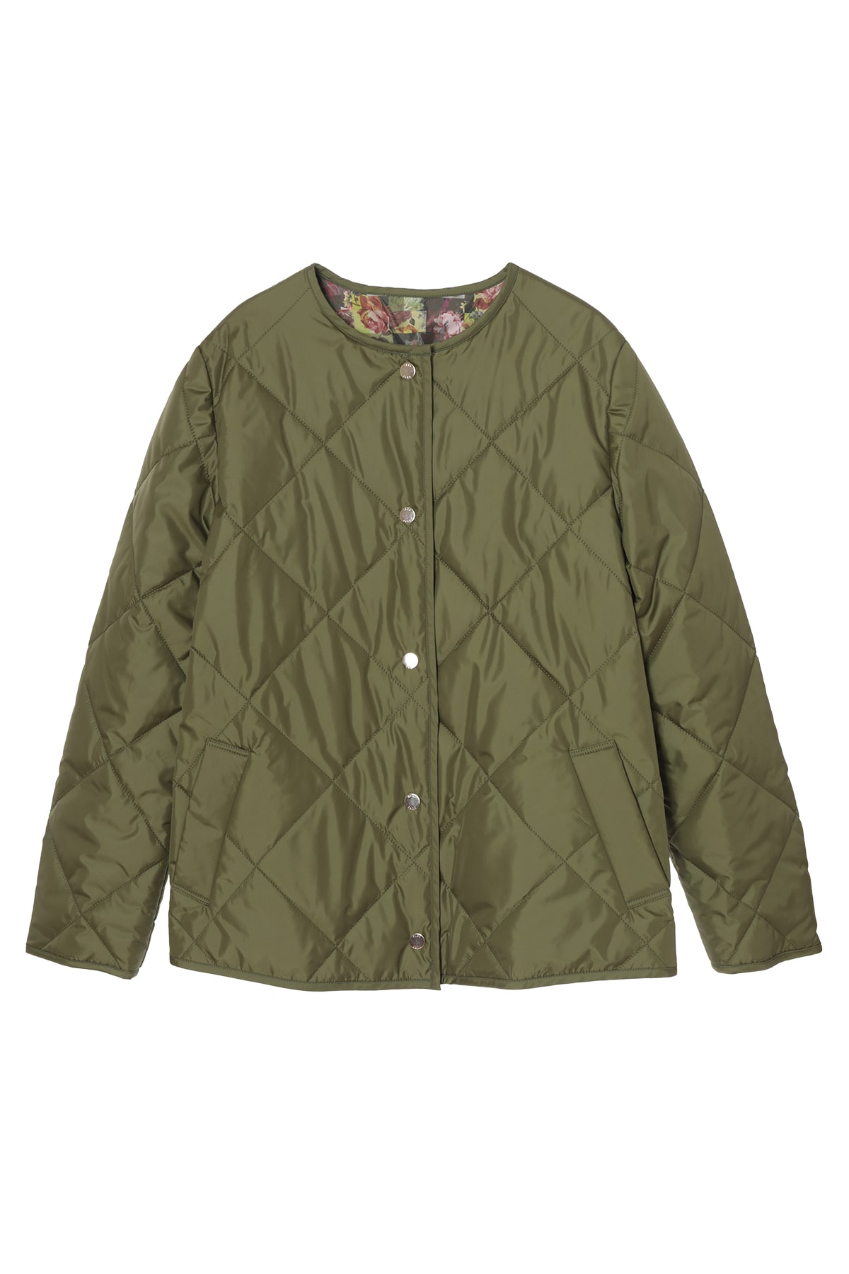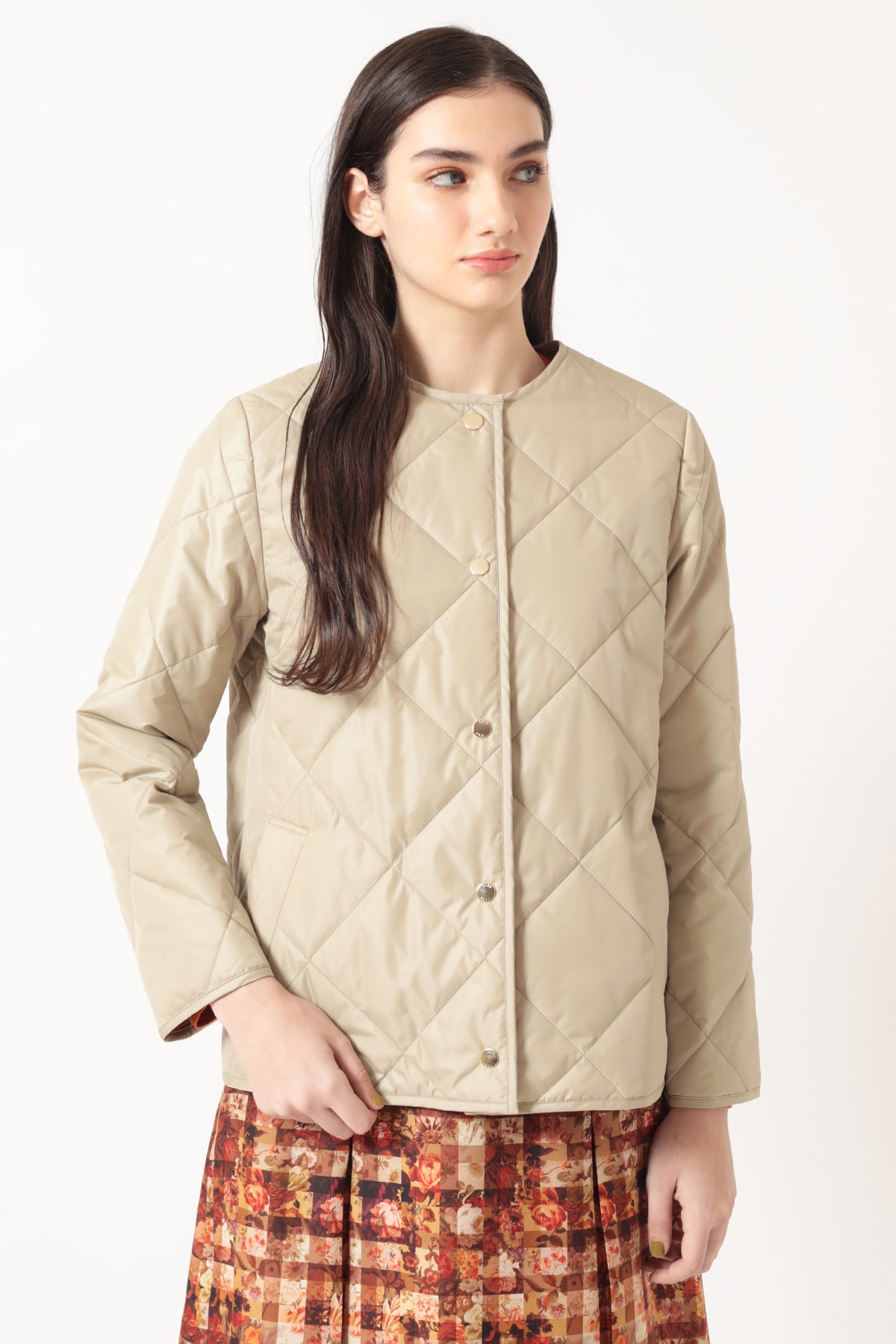 50デニールの高密度タフタにキルティングを施した素材と、リバティ社に別注したアーカイブプリントをリバーシブルで使用しています。軽量でありながらも優れた保温性を持ち、DAKSらしい上品さと機能性を両立させた素材です。