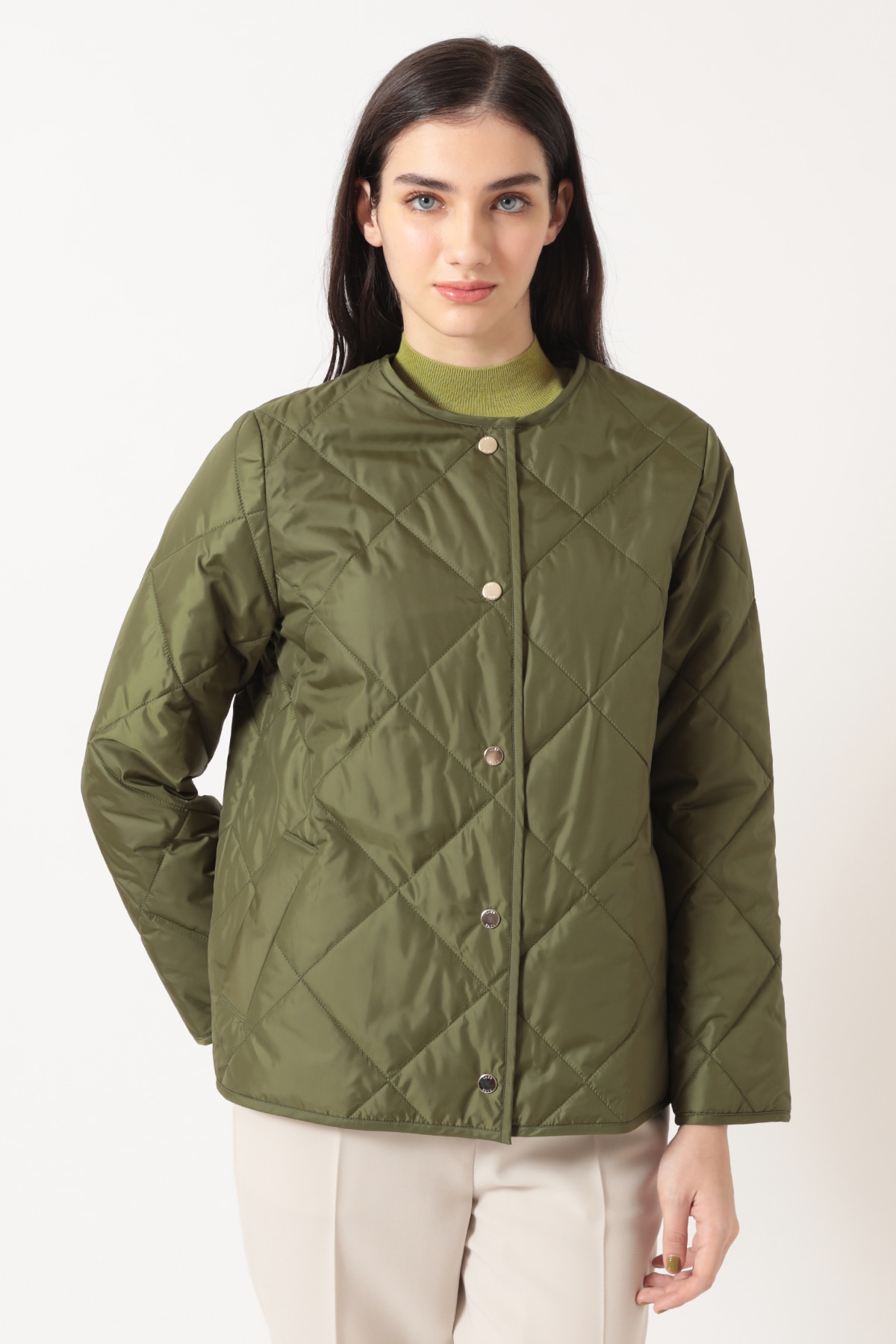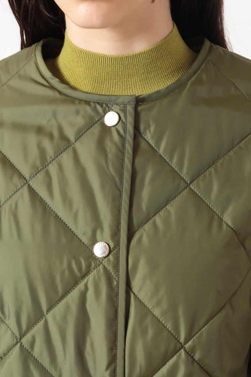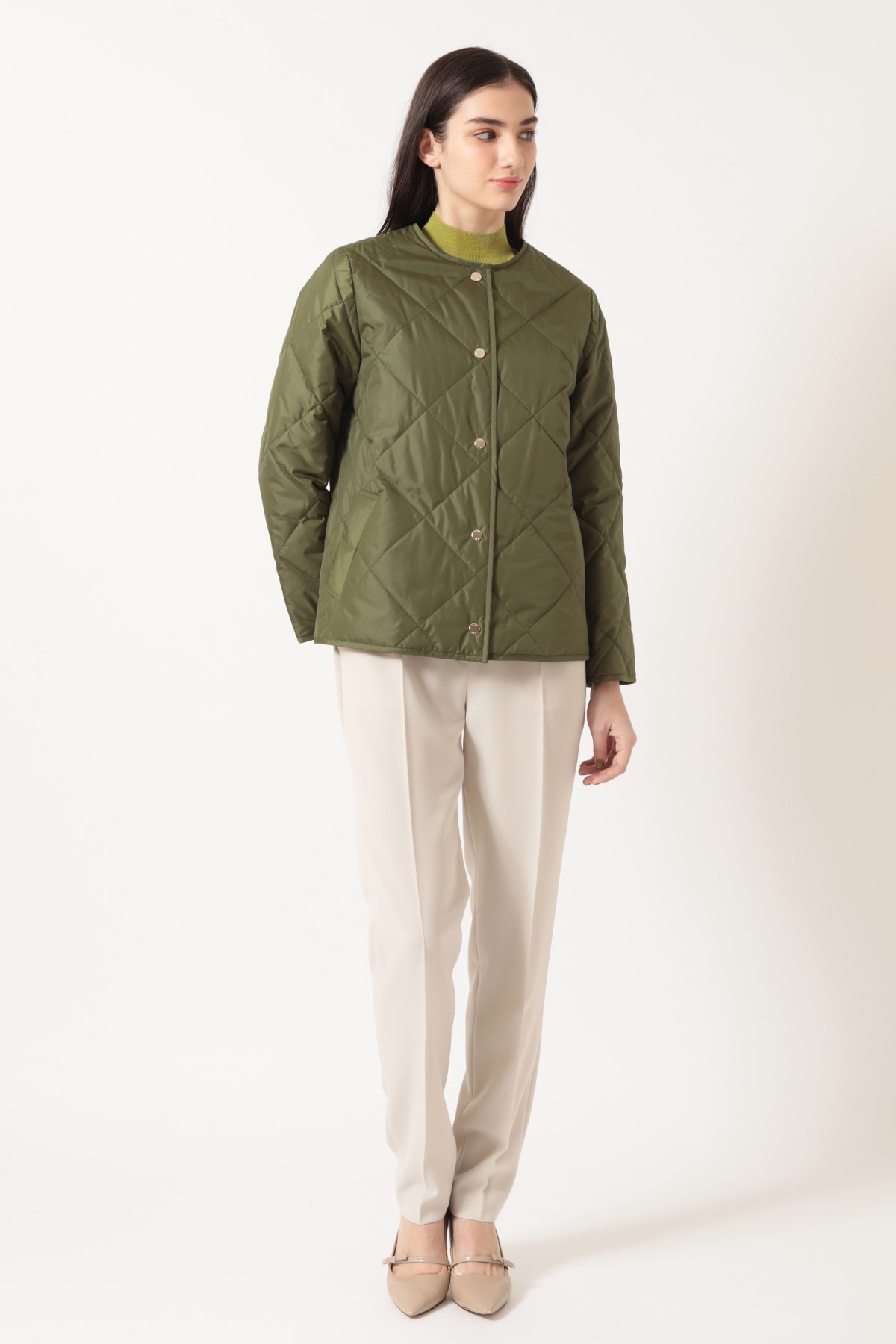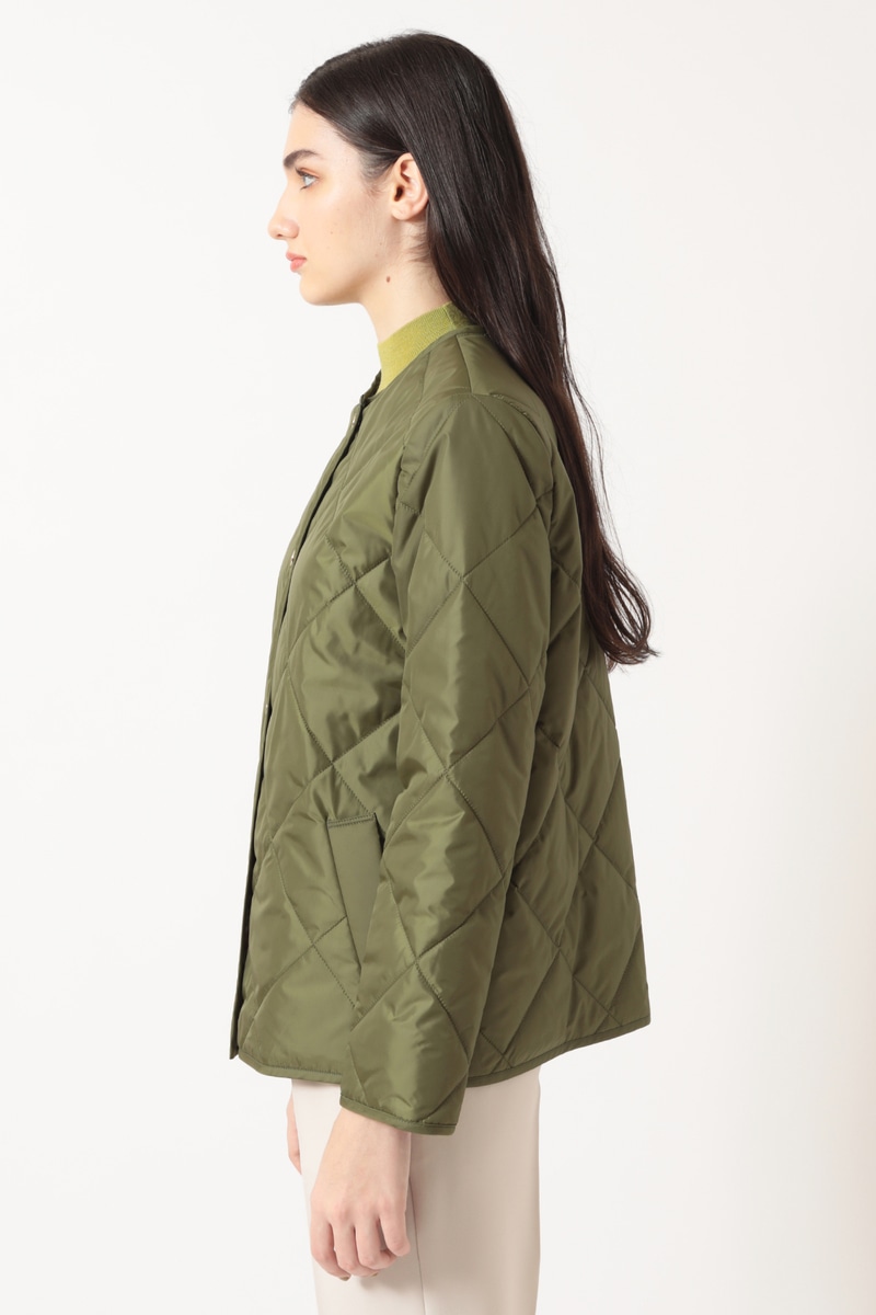 50デニールの高密度タフタにキルティングを施した素材と、リバティ社に別注したアーカイブプリントをリバーシブルで使用しています。軽量でありながらも優れた保温性を持ち、DAKSらしい上品さと機能性を両立させた素材です。