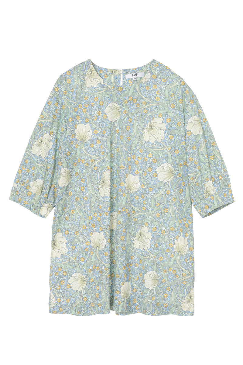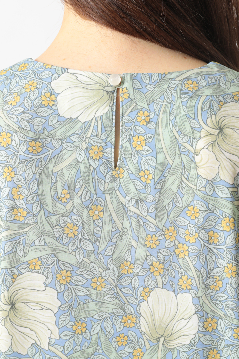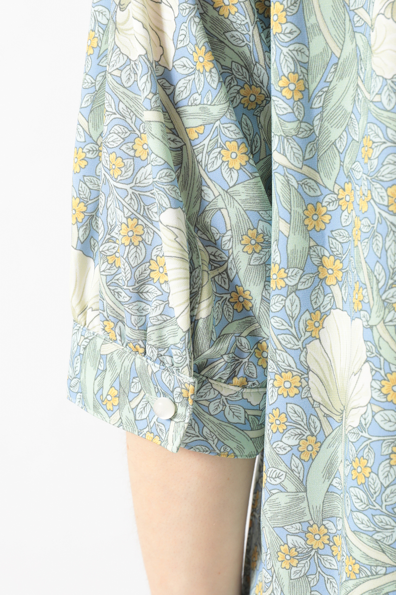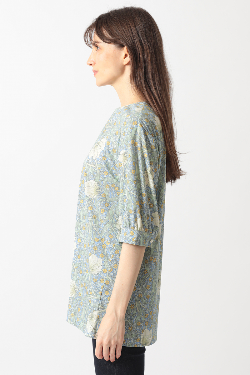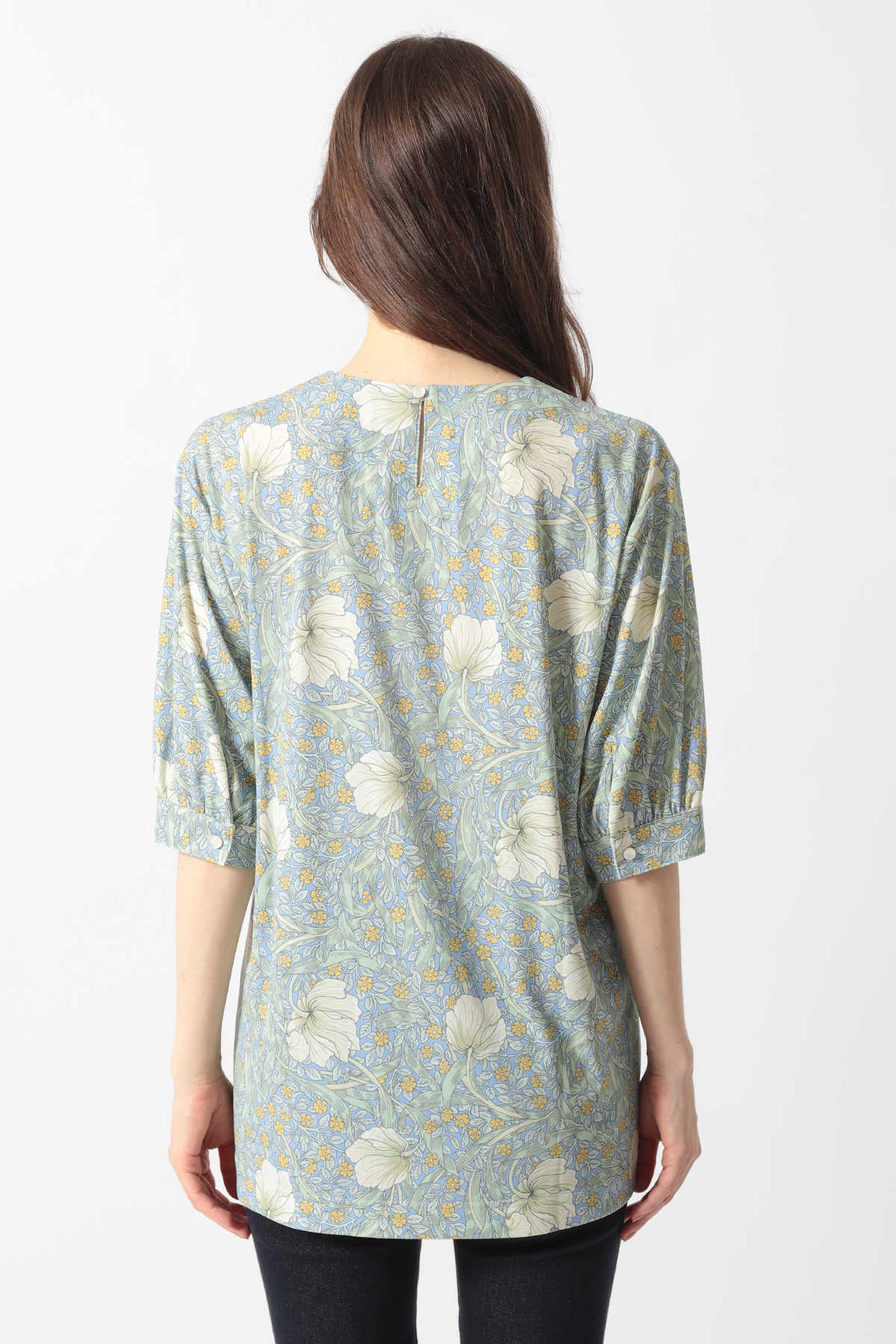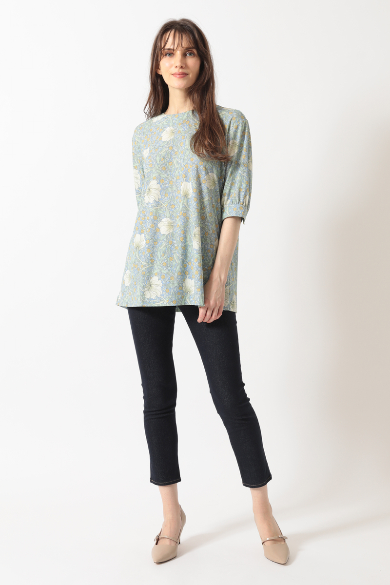 美しいボタニカルプリントが目を引く、七分袖のプルオーバーブラウスです。シワになりにくいポリエステル素材で、お手入れも簡単。ゆったりとしたシルエットで体型カバー効果も期待でき、軽やかな着心地です。シンプルなボトムスと合わせるだけで、華やかで上品なコーディネートが完成します。