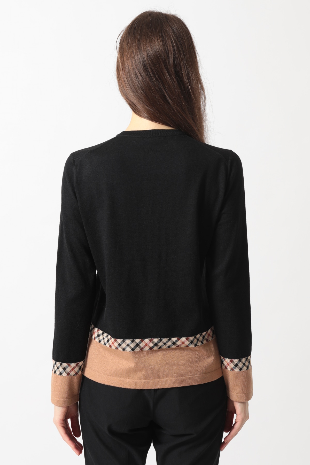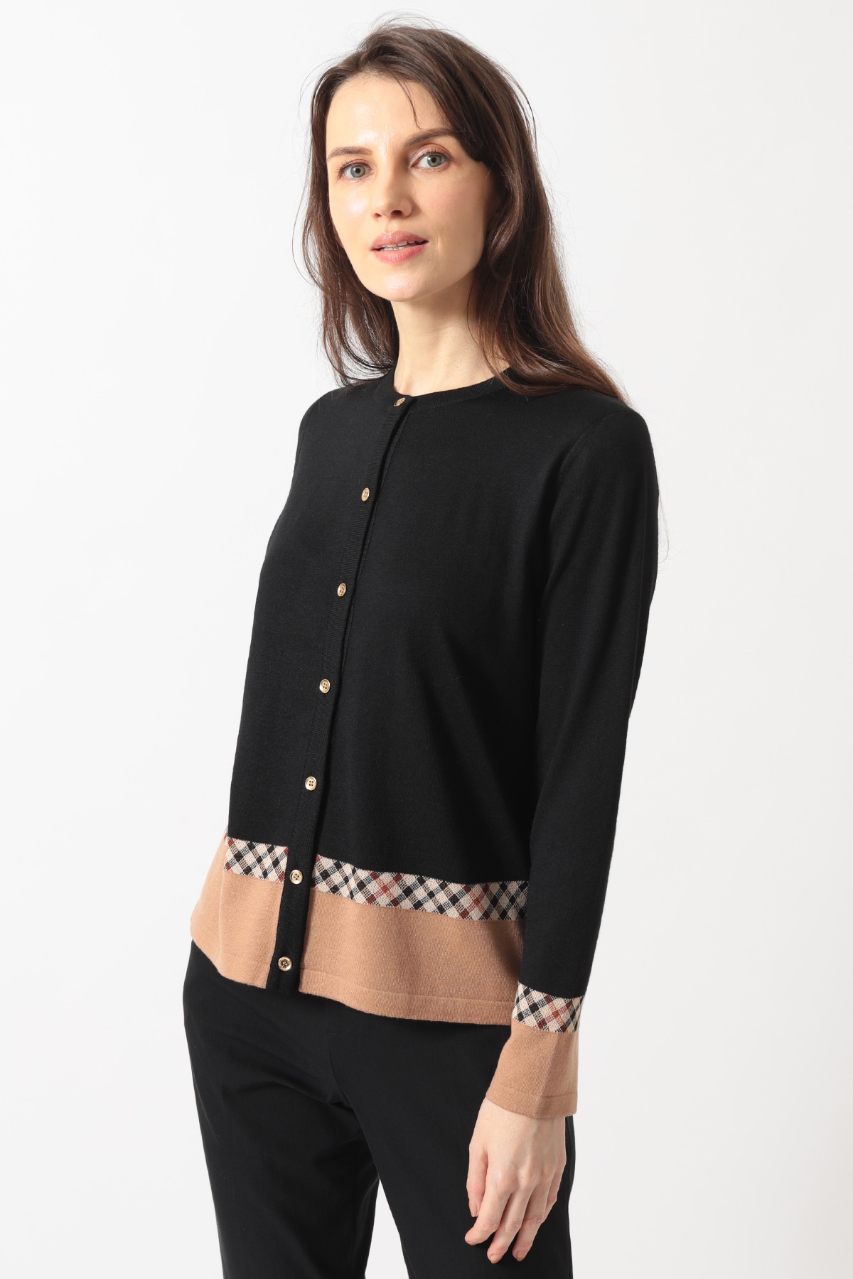部分的にハウスチェックジャカードをあしらったクルーネックカーディガンです。DAKSの象徴であるハウスチェック柄を基調とした配色と、シーズナルなチェックカラーに合わせた配色の2種類をご用意しました。気温の高い日から肌寒い日まで長くご着用いただけるよう、手洗い可能な素材でお手入れも簡単です。