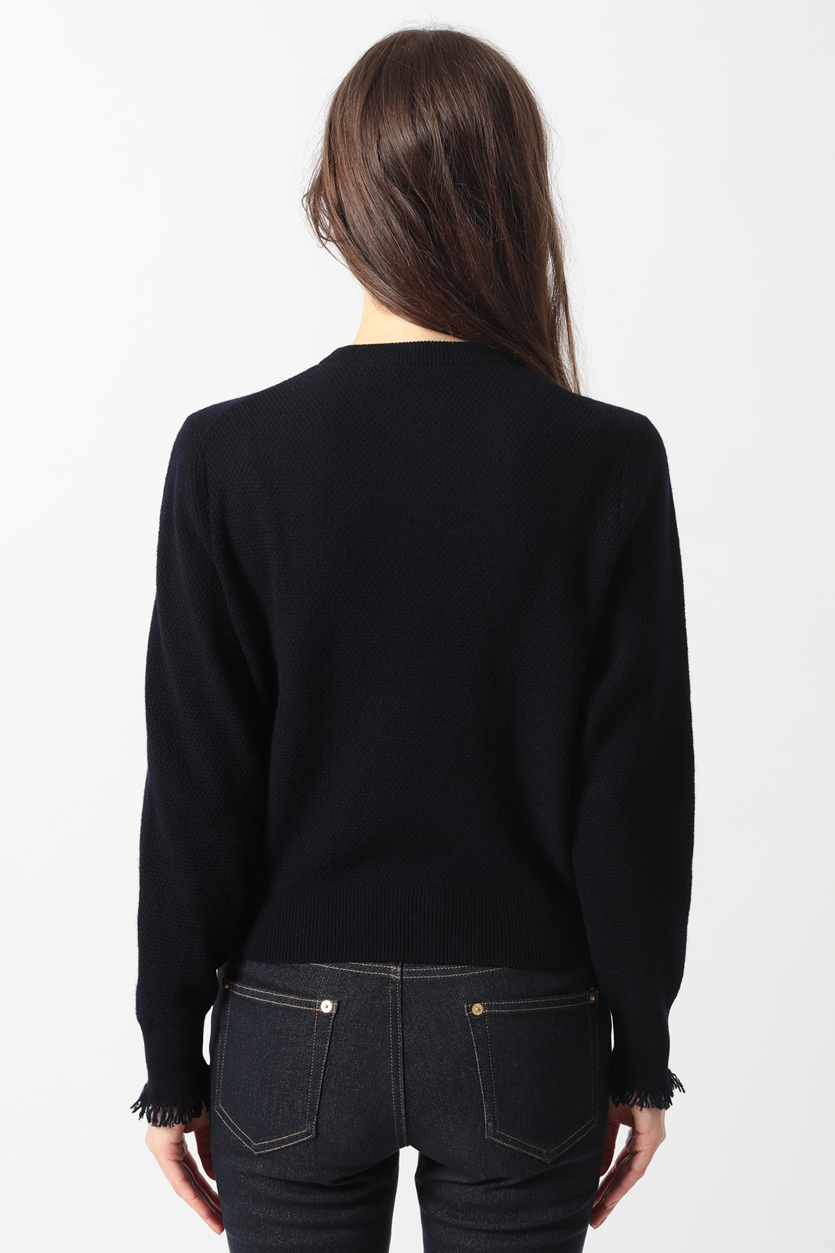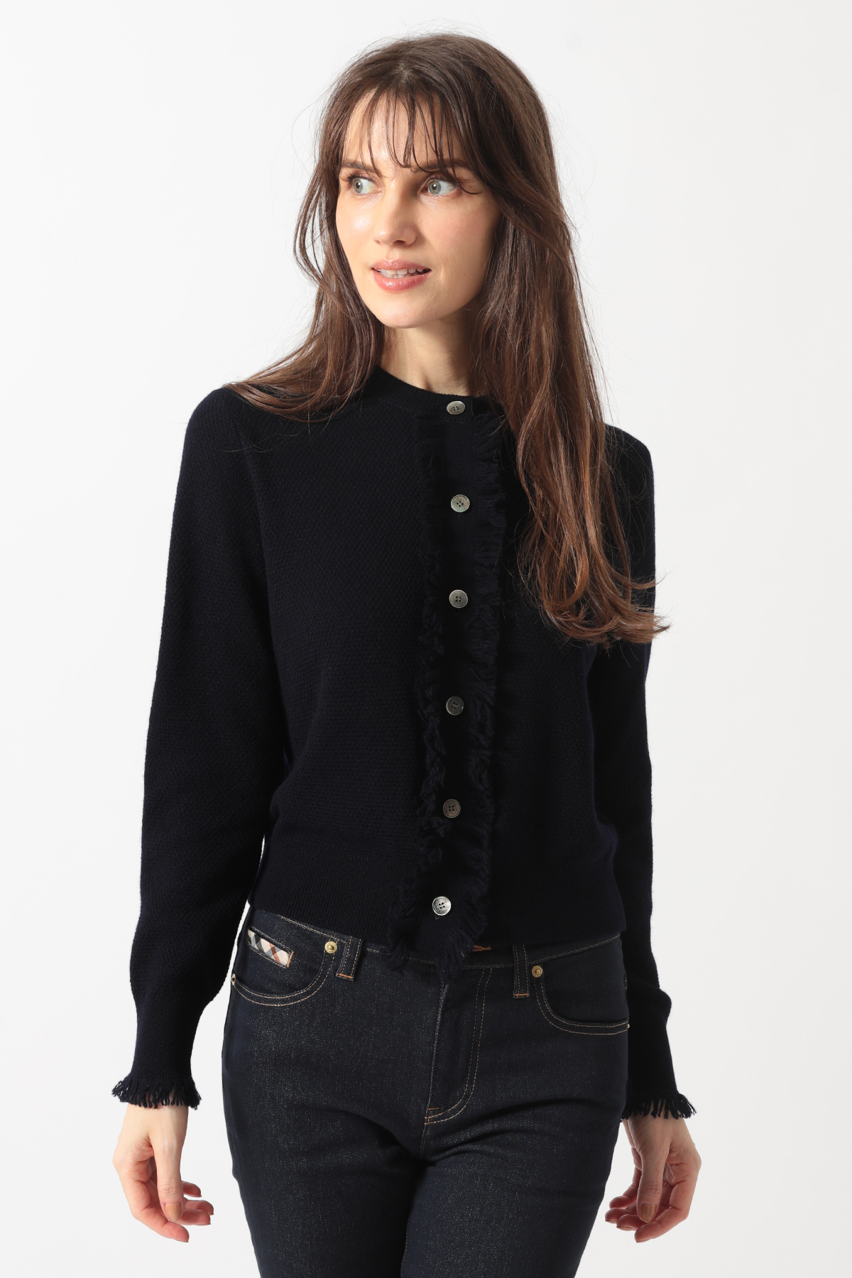 前立てと袖口のフリンジがデザインのアクセントになったクルーネックカーディガンです。ふんわりとしたカノコ編みが、カジュアルすぎず優しい軽やかな印象を演出します。着丈をコンパクトに仕上げているため、シンプルなボトムスにもデザイン性のあるボトムスにも相性が良く、幅広いコーディネートで活躍する着回し力抜群の一枚です。