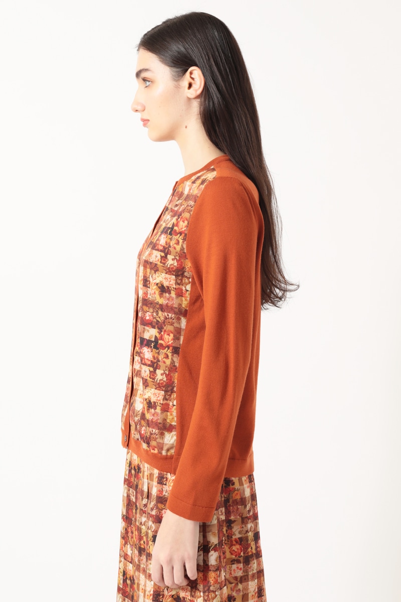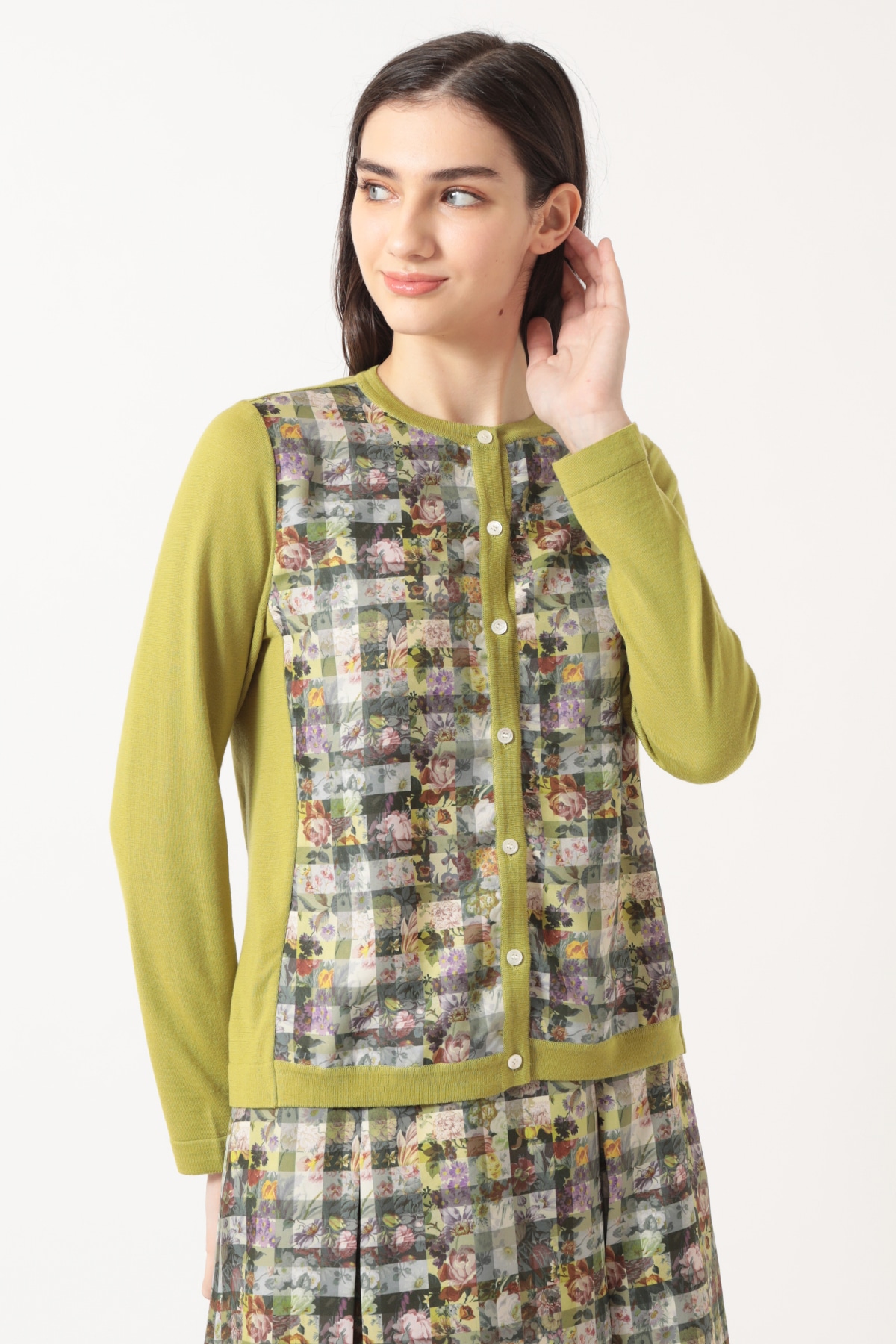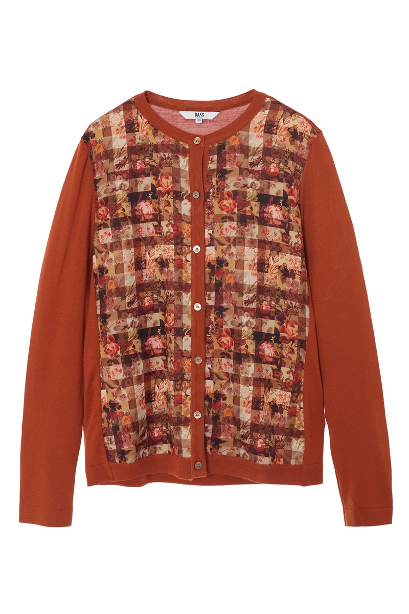 リバティ社のアーカイブ資料から厳選されたプリント生地と、ニットをコンビにしたカーディガンです。ニット部分にはスーパーファインメリノを使用し、肌触り良く上品な仕上がりに。同柄のスカートとのセットアップコーディネートは特におすすめで、DAKSらしい洗練されたアンサンブルをお楽しみいただけます。一枚で主役になる、華やかで品のあるアイテムです。
