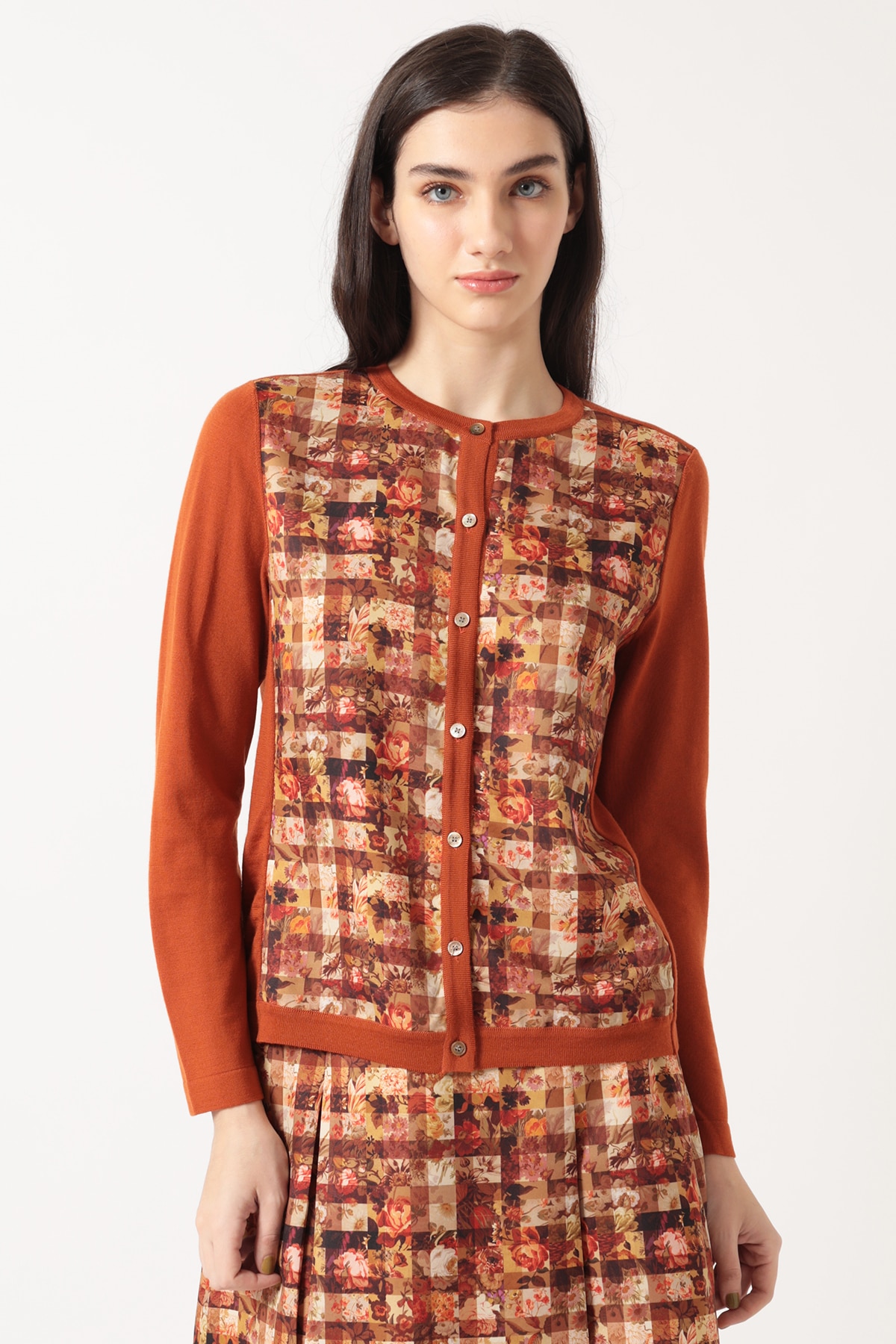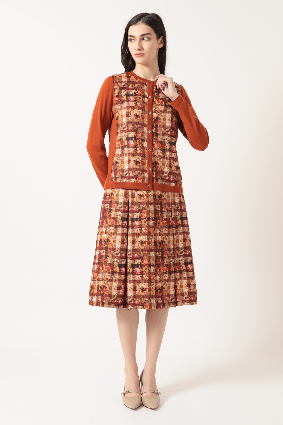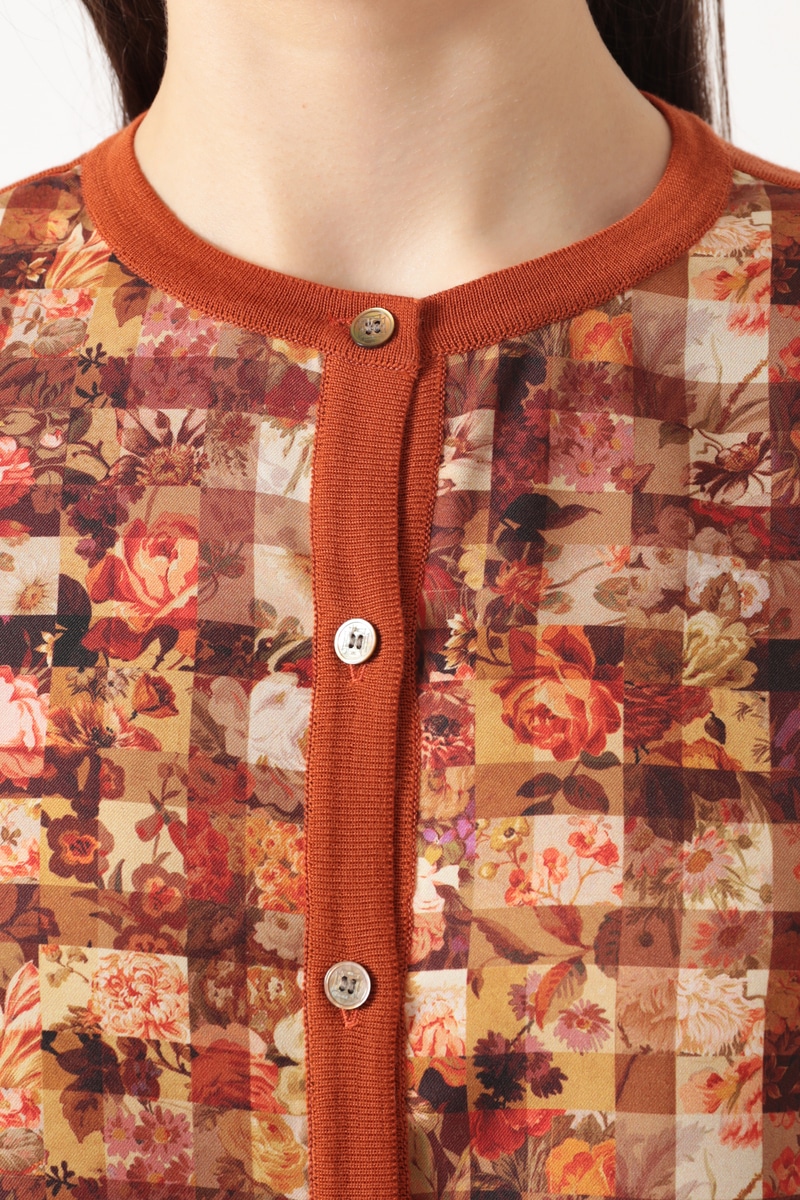 リバティ社のアーカイブ資料から厳選されたプリント生地と、ニットをコンビにしたカーディガンです。ニット部分にはスーパーファインメリノを使用し、肌触り良く上品な仕上がりに。同柄のスカートとのセットアップコーディネートは特におすすめで、DAKSらしい洗練されたアンサンブルをお楽しみいただけます。一枚で主役になる、華やかで品のあるアイテムです。