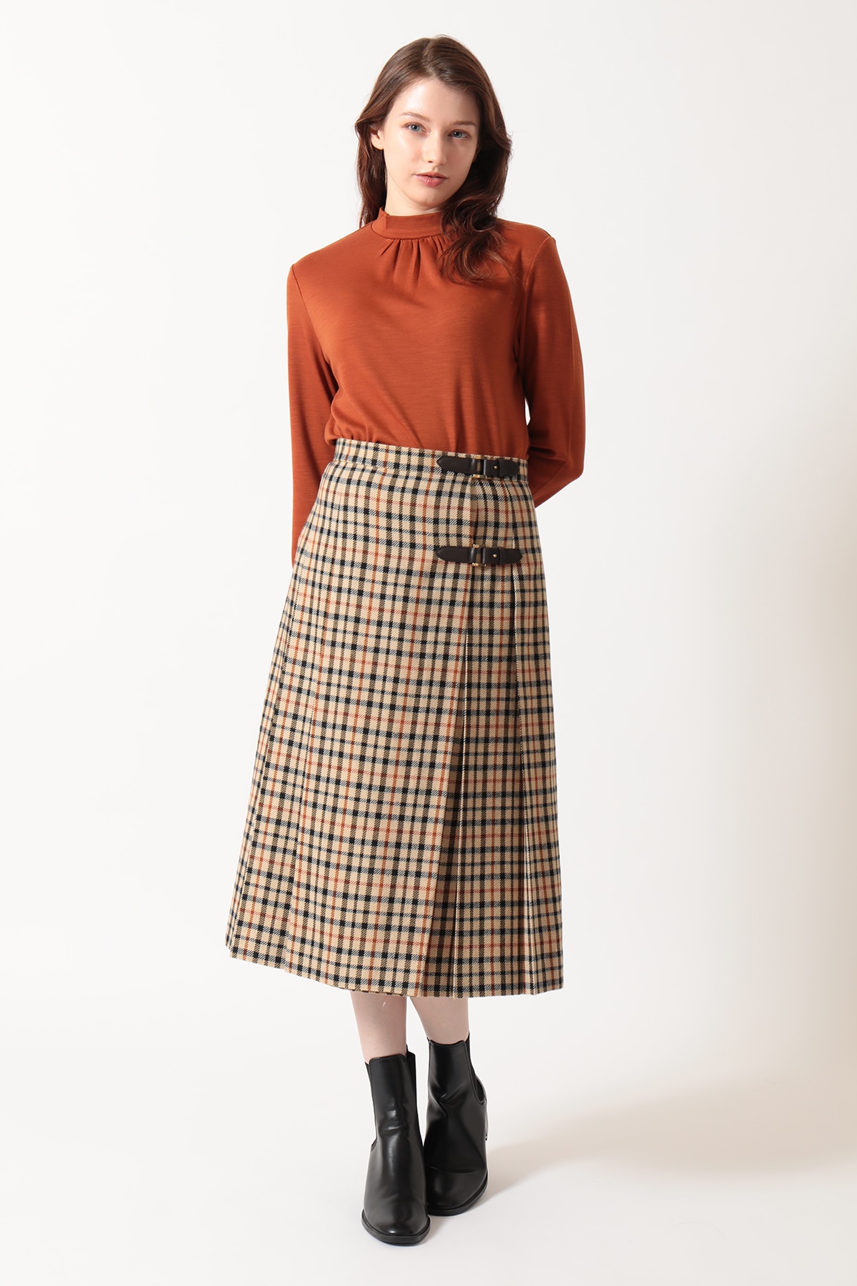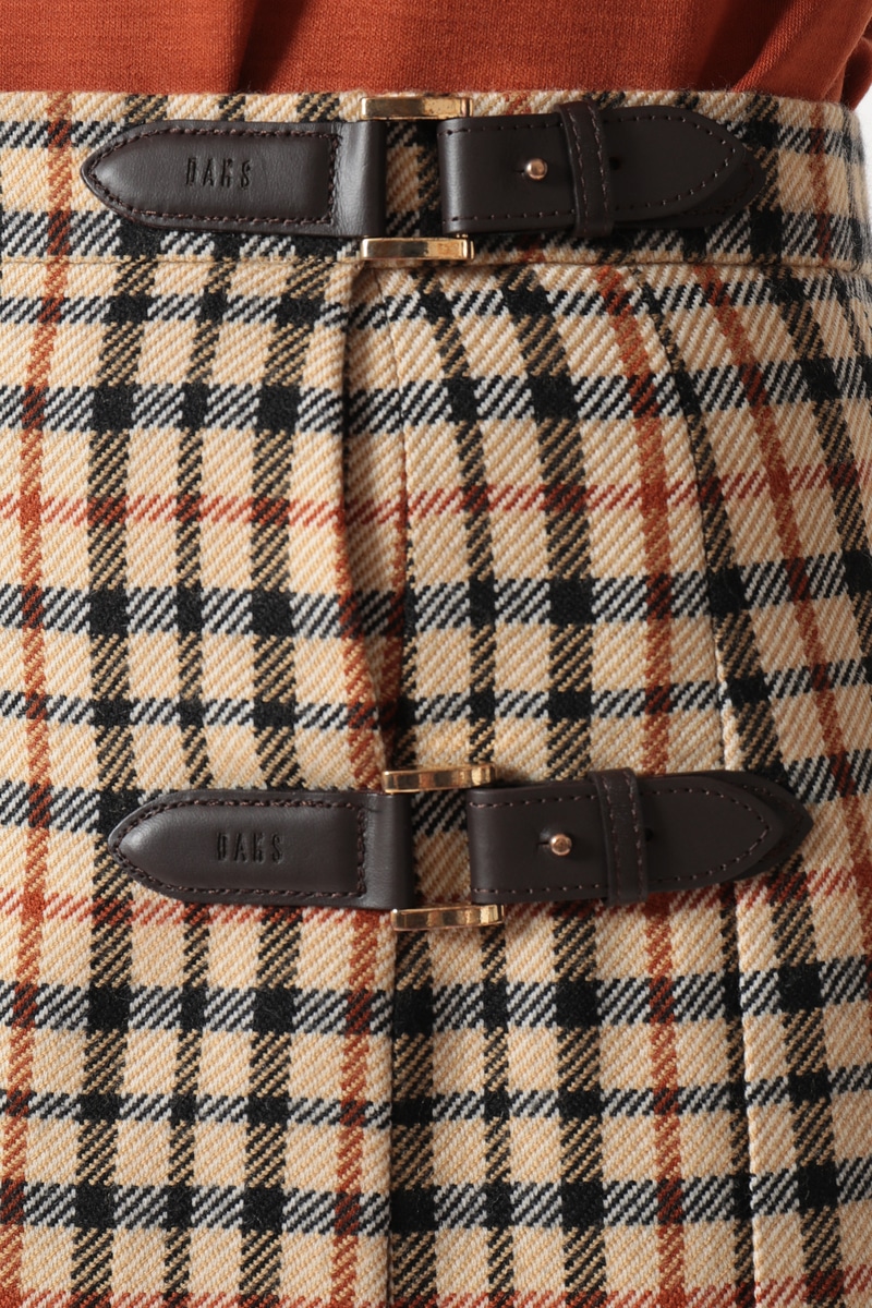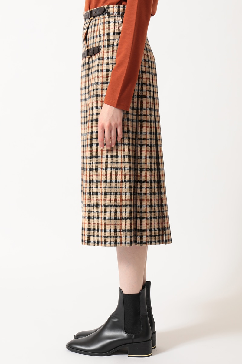 DAKS定番のタミースカートが、今季らしい表情で登場です。少し太めのプリーツ幅と長めの丈が特徴で、モダンな印象を演出します。上品でありながらも、トレンド感のある着こなしが叶う一枚。カジュアルにもきれいめにも合わせやすく、幅広いシーンで活躍するDAKSこだわりのスカートです。