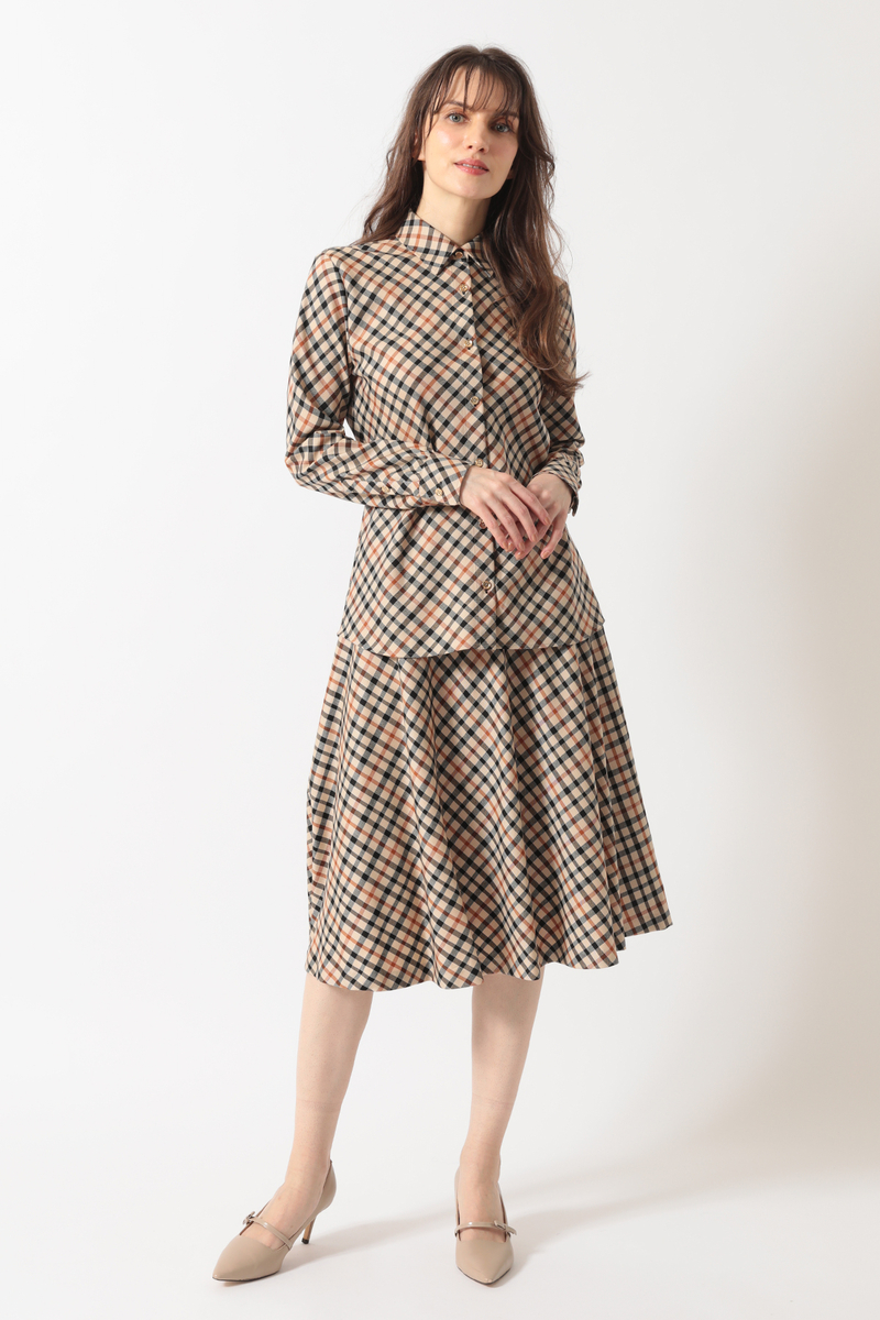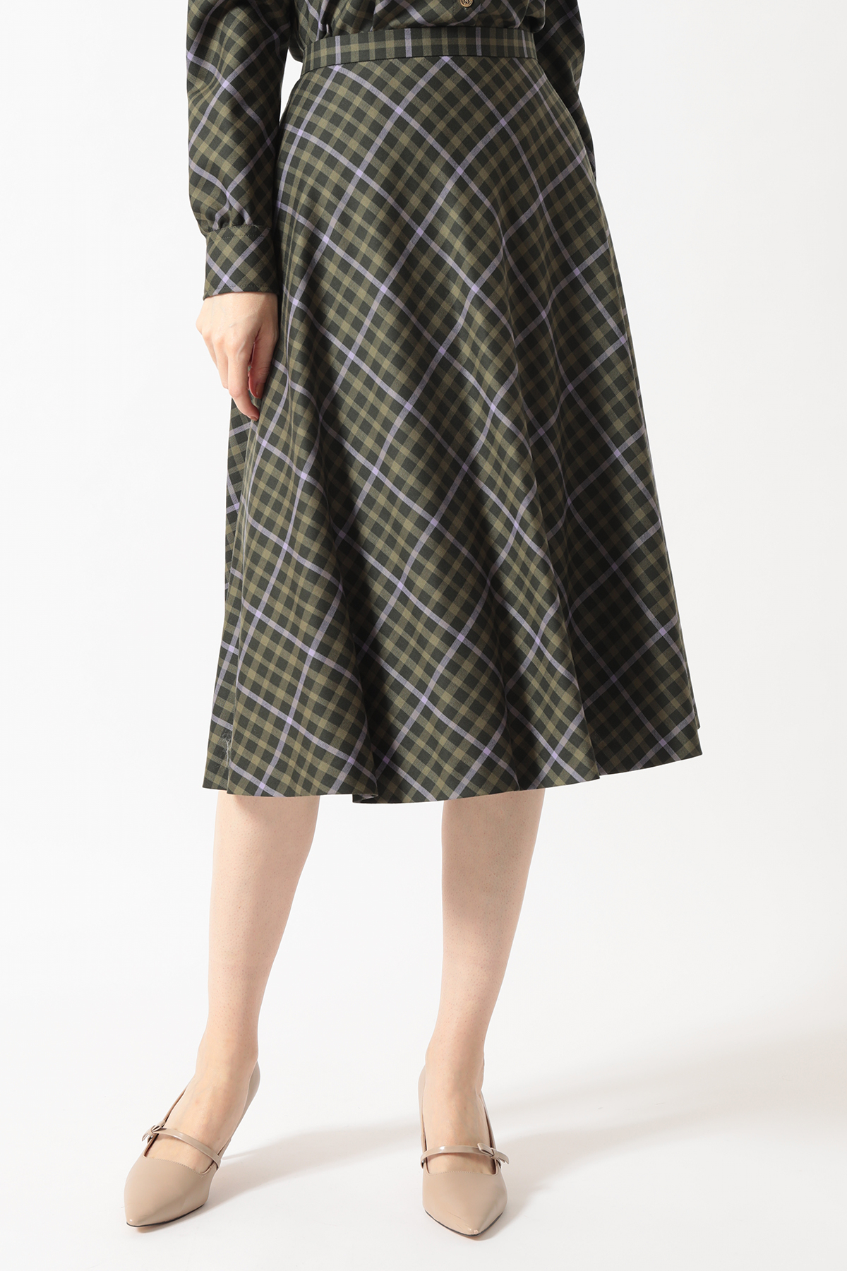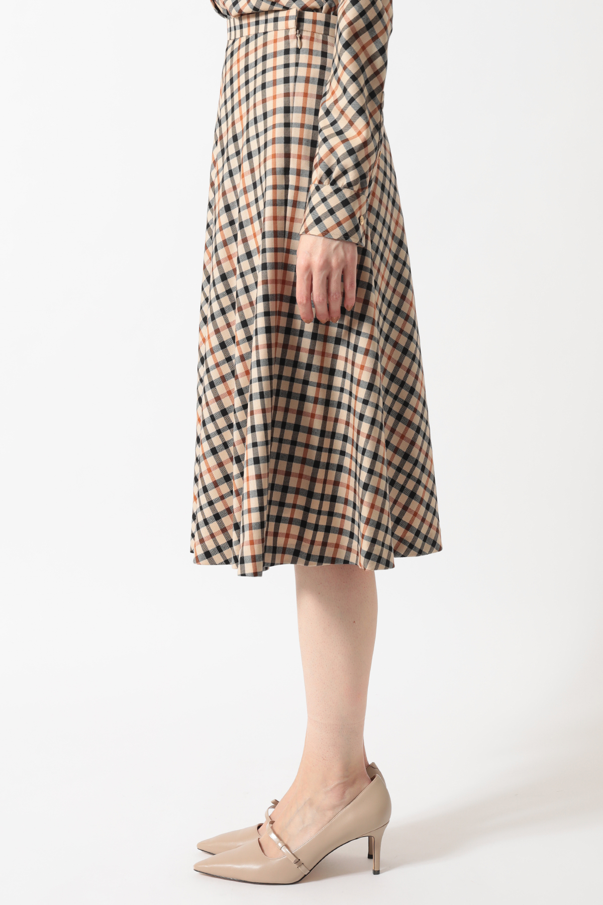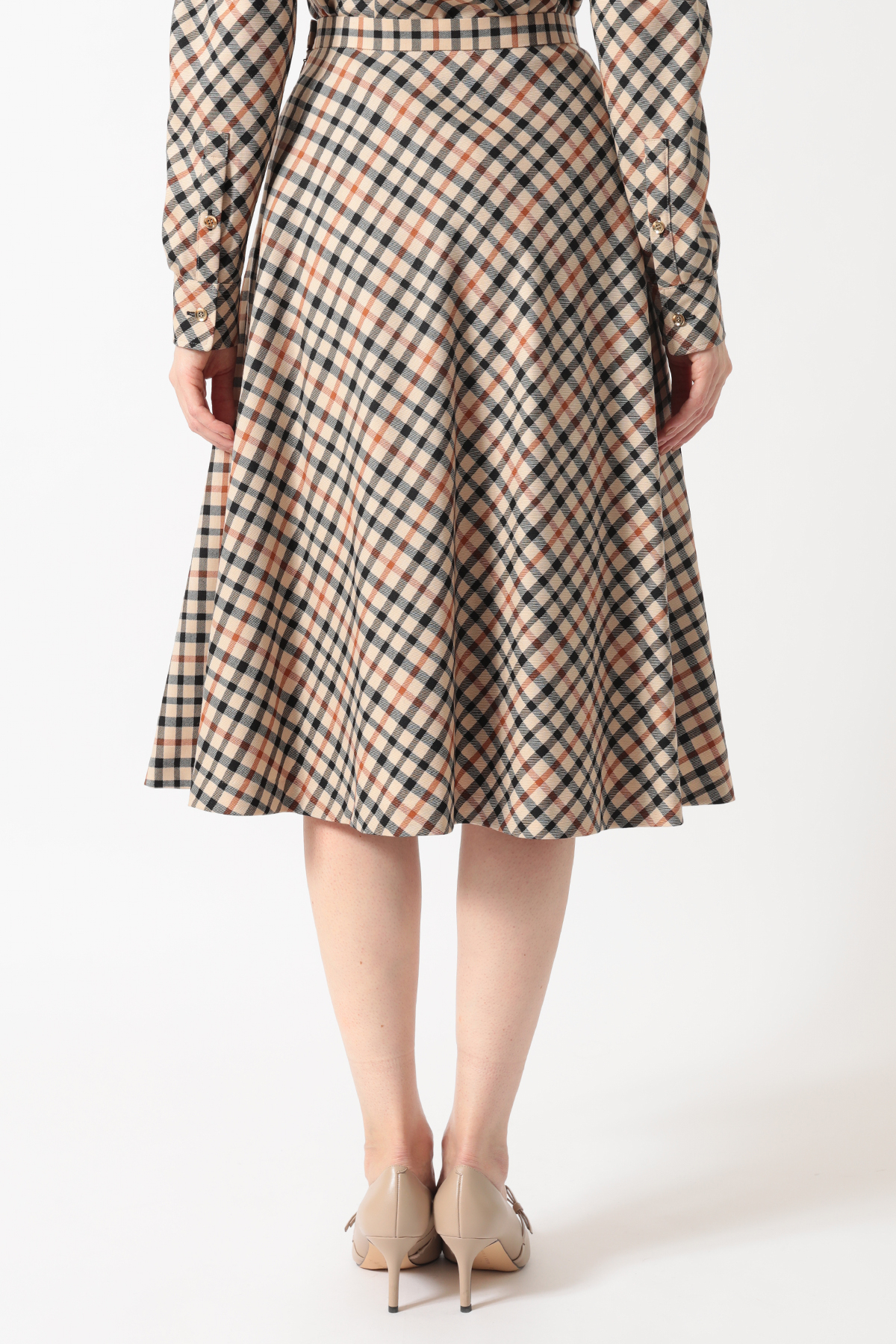 ソフトでなめらかなハウスチェックをバイアス(斜め)に配置し、素材の美しい落ち感を最大限に活かしたフレアスカートです。身体に優しく馴染むラインを表現し、バイアス使いによってナチュラルなストレッチ感も兼ね備えています。DAKSならではの上品さと快適な着心地で、どんなトップスとも相性が良く、幅広いシーンで活躍する一枚です。
