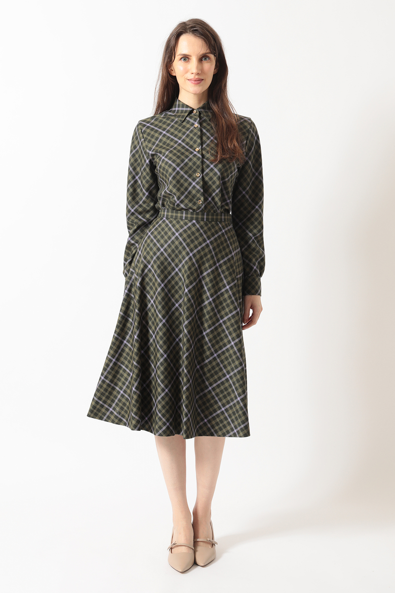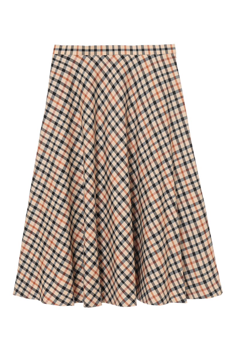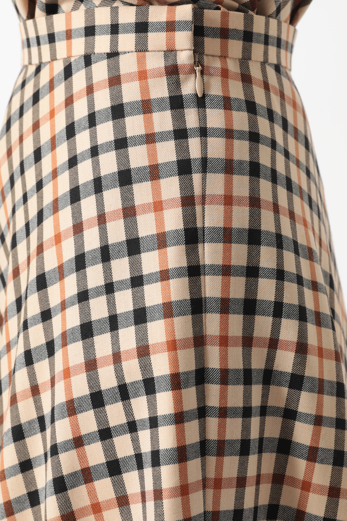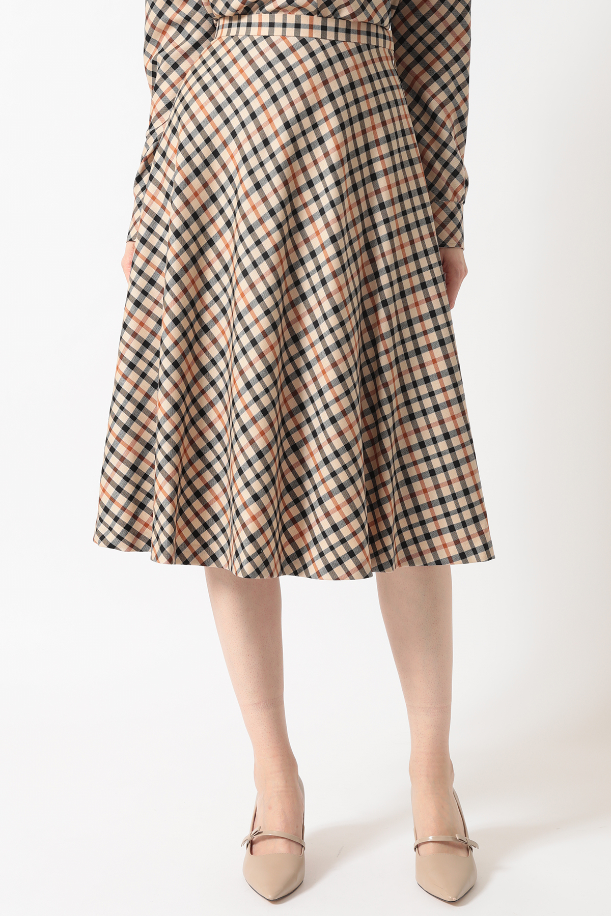 ソフトでなめらかなハウスチェックをバイアス(斜め)に配置し、素材の美しい落ち感を最大限に活かしたフレアスカートです。身体に優しく馴染むラインを表現し、バイアス使いによってナチュラルなストレッチ感も兼ね備えています。DAKSならではの上品さと快適な着心地で、どんなトップスとも相性が良く、幅広いシーンで活躍する一枚です。