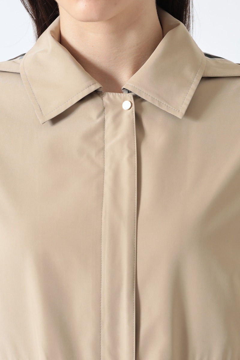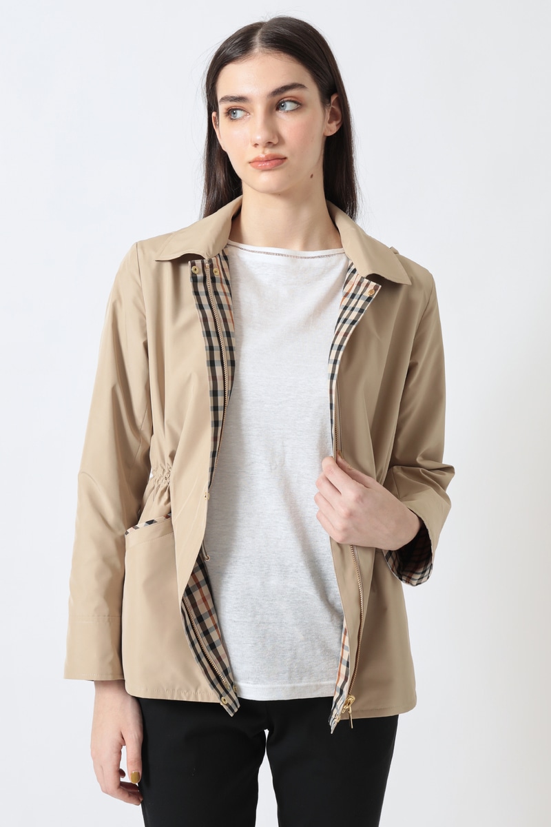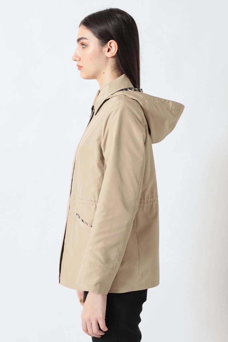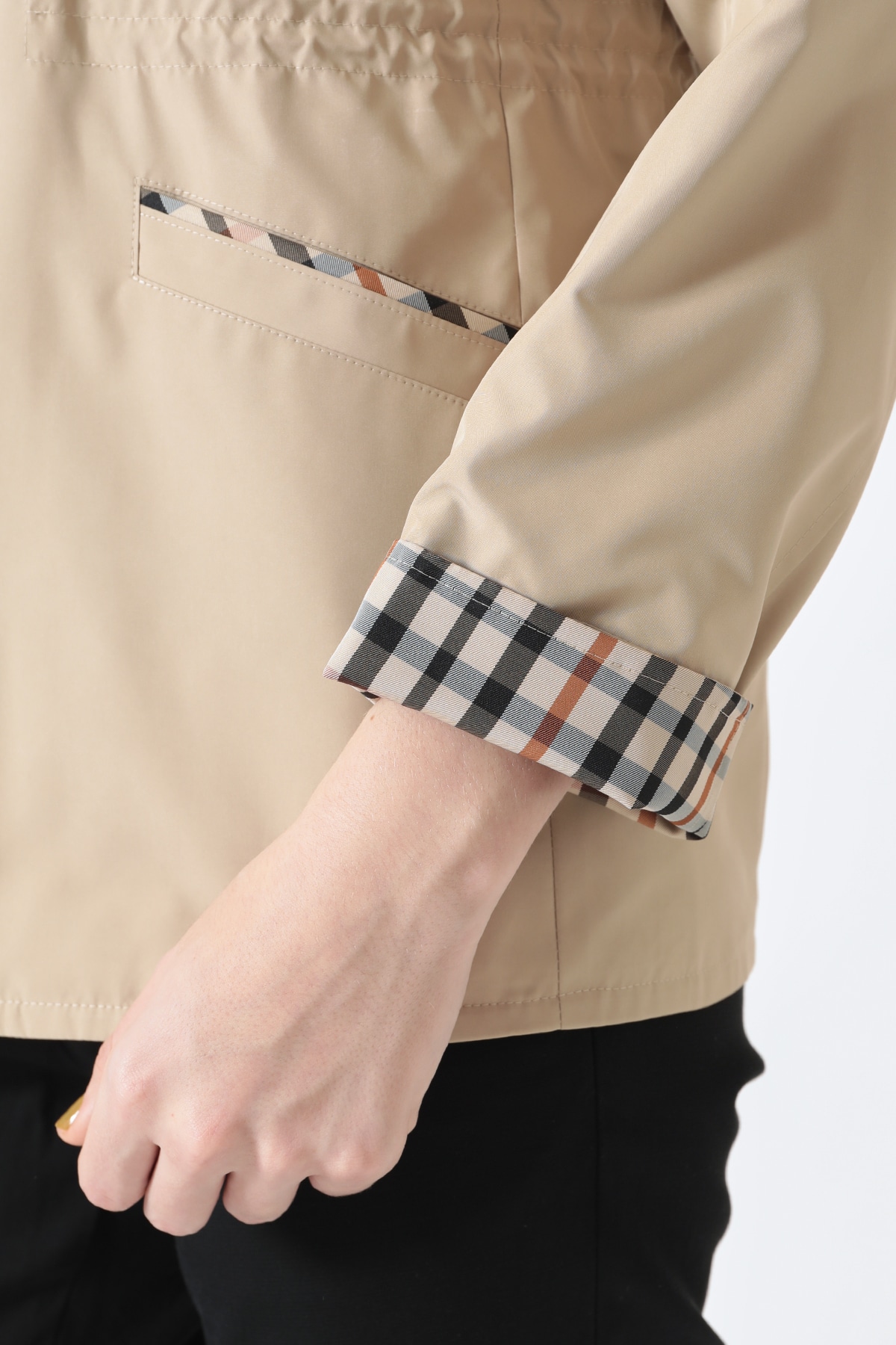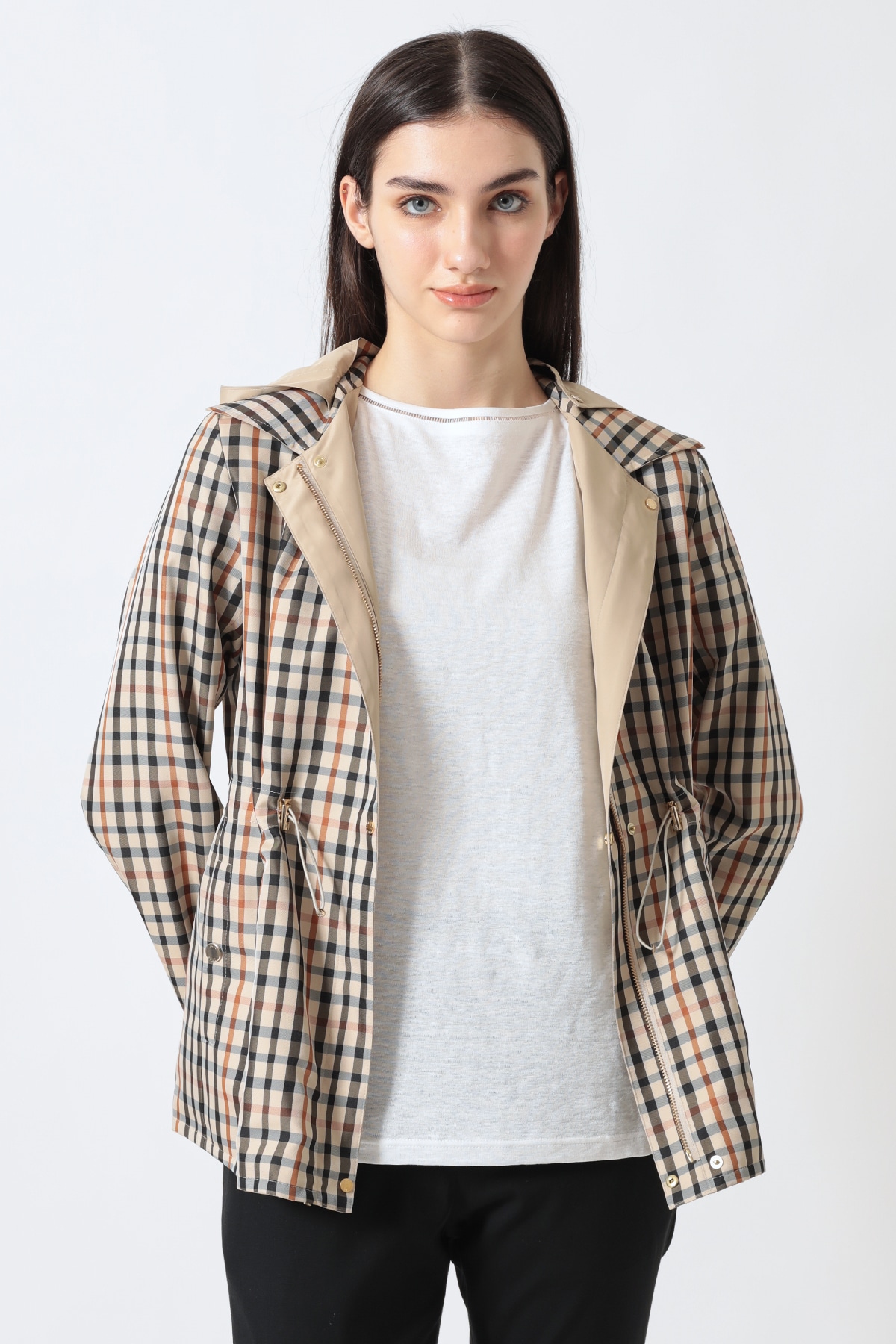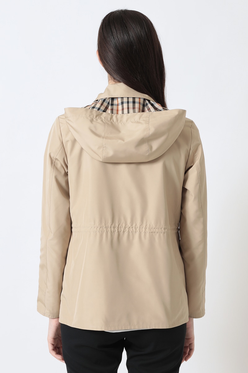 表側に撥水タフタ、裏側にハウスチェックを配したリバーシブル仕様のブルゾン。着脱可能なフードとウエストのドローストリングでシルエットを変えられ、カジュアルからきれいめまで幅広く活躍します。