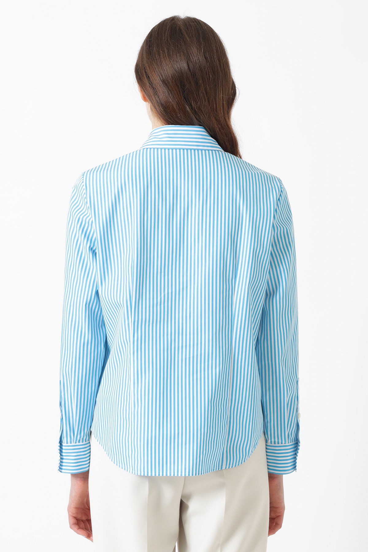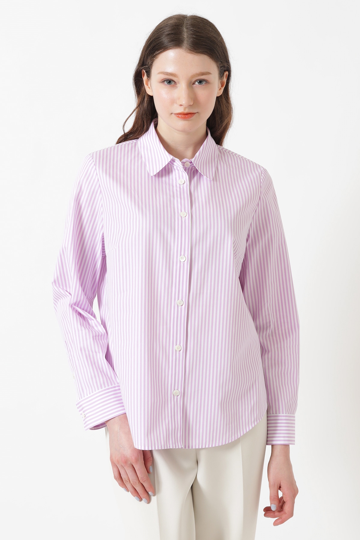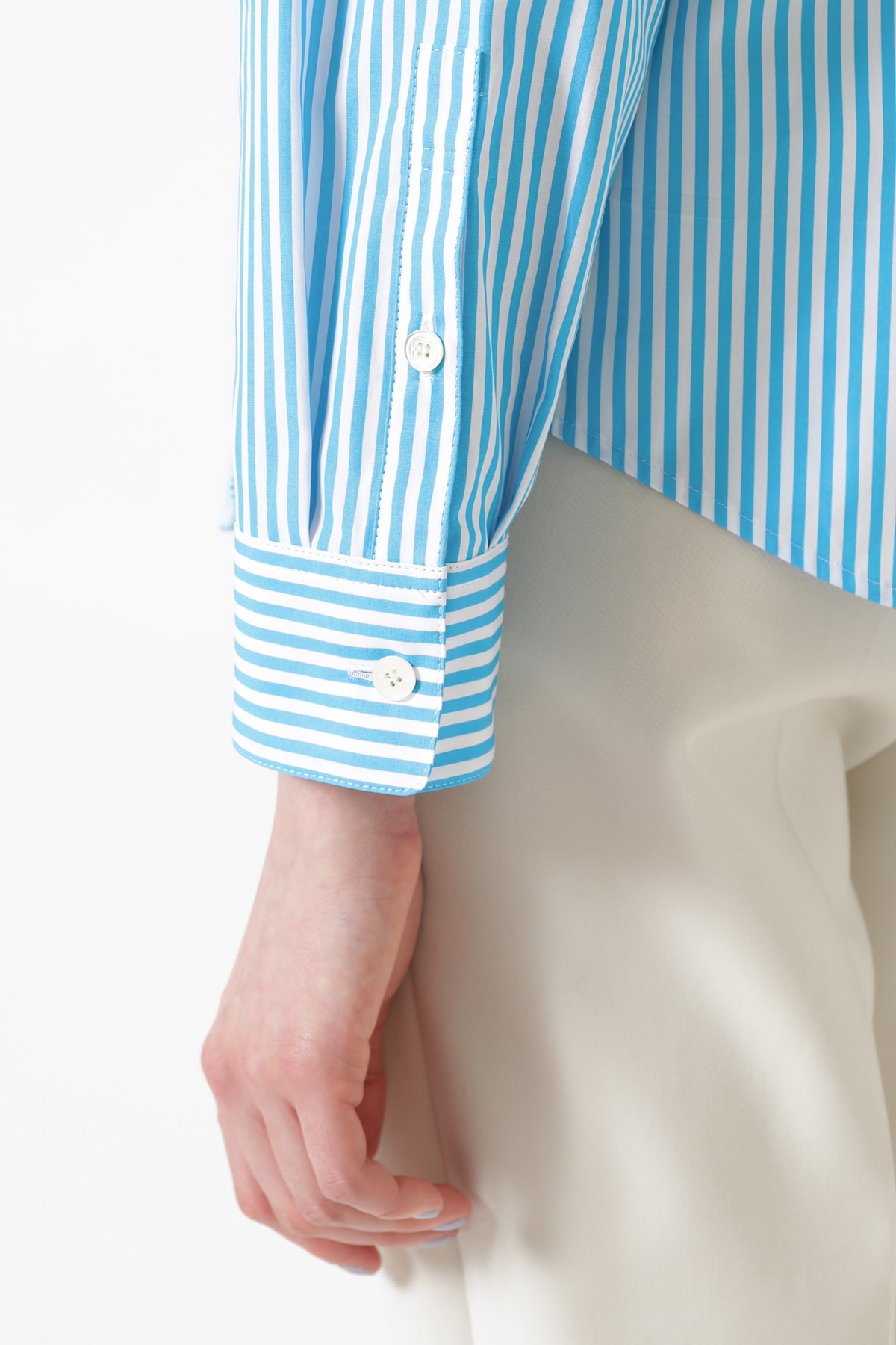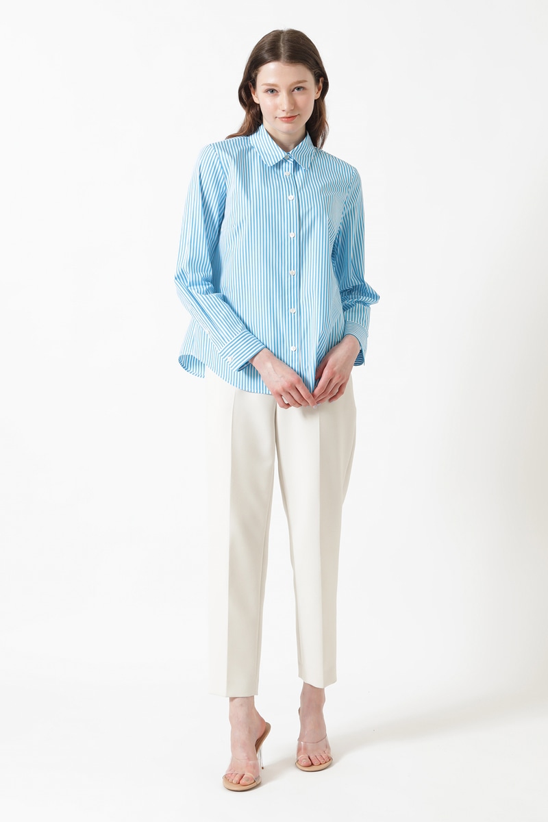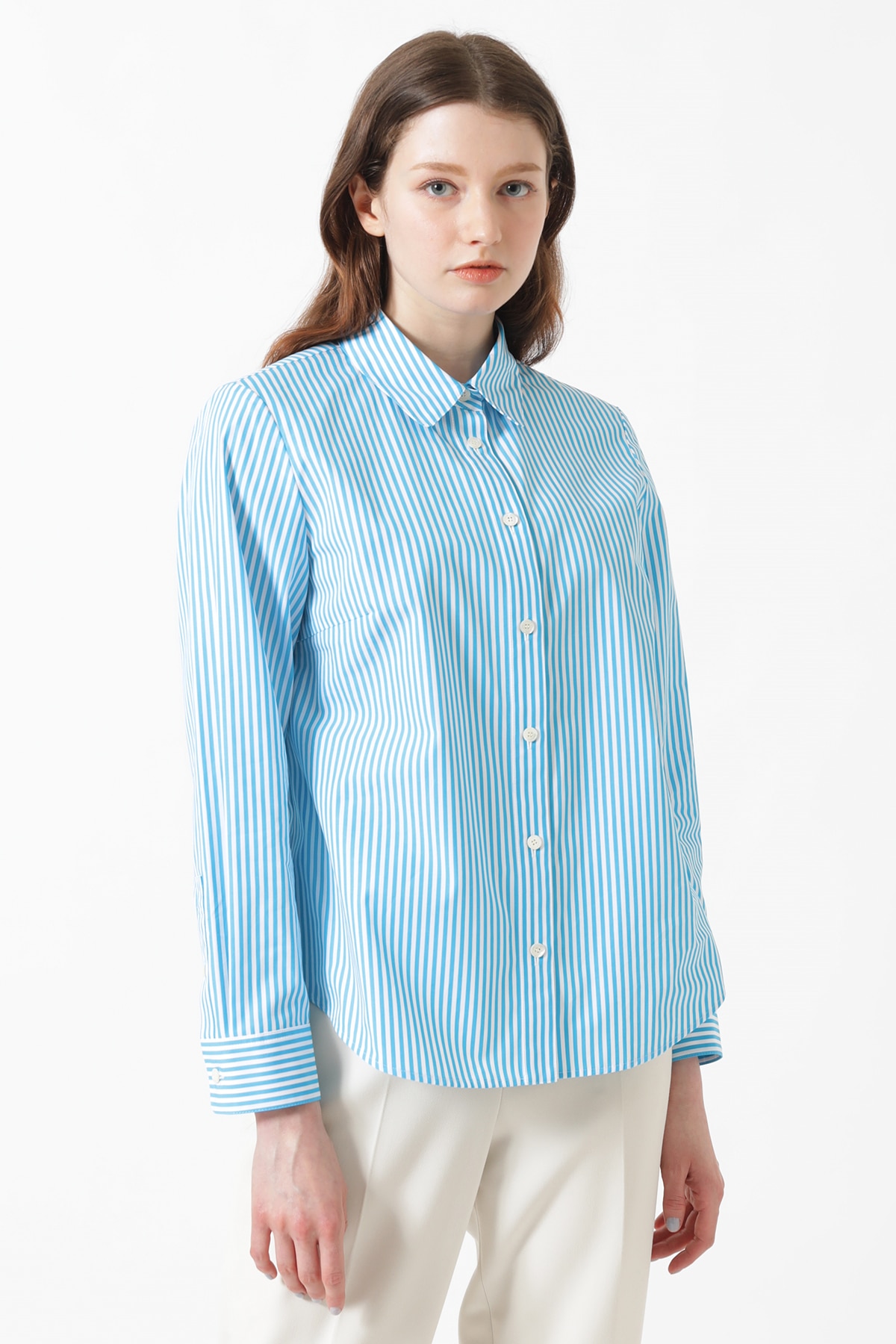 60番手の糸で織り上げた上質なベンガルストライプ素材を使用した、ベーシックかつ洗練されたブラウスです。滑らかでソフトな肌触りに仕上げており、羽織りとしても活躍する軽やかさが魅力。ややゆとりを持たせたリラックスシルエットながら、第一ボタンを開けた際にデコルテが最も美しく見えるよう計算された襟元のカッティングがポイントです。一枚での着用はもちろん、ジャケットのインナーとしても映える、大人のデイリースタイルに欠かせない一着です。