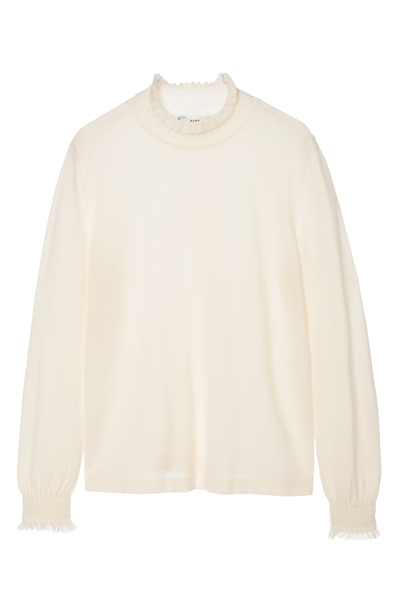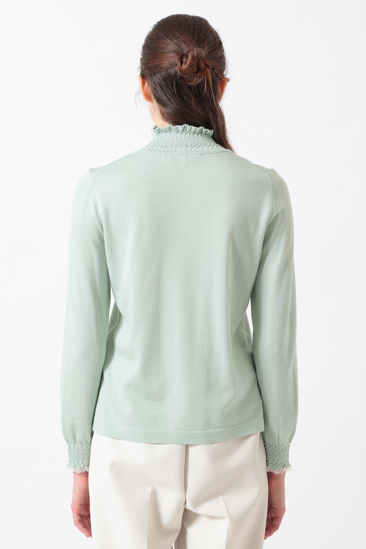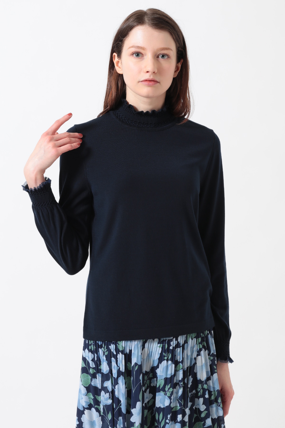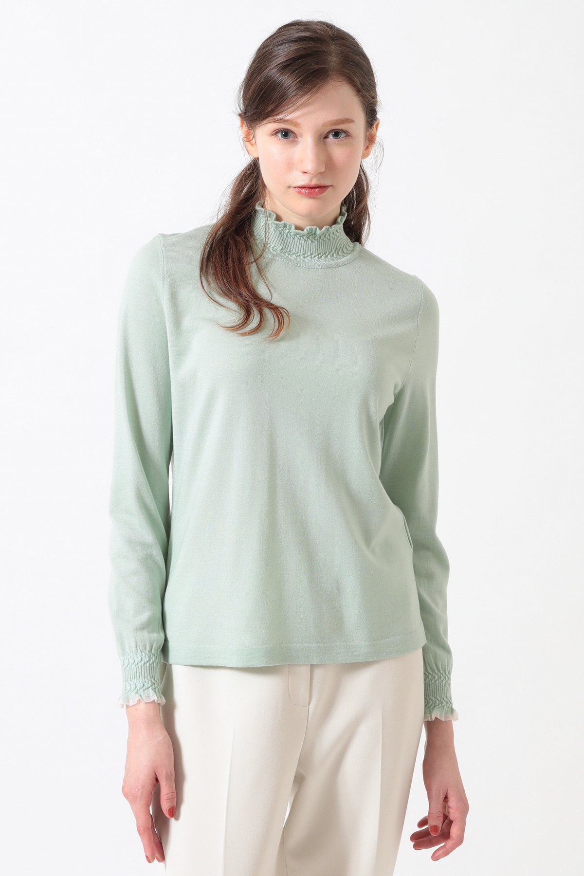 衿元と袖口のミニフリルが華やかなハイネックプルオーバー。同素材のカーディガンとのアンサンブルや、ニットジャケットのインナーとして合わせると襟元のフリルがアクセントとなり上品な女性らしさを演出します。