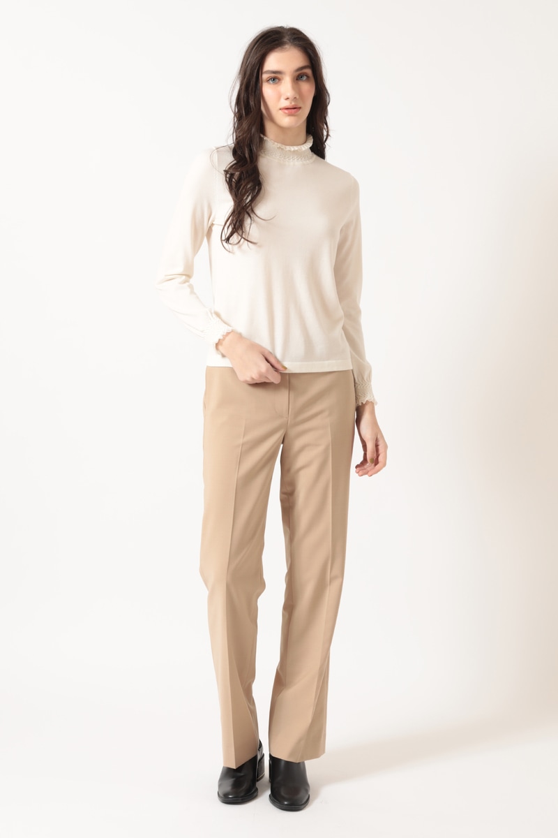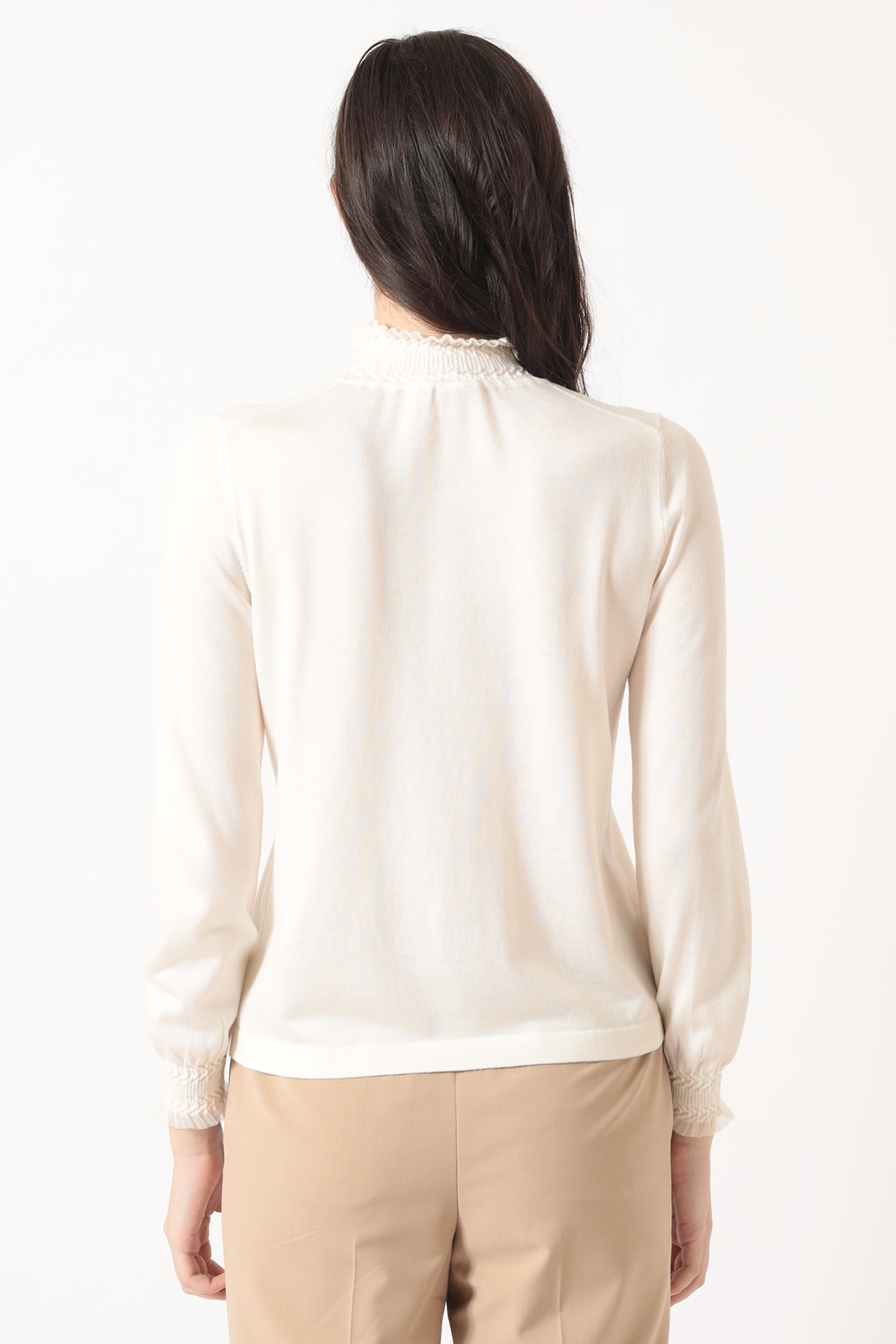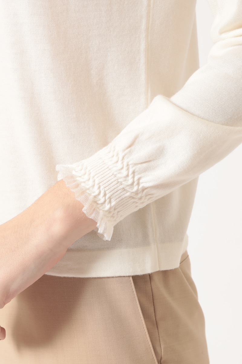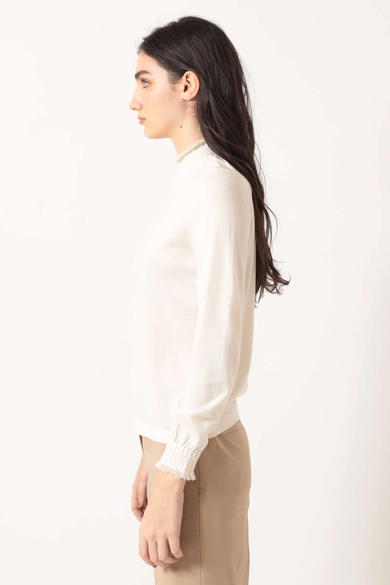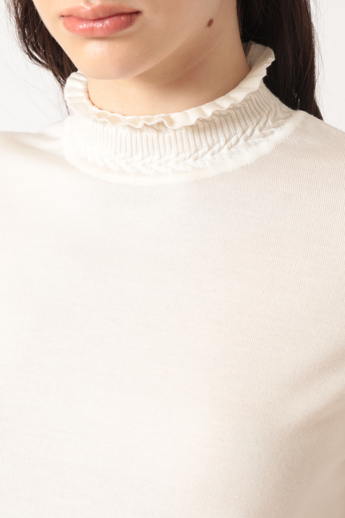 衿元と袖口のミニフリルが華やかなハイネックプルオーバー。同素材のカーディガンとのアンサンブルや、ニットジャケットのインナーとして合わせると襟元のフリルがアクセントとなり上品な女性らしさを演出します。