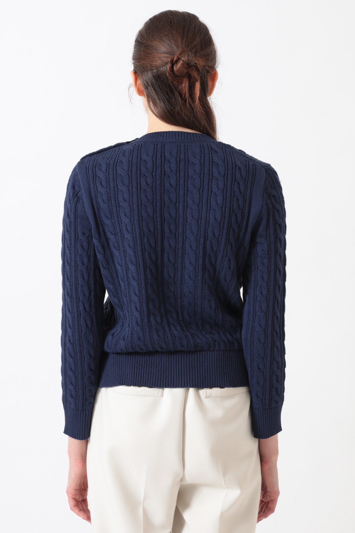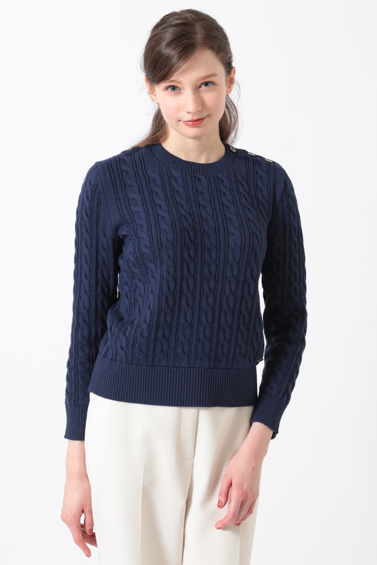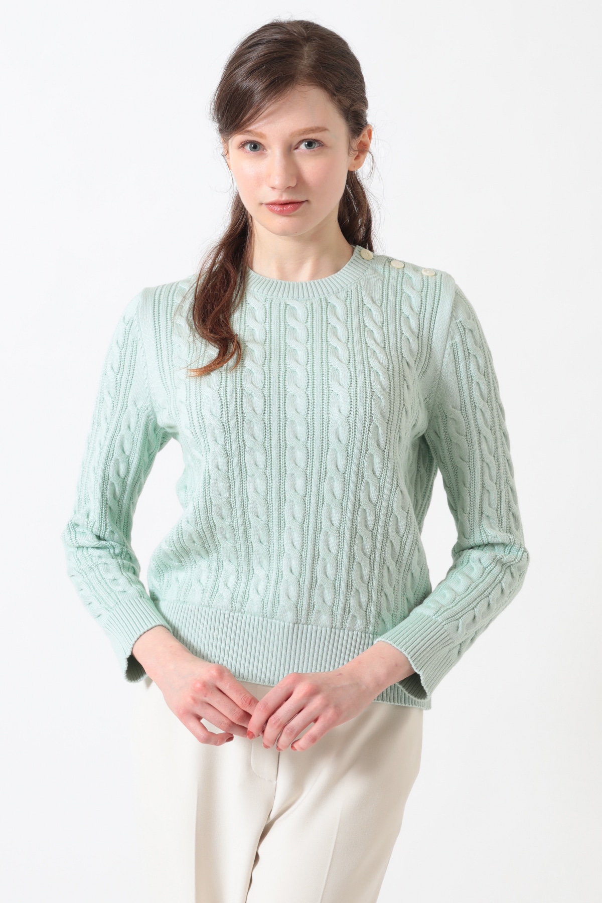 昨年好評のケーブルニットを編地アップデートして復刻したプルオーバー。肩のゴールド釦がアクセントになり、柔らかな色合いで春先のカジュアルスタイルに最適。着心地の良さと品の良さを両立します。