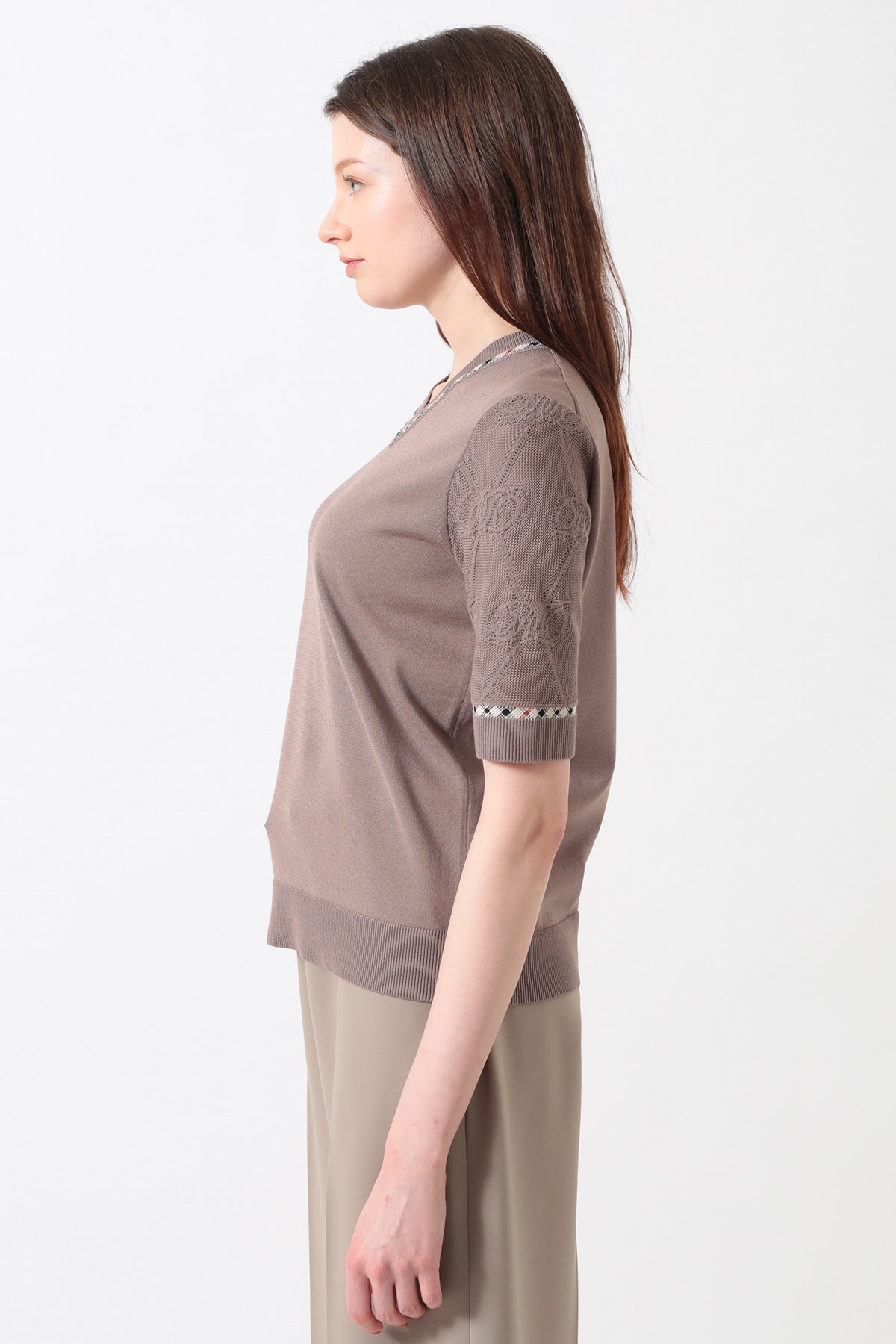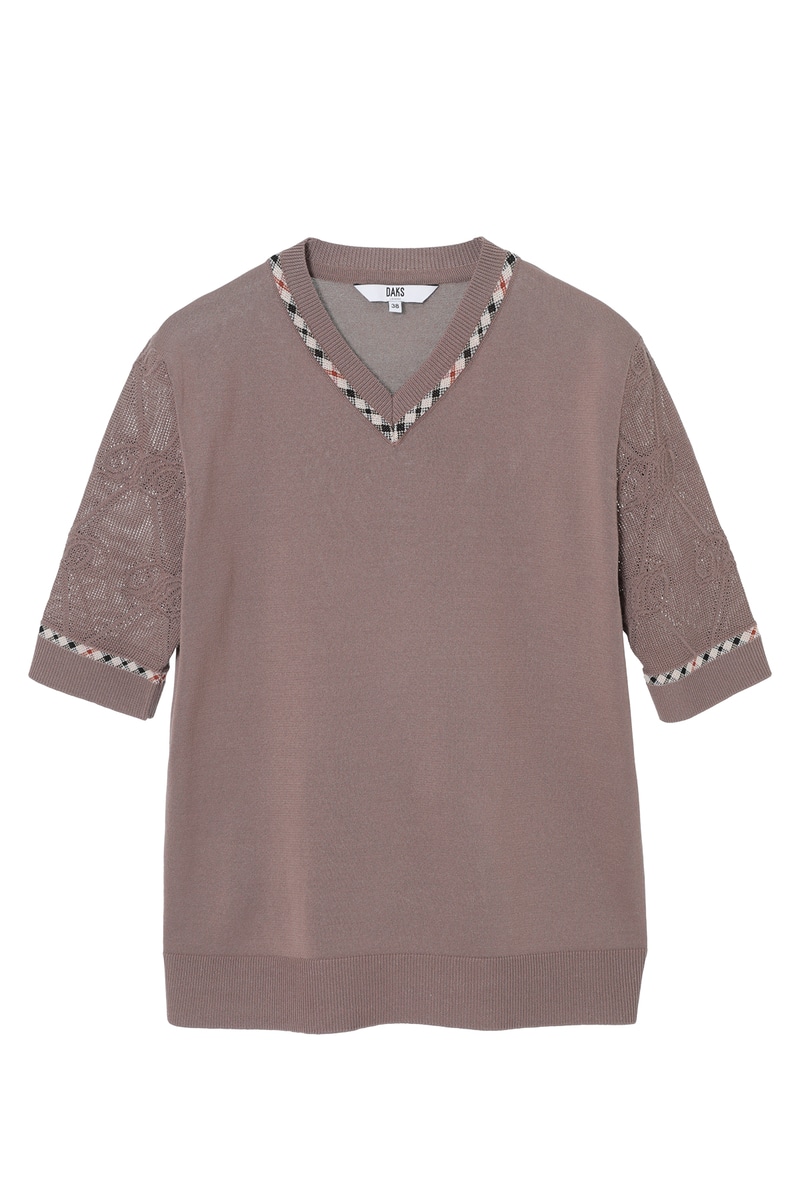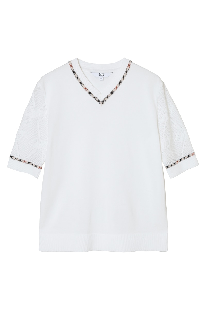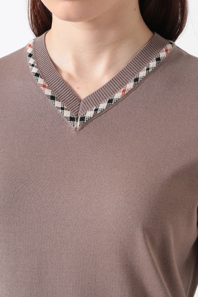 毎年ご好評をいただいている、袖部分にロゴメッシュ編みを施した独創的なデザインのVネックプルオーバー。身頃は肌馴染みの良い天竺編みで仕上げ、スポーティーな透け感のある袖のロゴ編みが、スタイリングにモダンなアクセントを添えてくれます。襟ぐりにはさりげなくハウスチェックのジャカード編みを配し、細部にまでブランドのアイデンティティを散りばめました。デコルテを美しく見せるVネックラインと、軽やかでソフトな着心地が、日常のコーディネートを品よく華やかにアップデートしてくれます。