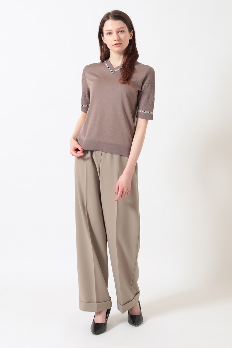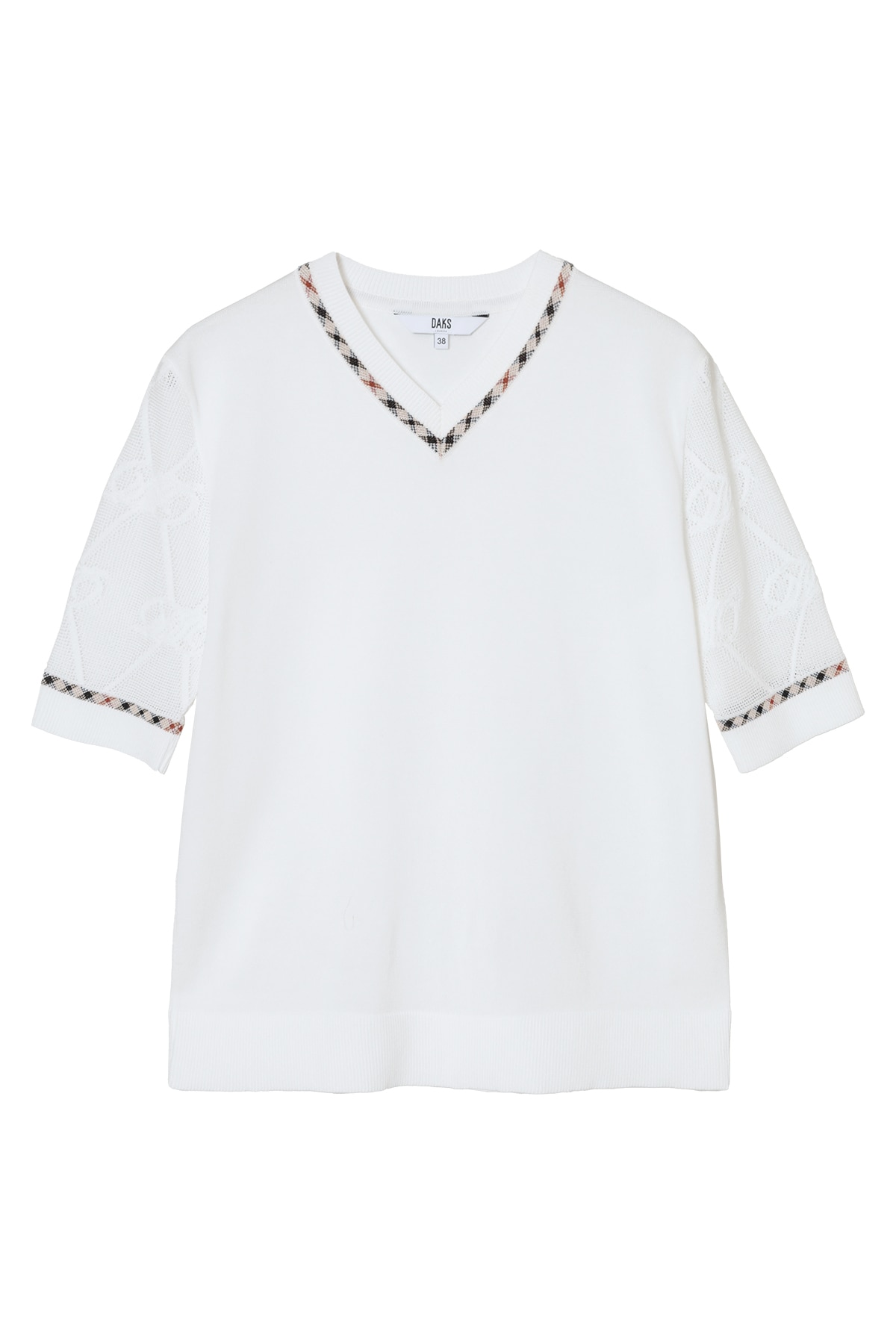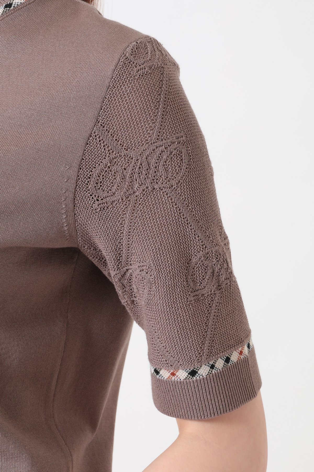 毎年ご好評をいただいている、袖部分にロゴメッシュ編みを施した独創的なデザインのVネックプルオーバー。身頃は肌馴染みの良い天竺編みで仕上げ、スポーティーな透け感のある袖のロゴ編みが、スタイリングにモダンなアクセントを添えてくれます。襟ぐりにはさりげなくハウスチェックのジャカード編みを配し、細部にまでブランドのアイデンティティを散りばめました。デコルテを美しく見せるVネックラインと、軽やかでソフトな着心地が、日常のコーディネートを品よく華やかにアップデートしてくれます。