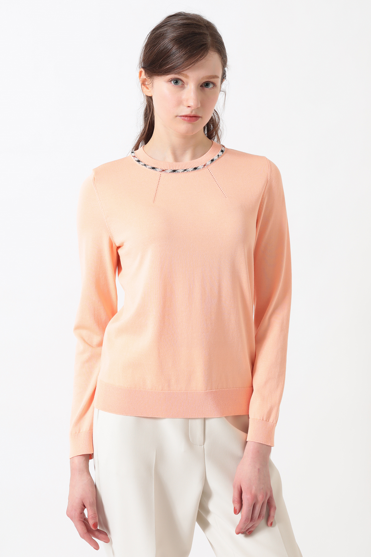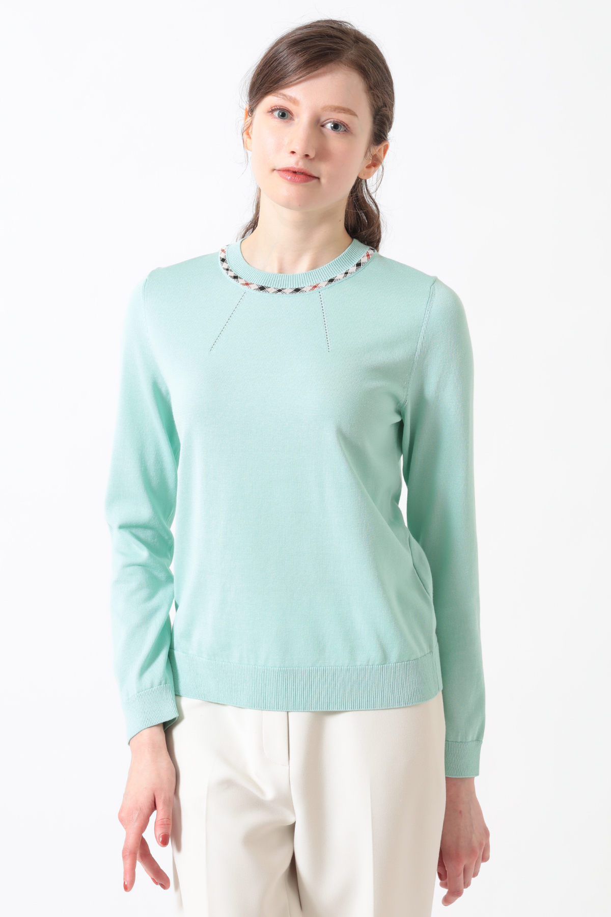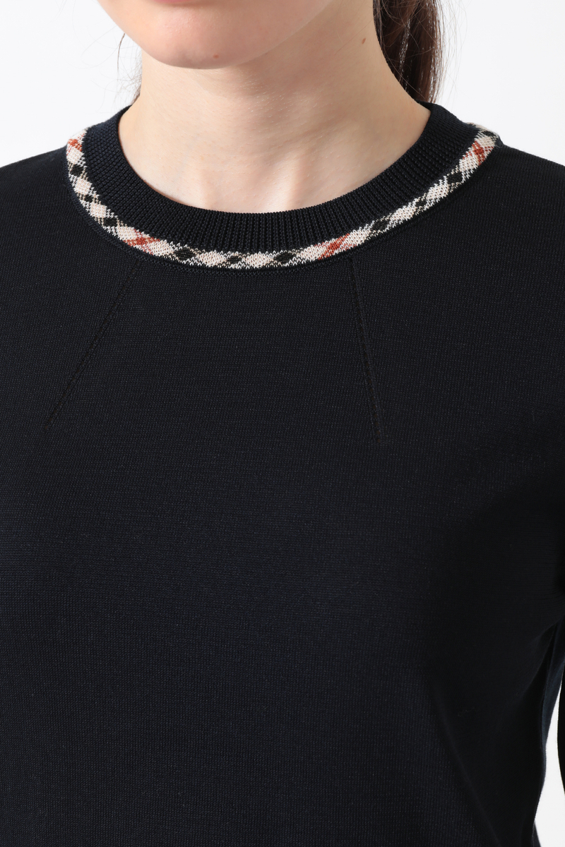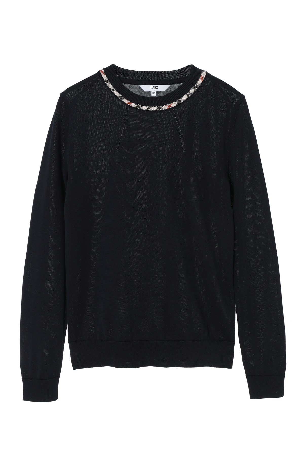 ハウスチェックのジャカード柄がアクセントを添える、洗練されたプルオーバーです。今季は春から初夏まで快適に過ごせるよう、綿・ポリエステルの混紡素材を採用。襟ぐりに入れたアイレットの柄編みが、お顔周りを華やかに、かつ涼やかに演出します。シンプルながらもニット特有のテクニックが光る、DAKSらしい品格と快適さを兼ね備えたアイテムです。