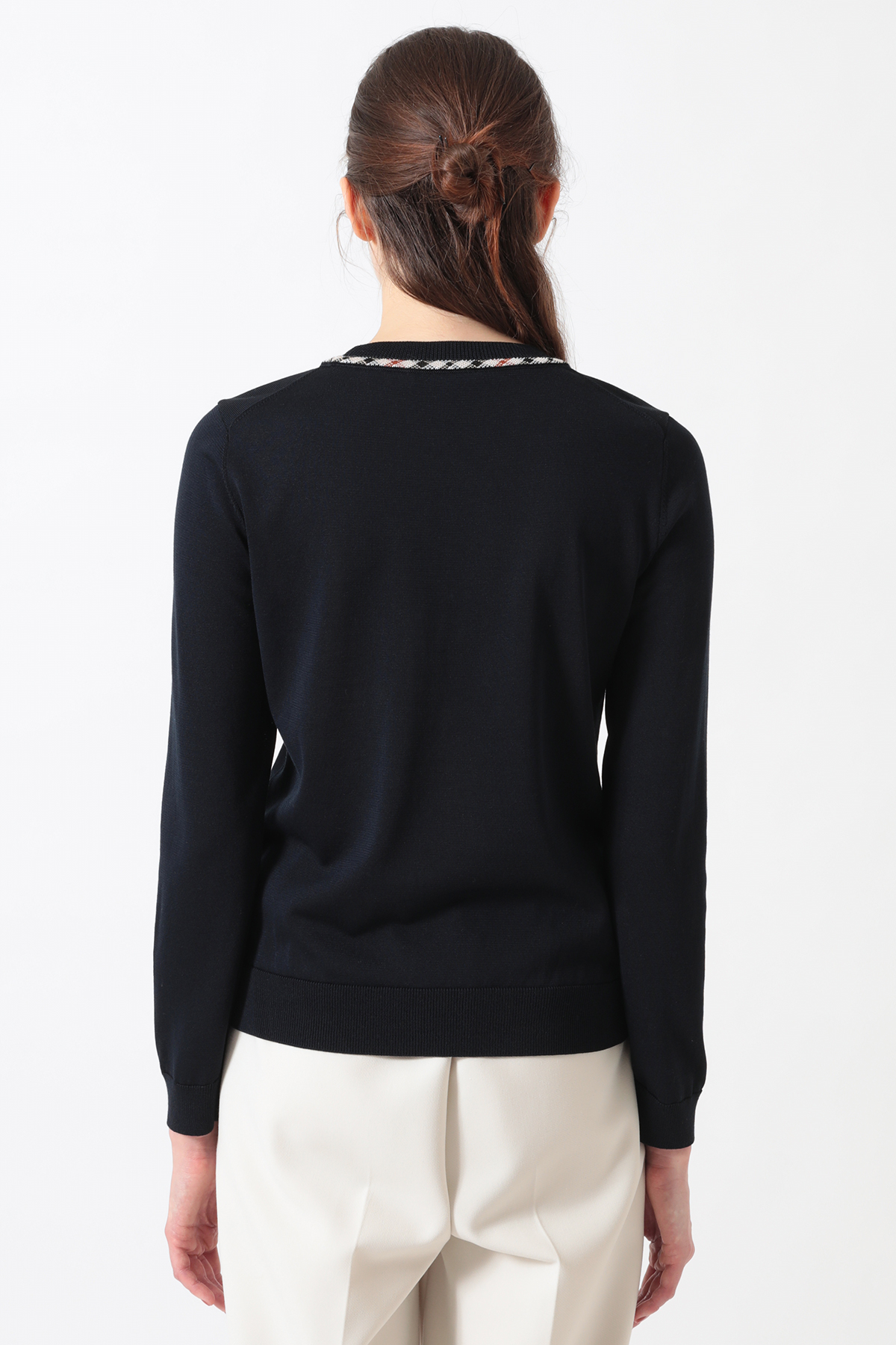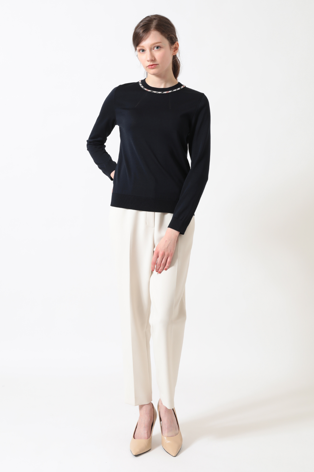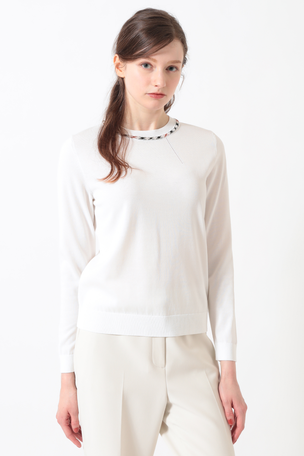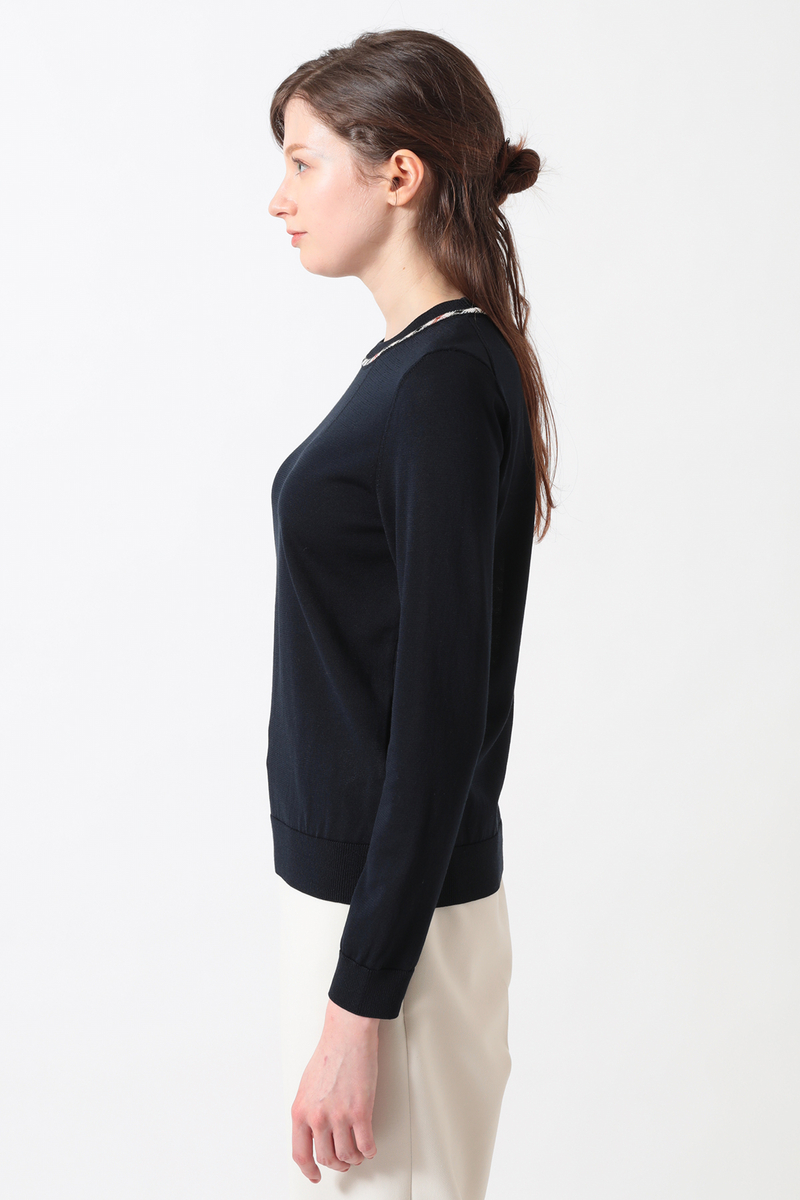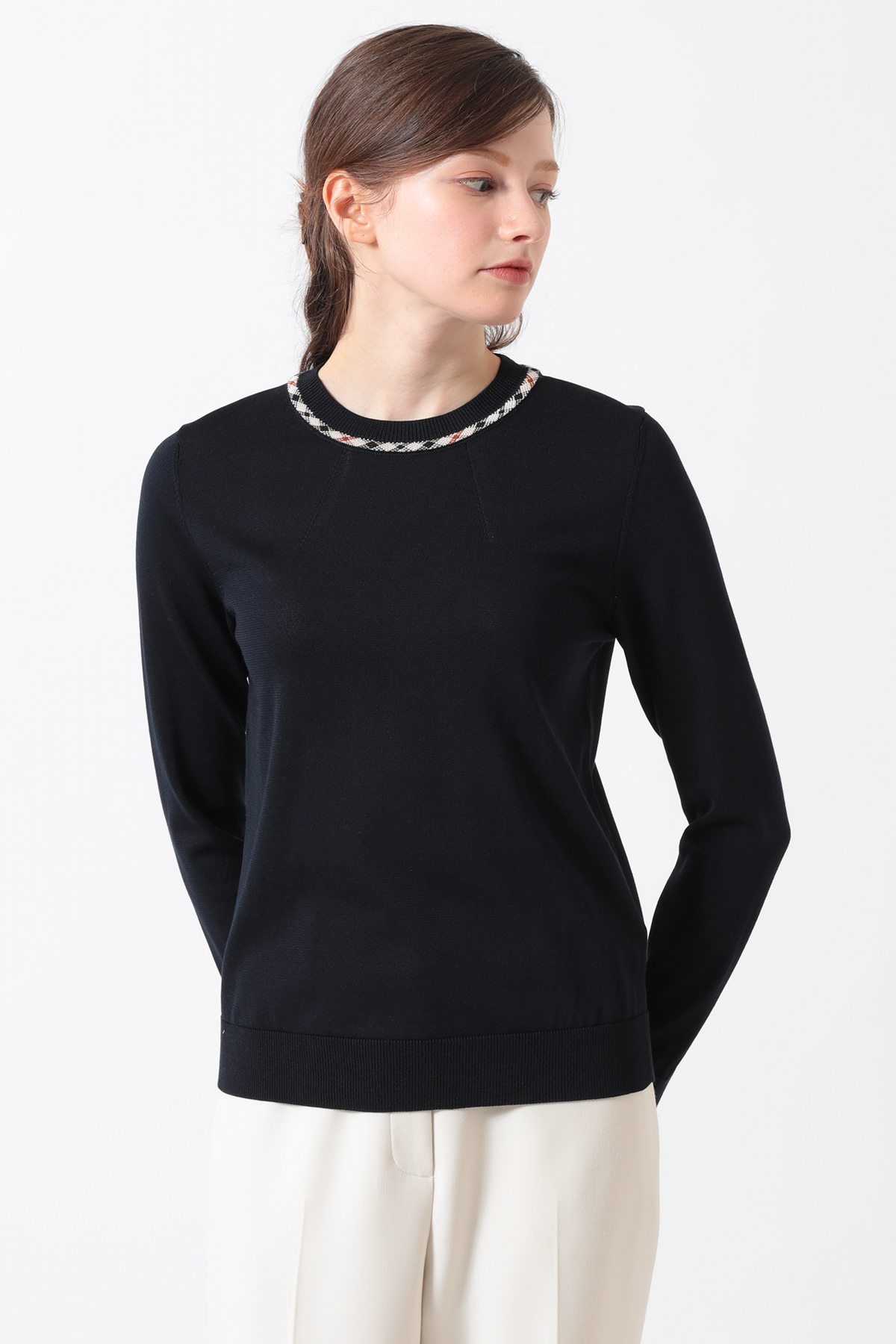 ハウスチェックのジャカード柄がアクセントを添える、洗練されたプルオーバーです。今季は春から初夏まで快適に過ごせるよう、綿・ポリエステルの混紡素材を採用。襟ぐりに入れたアイレットの柄編みが、お顔周りを華やかに、かつ涼やかに演出します。シンプルながらもニット特有のテクニックが光る、DAKSらしい品格と快適さを兼ね備えたアイテムです。