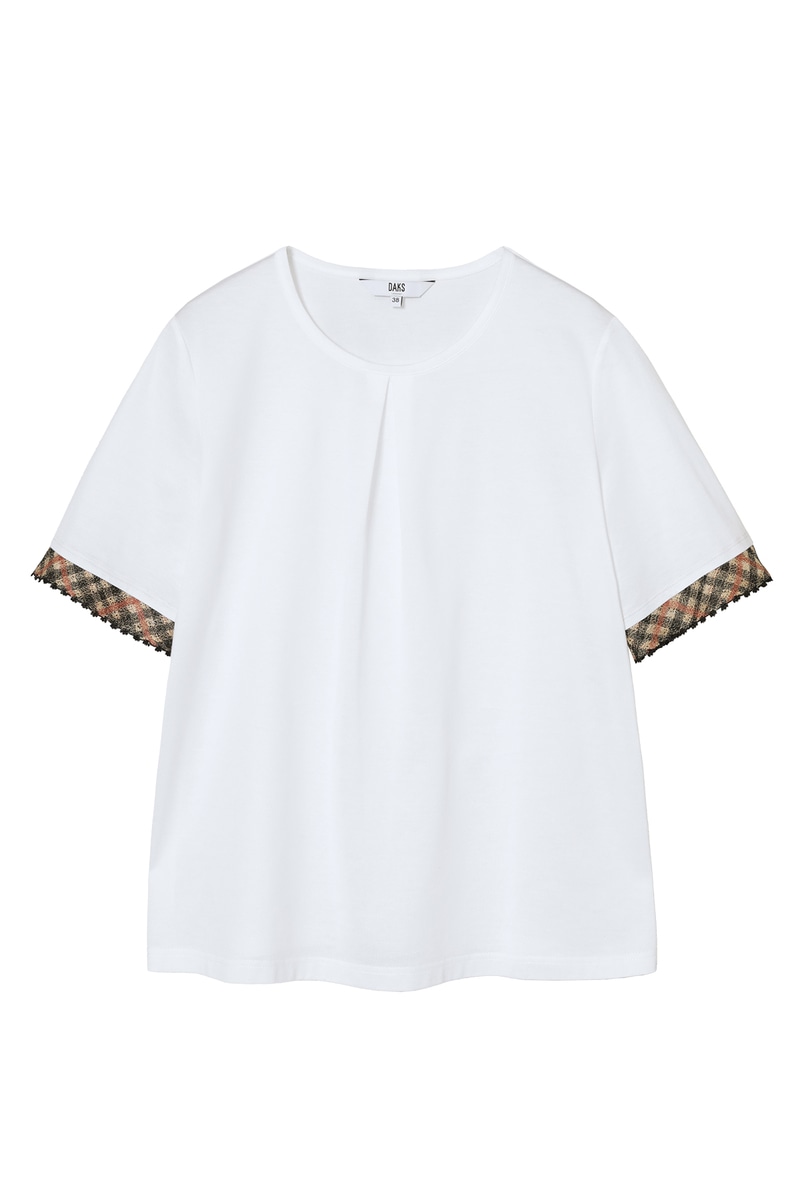一見シンプルながら、袖口にメッシュディテールと刺繍で表現したハウスチェックを施した、技ありのカットソーです。今のムードを反映した軽やかな透け感が、手元を上品に演出します。カジュアルなデニムスタイルから、ジャケットのインナーまで幅広く活躍する、DAKSのアイデンティティが詰まった一枚です。