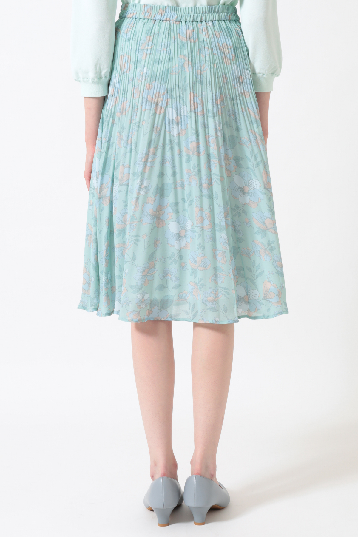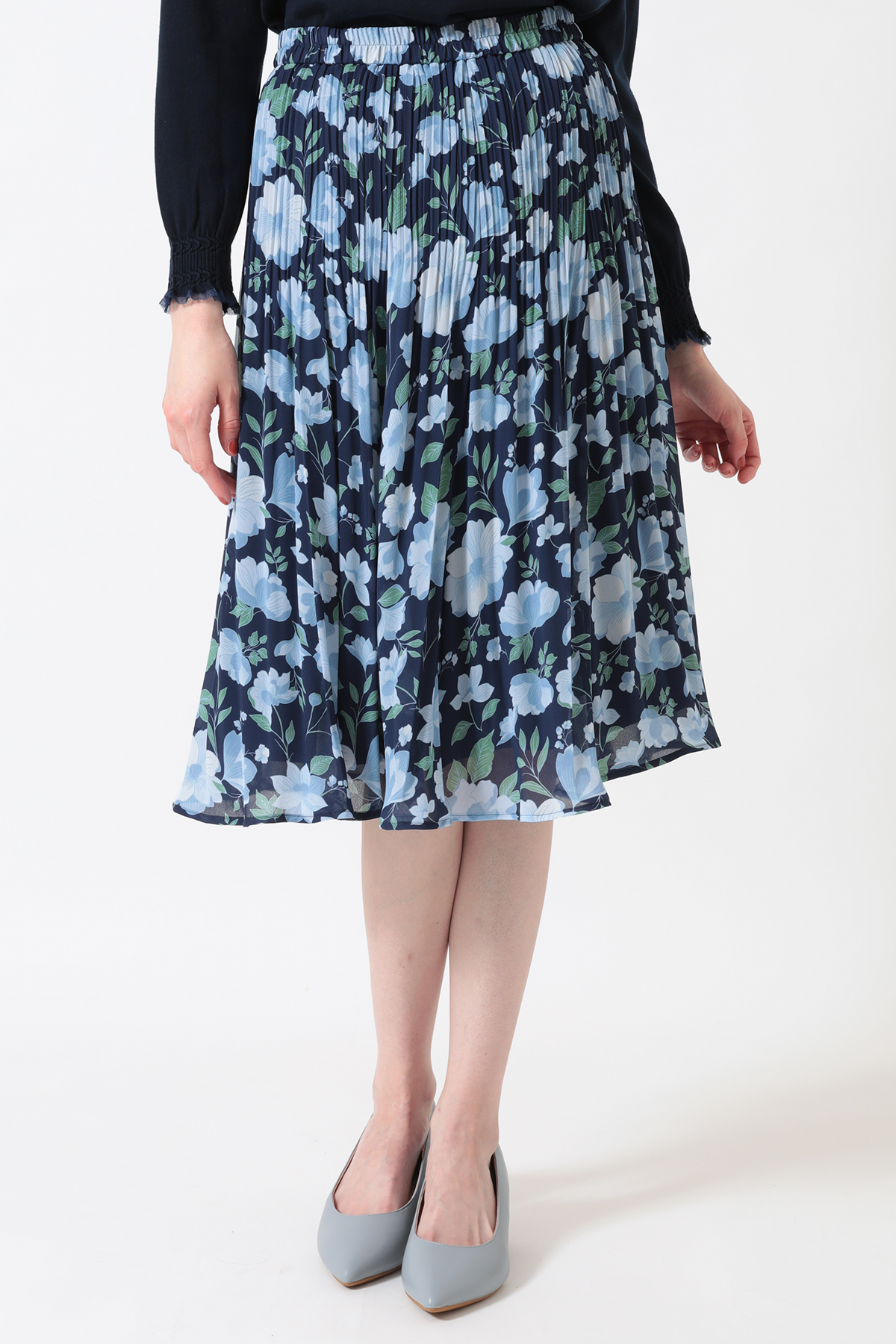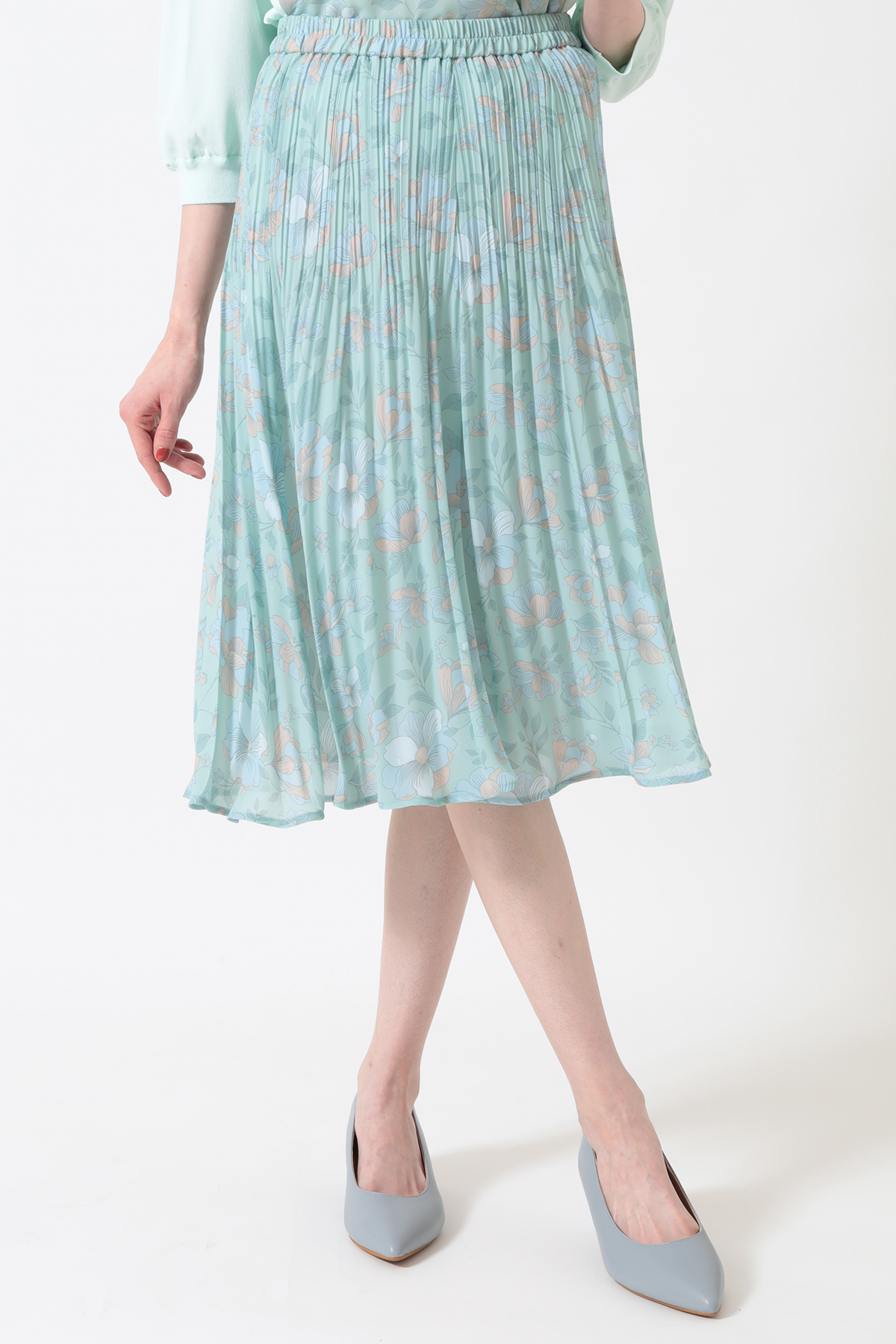 細幅と太幅のプリーツを組み合わせ、上部はすっきりと、裾にかけて緩やかに広がるAラインシルエットに仕上げたプリーツスカート。さらに矢羽状のプリーツを配することで、腰回りを自然にカバーしつつ美しいフレア感を実現しています。上品なフローラルプリントと相まって、歩くたびに動きのある表情を演出。