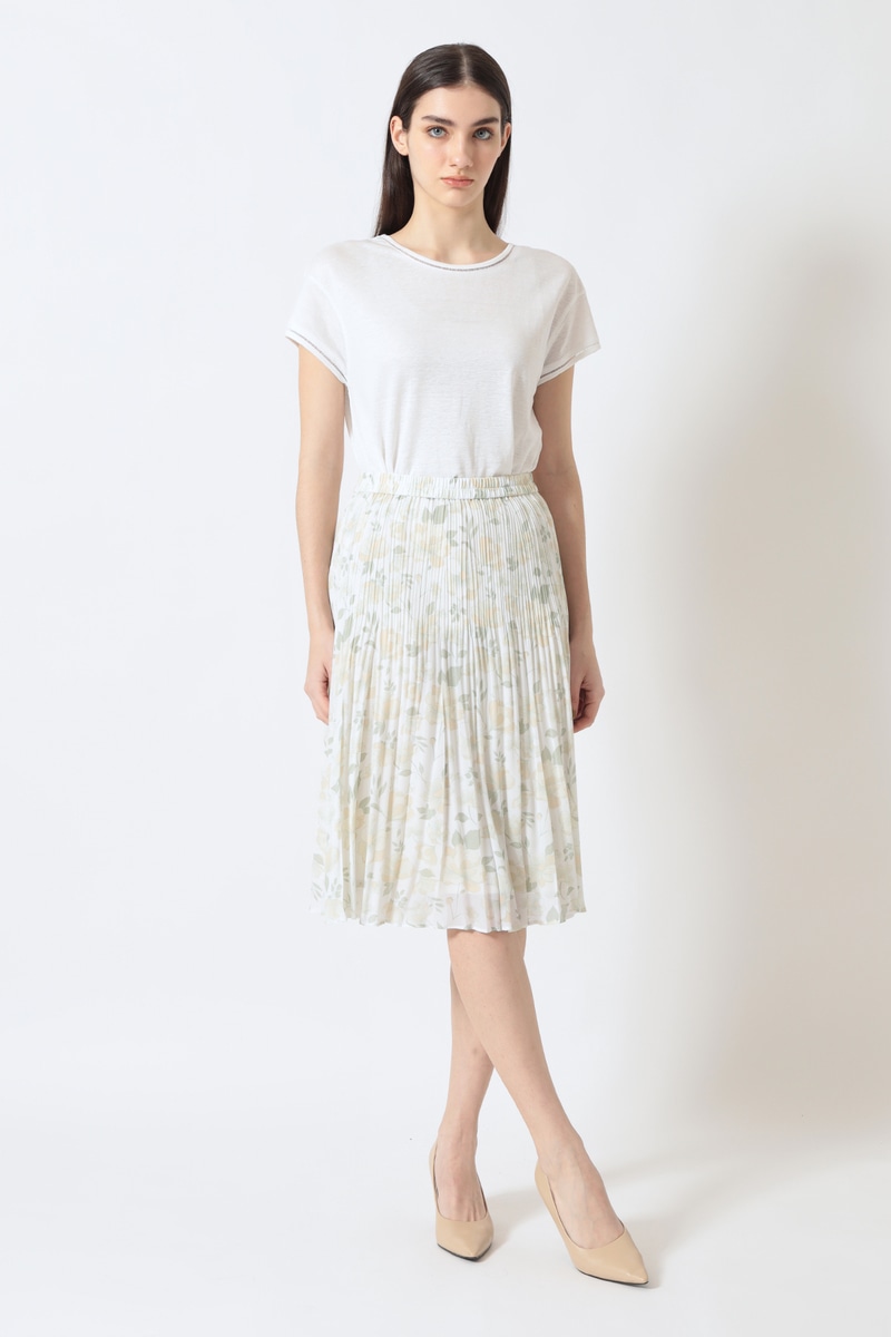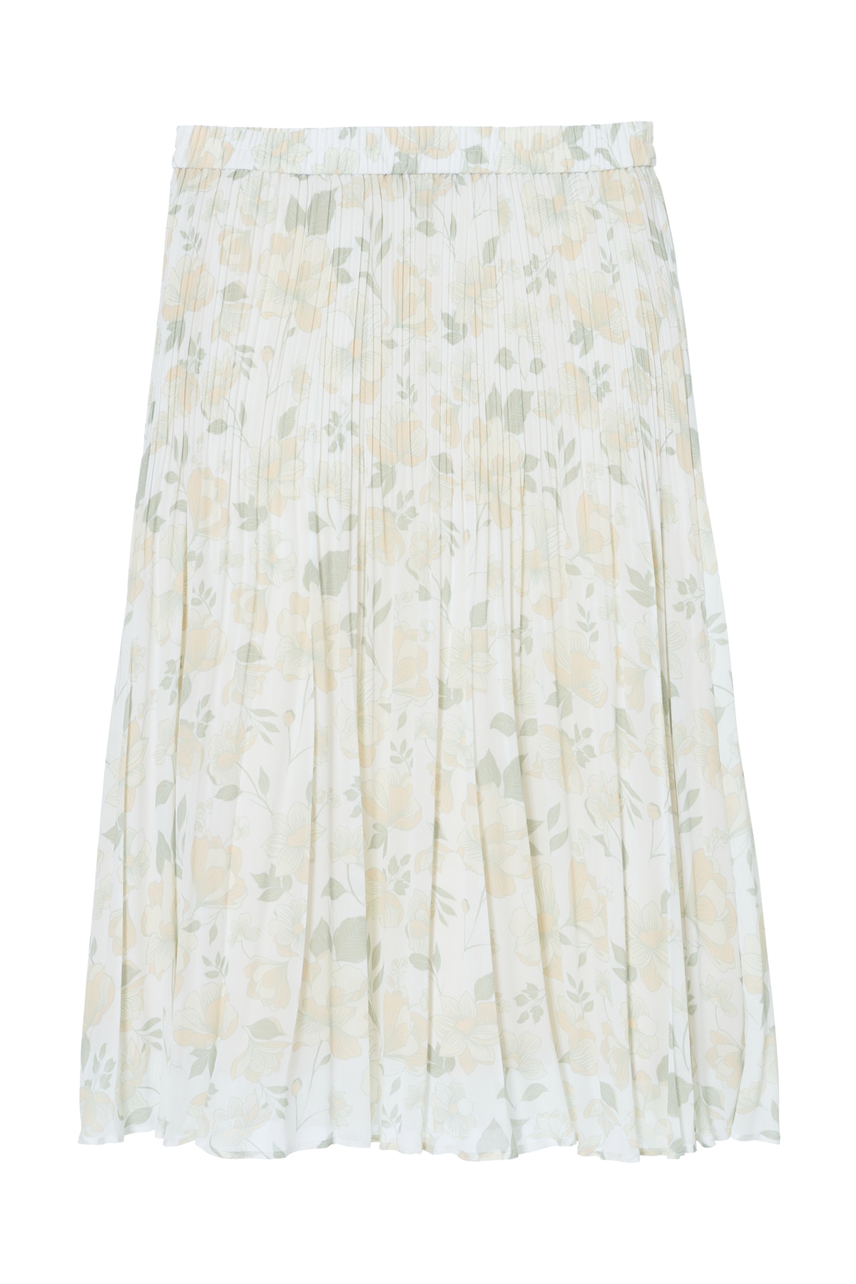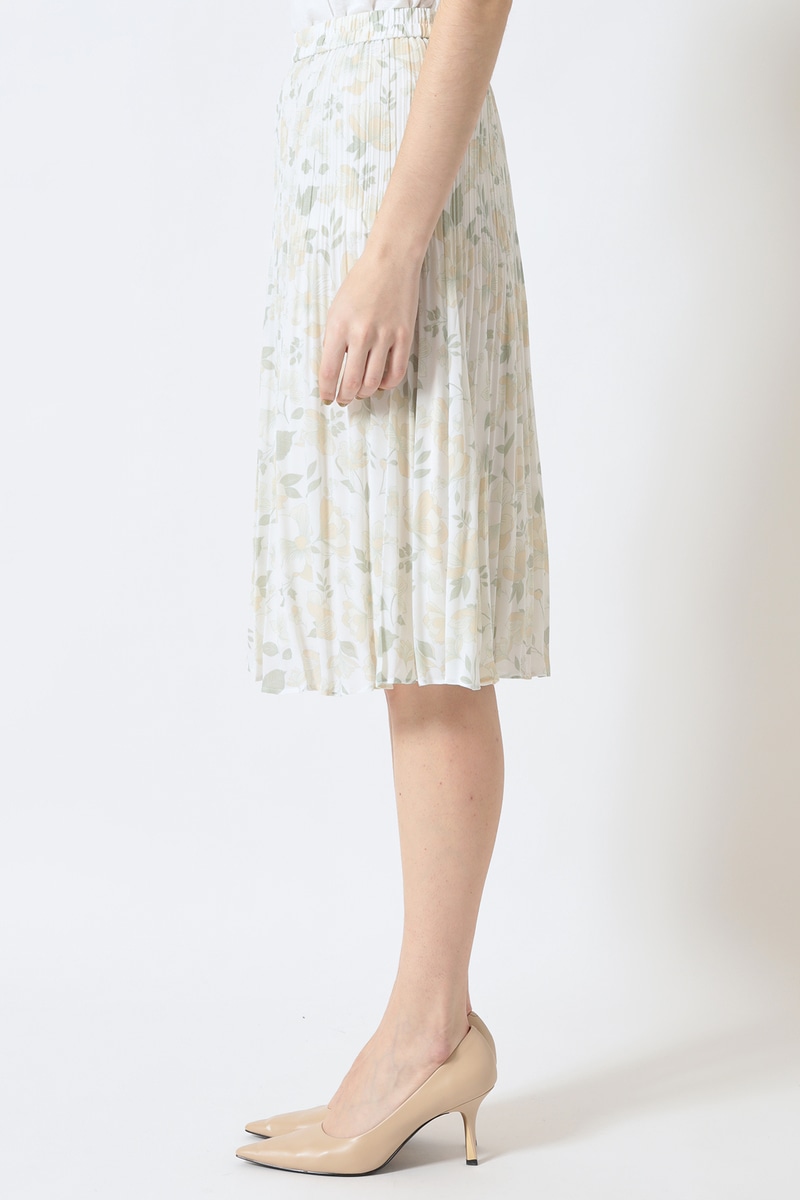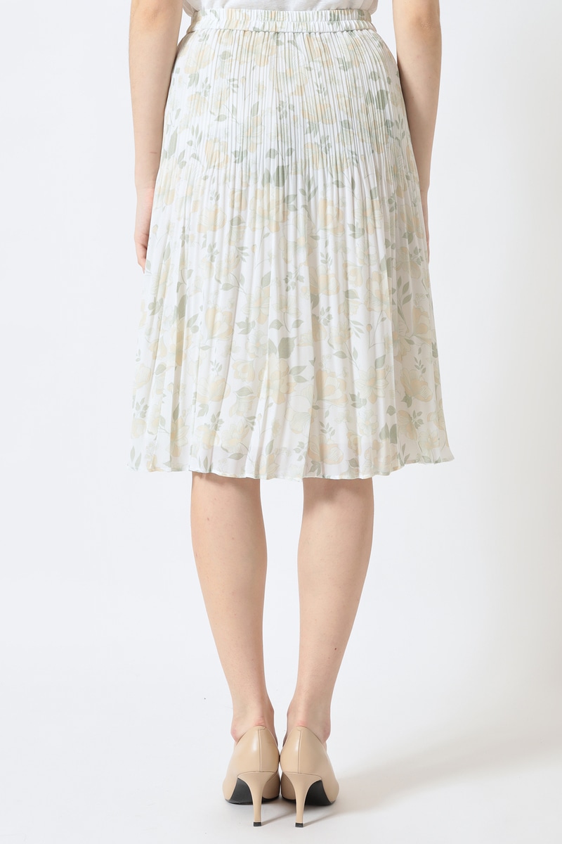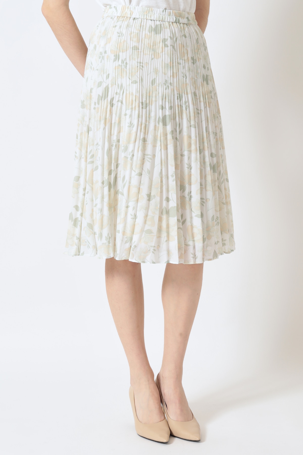細幅と太幅のプリーツを組み合わせ、上部はすっきりと、裾にかけて緩やかに広がるAラインシルエットに仕上げたプリーツスカート。さらに矢羽状のプリーツを配することで、腰回りを自然にカバーしつつ美しいフレア感を実現しています。上品なフローラルプリントと相まって、歩くたびに動きのある表情を演出。