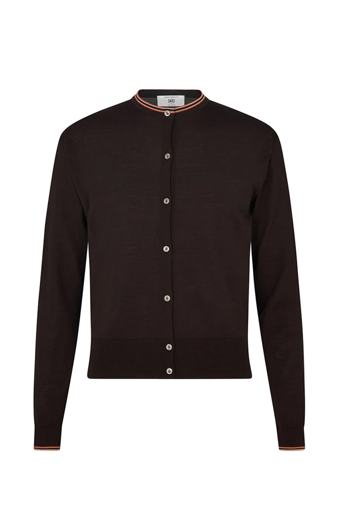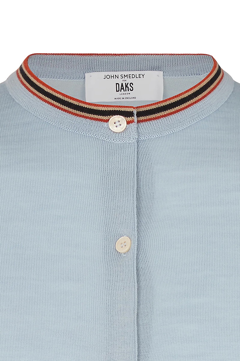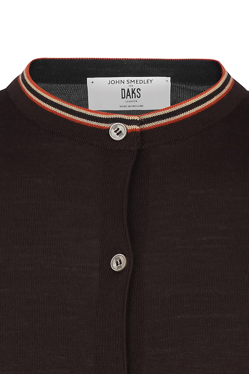 ジョン・スメドレーのエクストラファインメリノウールを英国で編み上げた滑らかなクルーネックカーディガン。ネックラインと袖口に配したDAKSハウスストライプがさりげないアクセントとなり、ビジネスから週末のレイヤードまで上品に対応する一枚です。