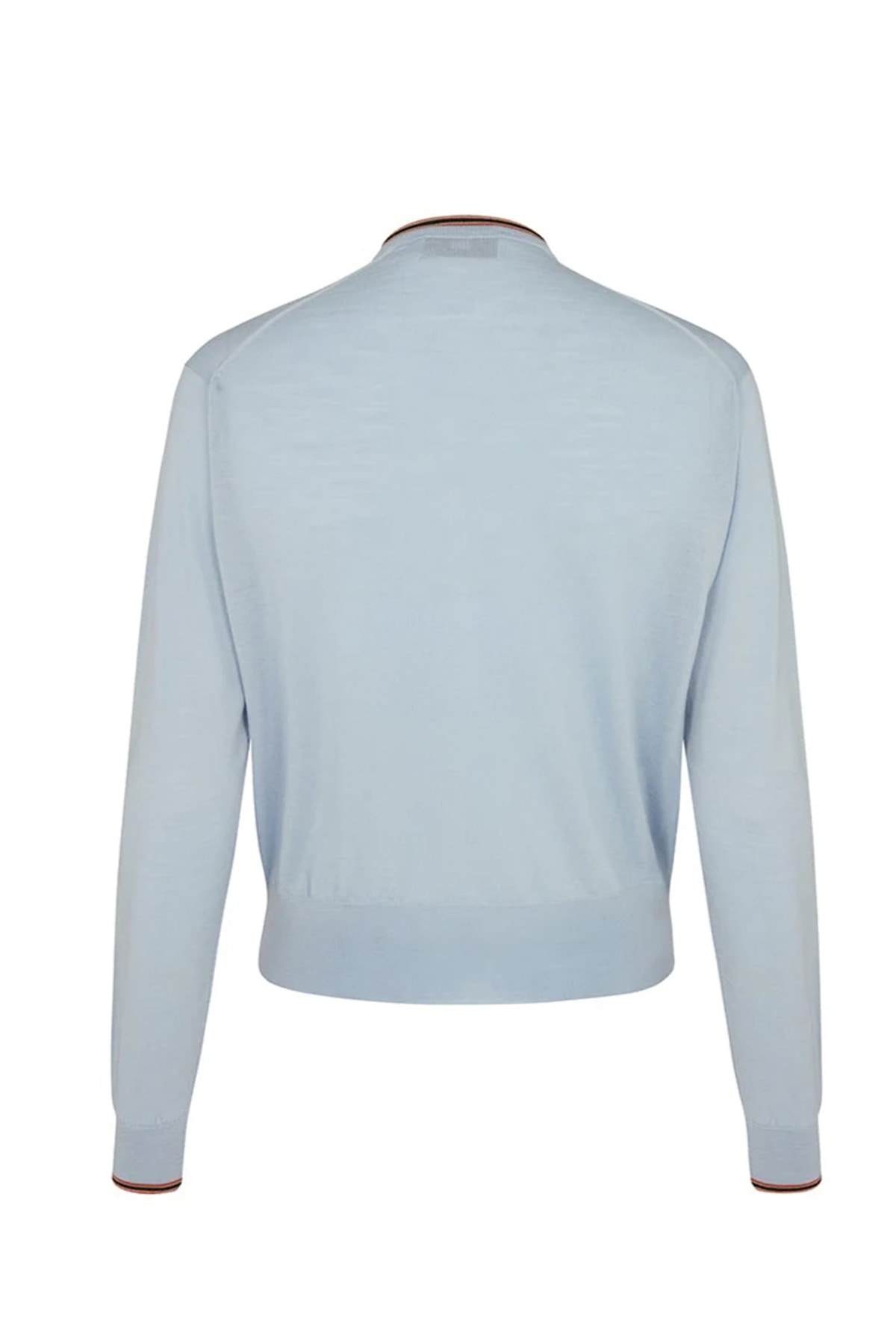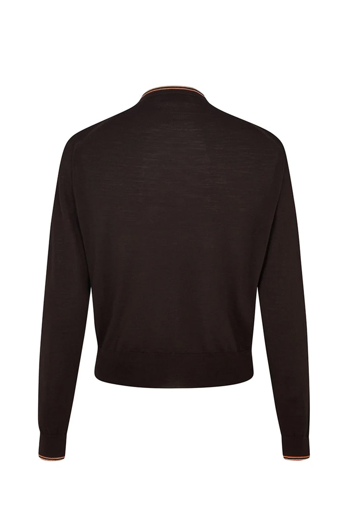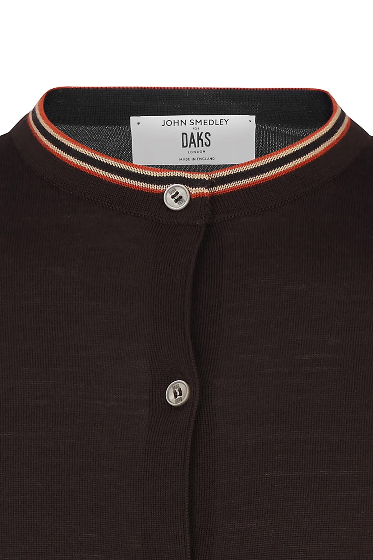 ジョン・スメドレーのエクストラファインメリノウールを英国で編み上げた滑らかなクルーネックカーディガン。ネックラインと袖口に配したDAKSハウスストライプがさりげないアクセントとなり、ビジネスから週末のレイヤードまで上品に対応する一枚です。