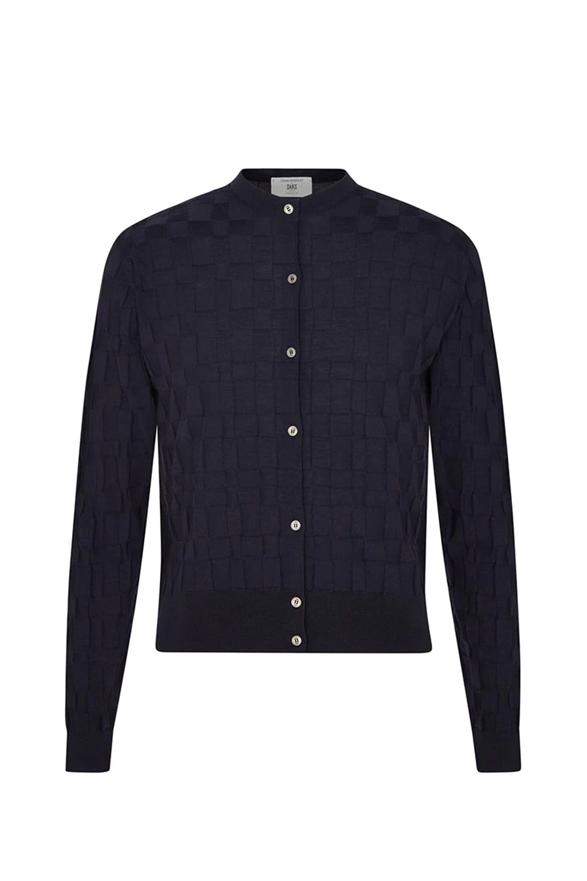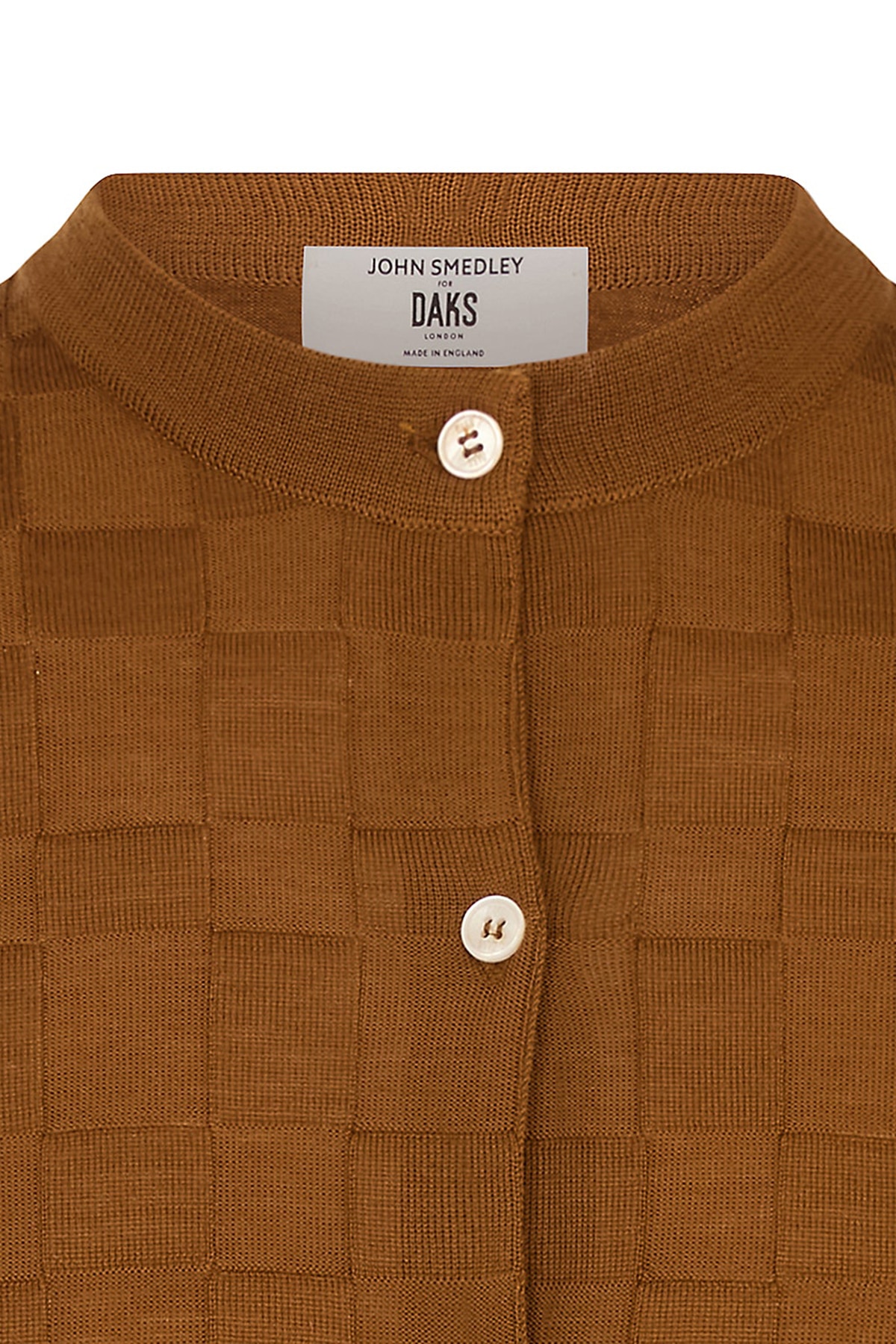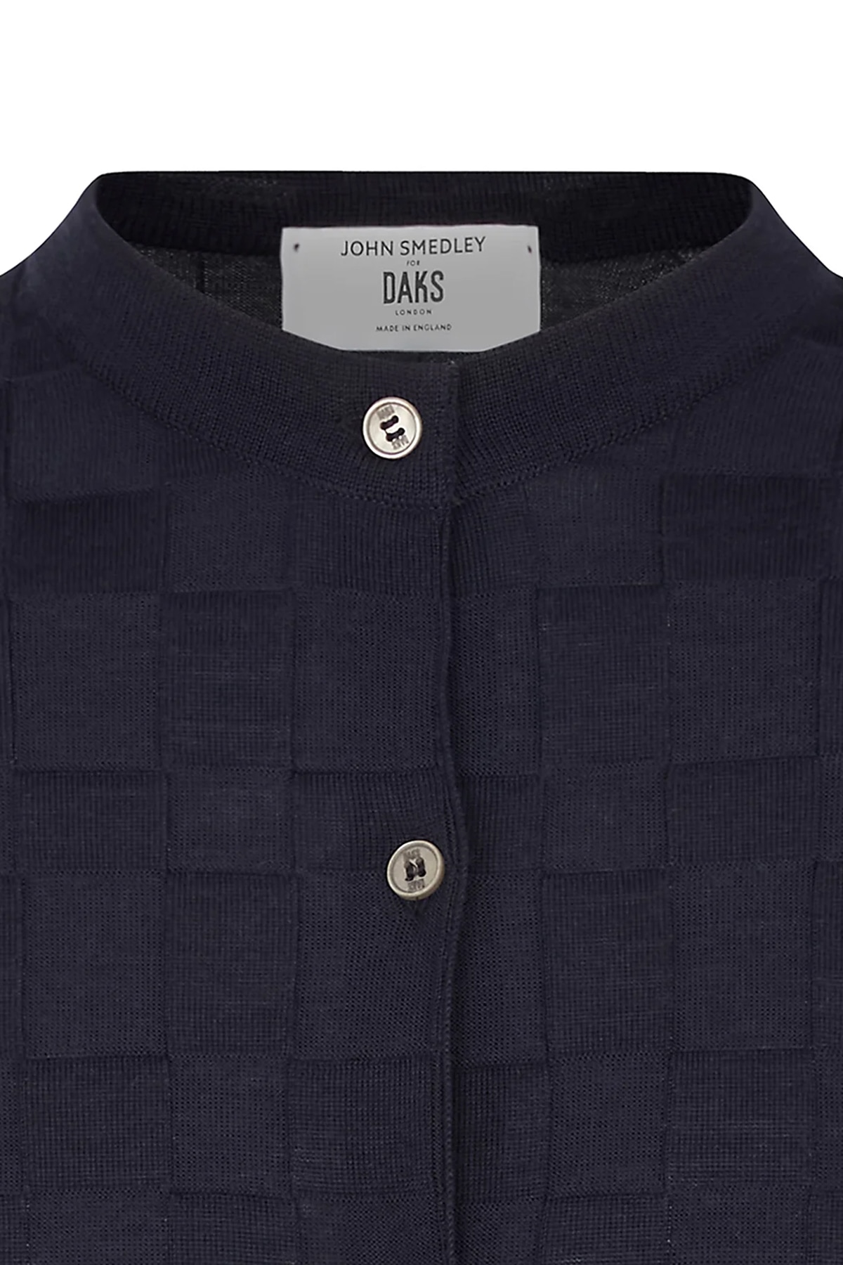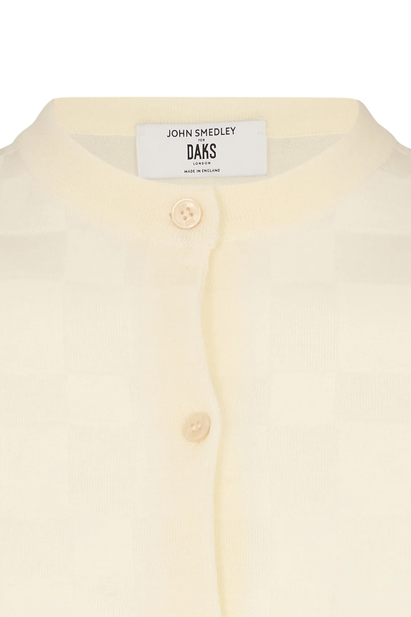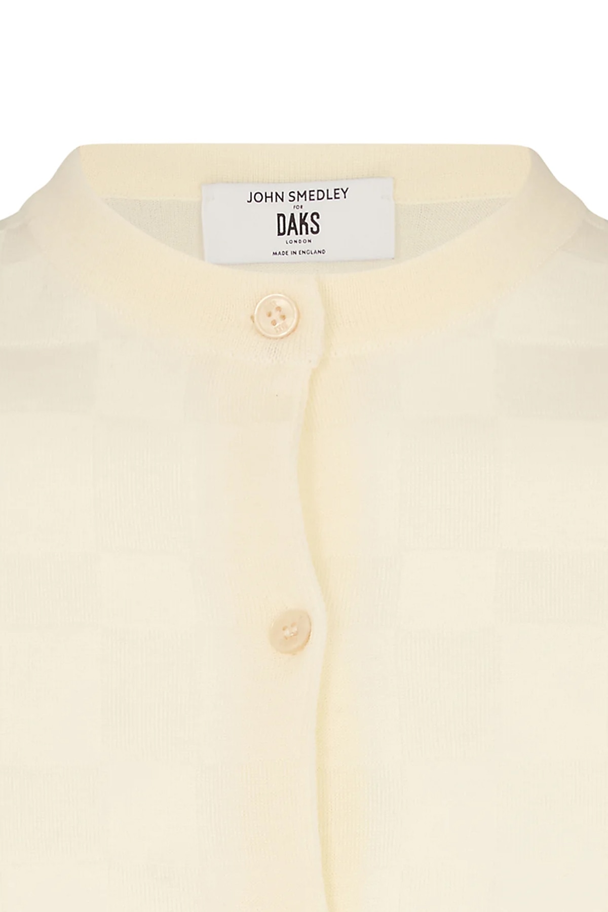 ジョン・スメドレーがDAKSのために限定開発した“シャドーハウスチェック”を編み込んだ30ゲージクルーネックカーディガン。薄手で滑らかな肌触りと上品なチェック柄が、ジャケットやコートのインとしても映える一着です。