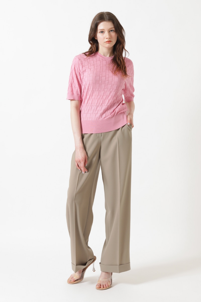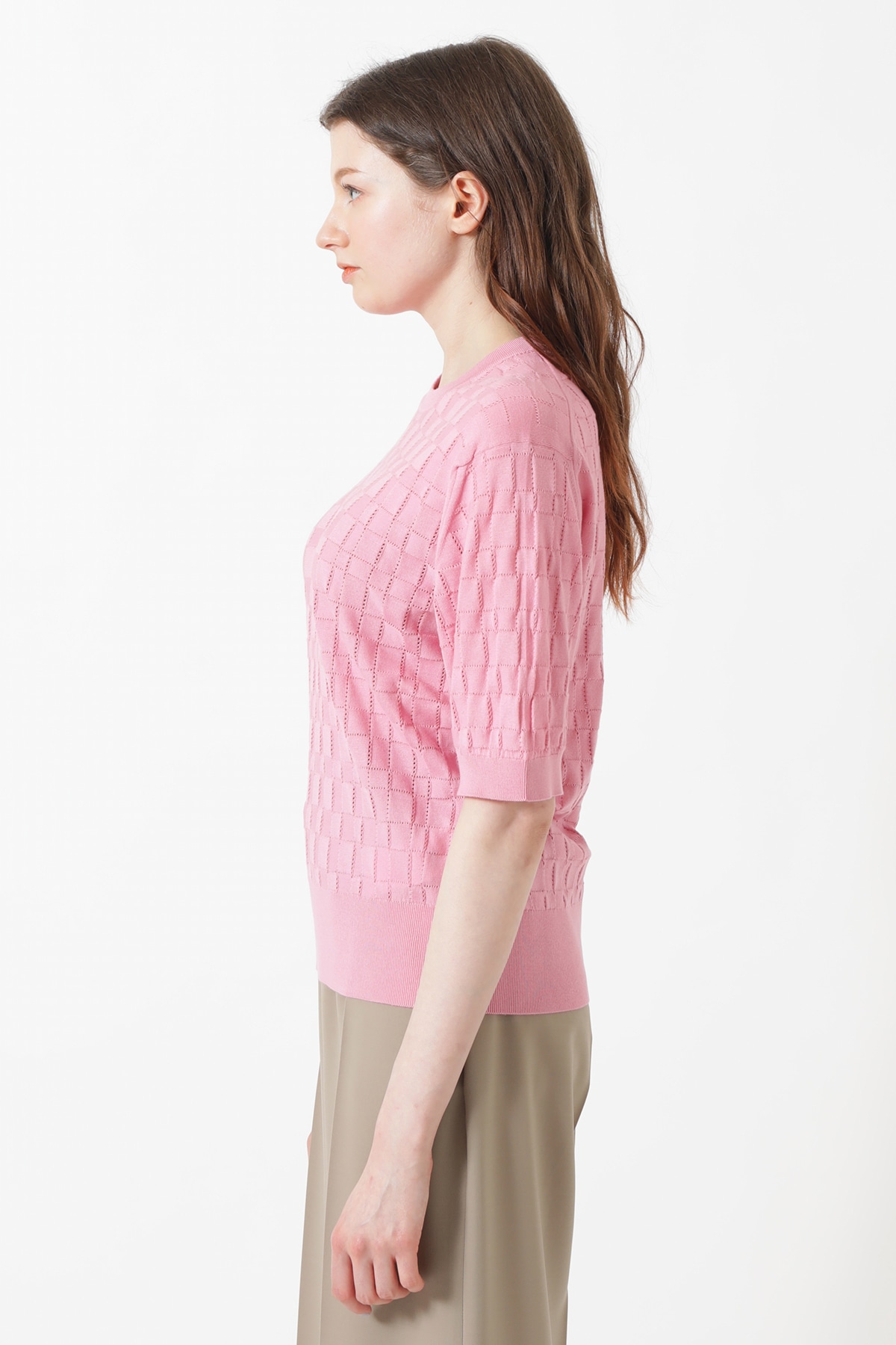 英国の老舗ジョンスメドレーとDAKSの特別なコラボレーションから生まれた、上質な綿100%の半袖ニットです。凹凸感のあるアイレットチェック編みが表情豊かで、肌離れの良さが春夏シーズンに最適です。顔周りを美しく見せるラウンドネックが、大人のカジュアルスタイルを華やかに演出します。シンプルながらも細部までこだわり抜いた英国伝統のクラフツマンシップを感じる逸品です。一枚着としてはもちろん、同素材のカーディガンとのアンサンブルも非常におすすめです。
