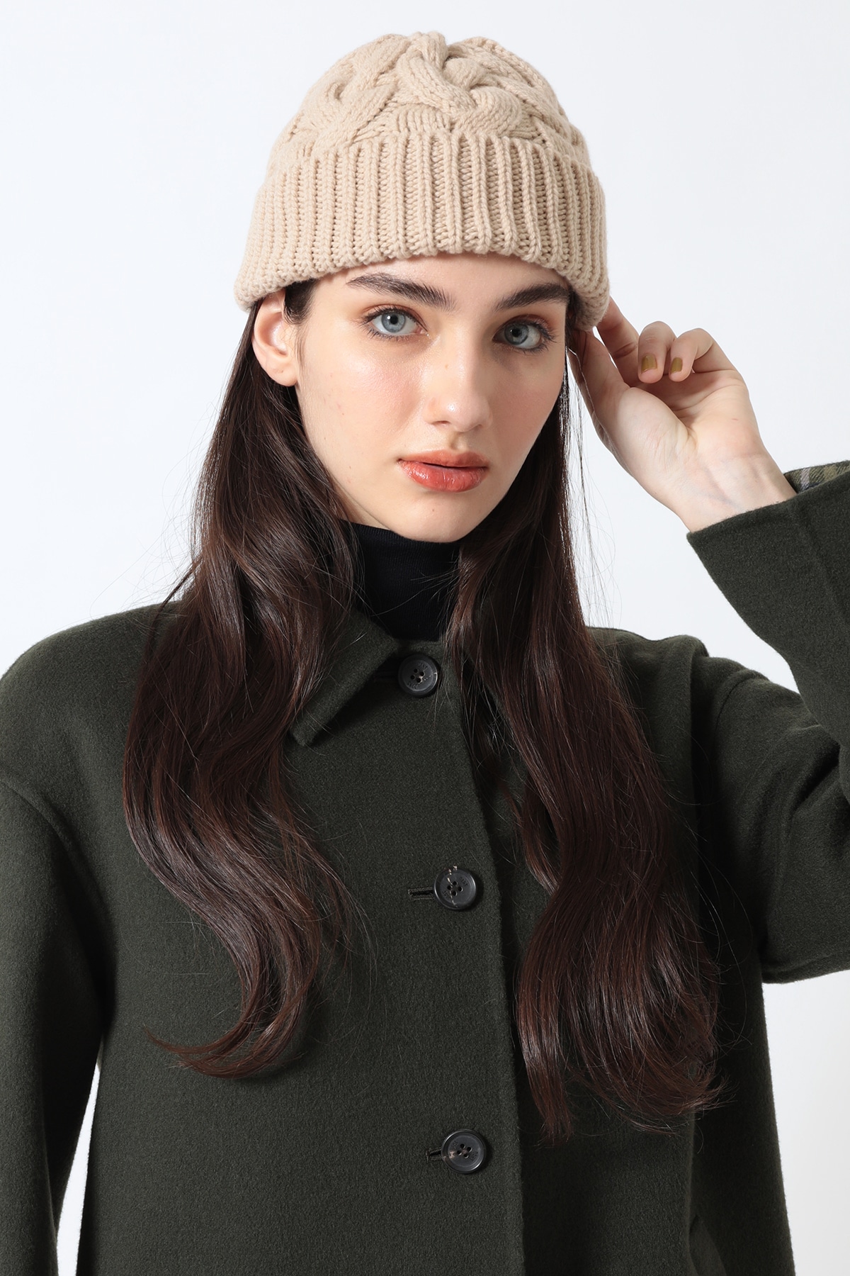 上質なウール100%の糸で丁寧に編み上げた、暖かなニットワッチです。頭部はざっくりとしたケーブル編みで立体感と温かみを演出し、被り口は伸縮性に優れたリブ編みで締め付けすぎない快適なフィット感を実現しました。左サイドの裾には、DAKSの象徴であるハウスチェック柄のピスネームをさりげなくあしらい、カジュアルな中にもブランドらしい上品さをプラスしています。防寒対策としてはもちろん、秋冬のコーディネートのアクセントとして活躍するアイテムです。