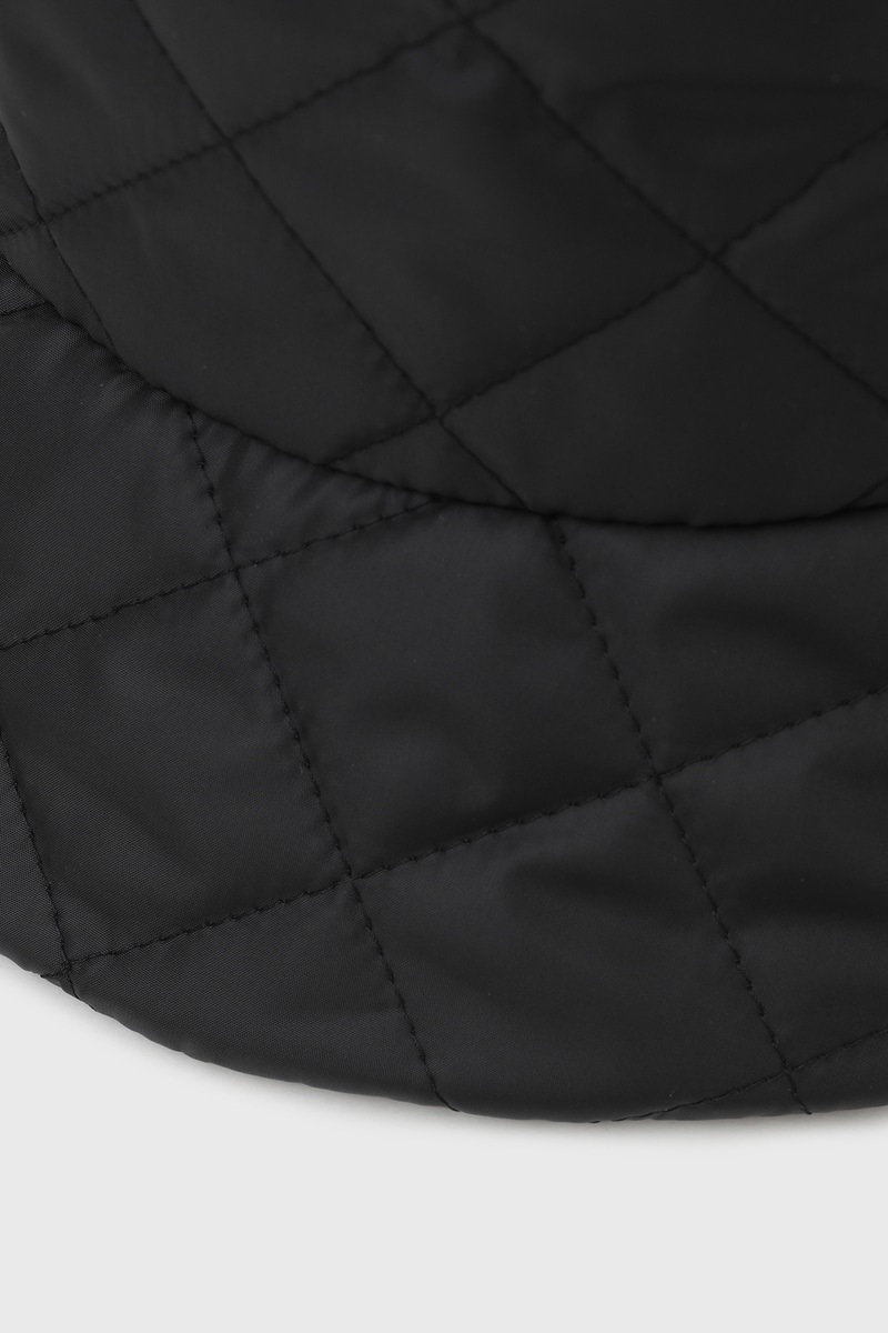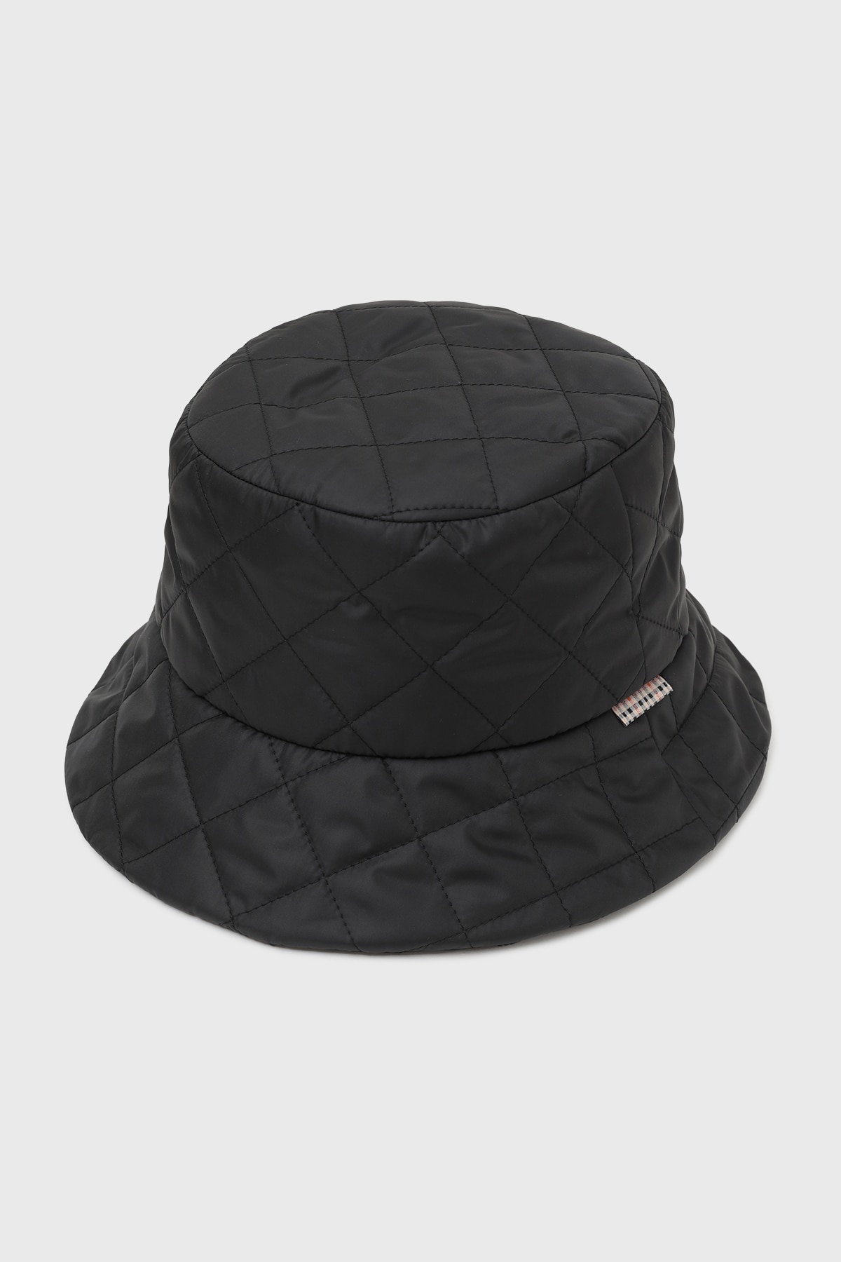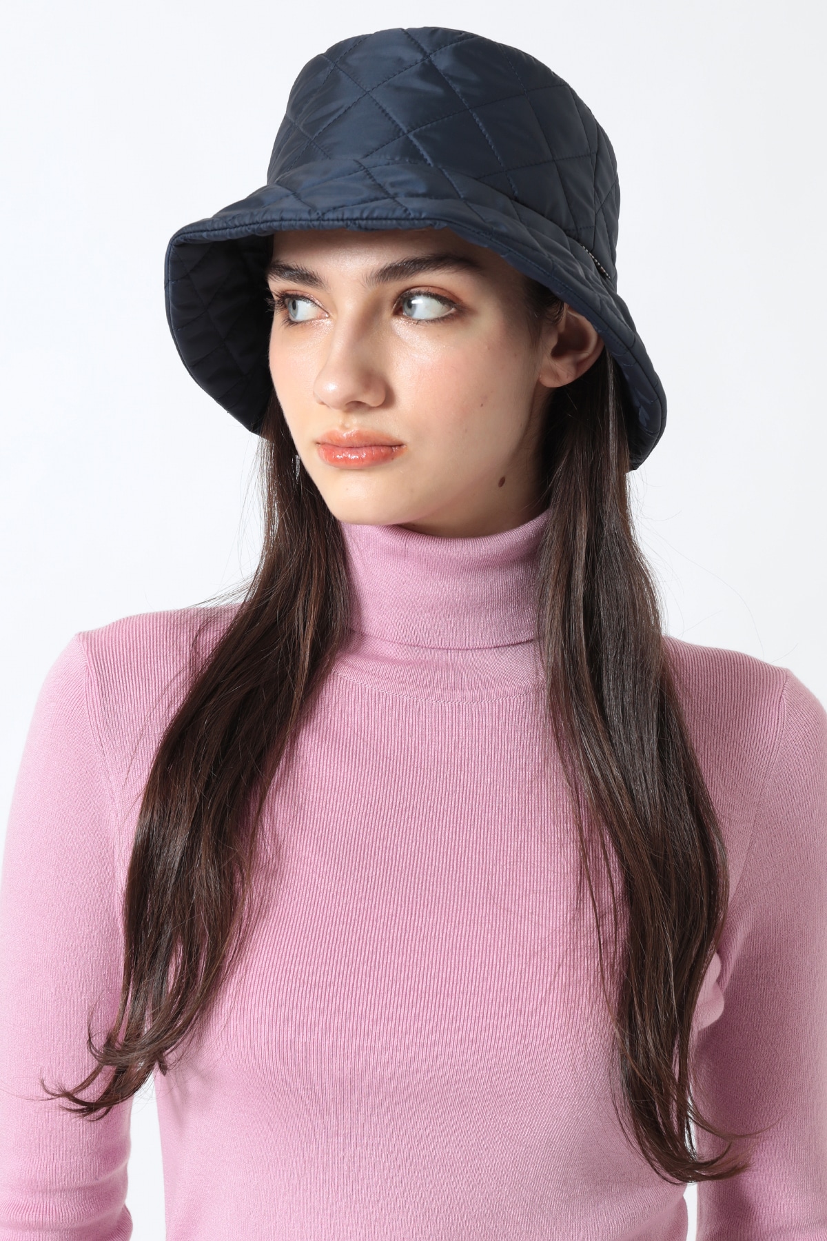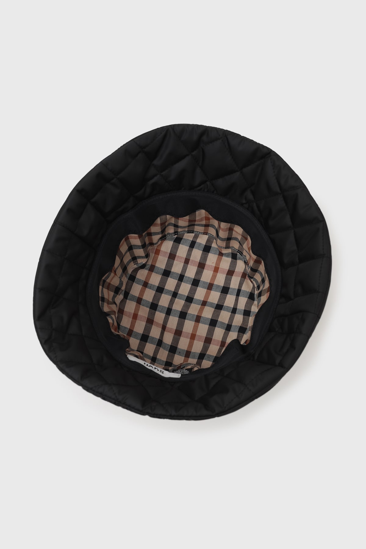 綿入りキルト素材を用いたバケットハット。内側にハウスチェックを配し、左サイドのピスネームやサイズ調整ビン革、ポケッタブル仕様で持ち運びにも便利です。