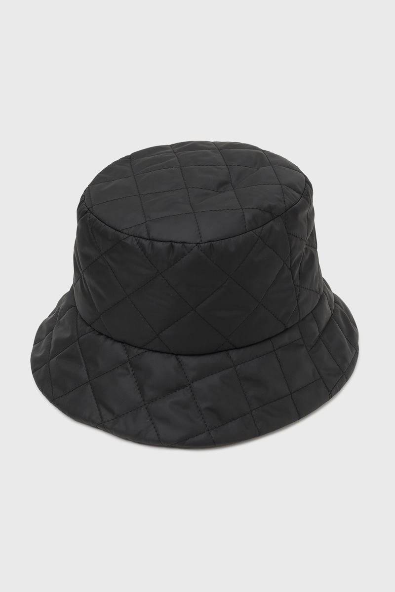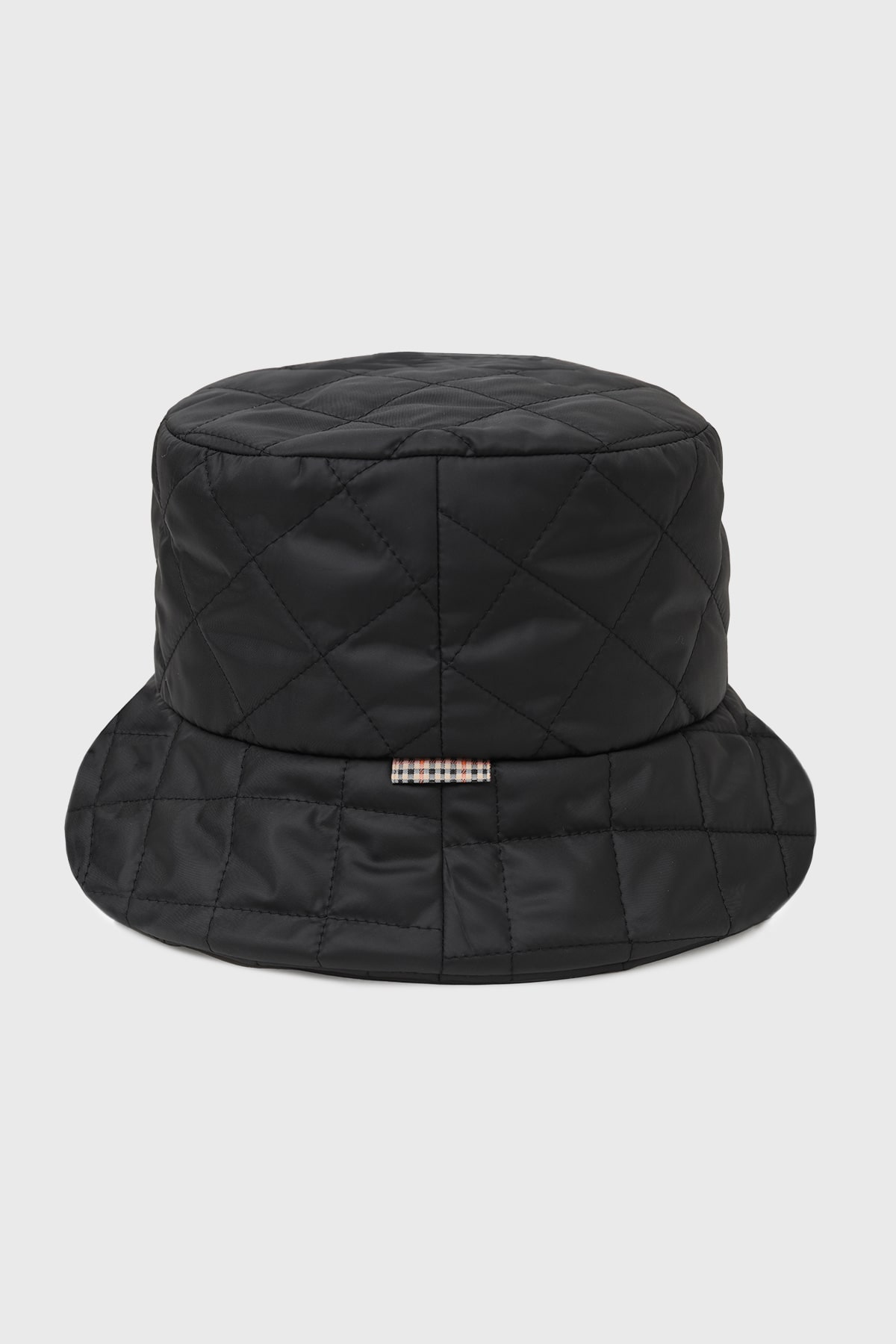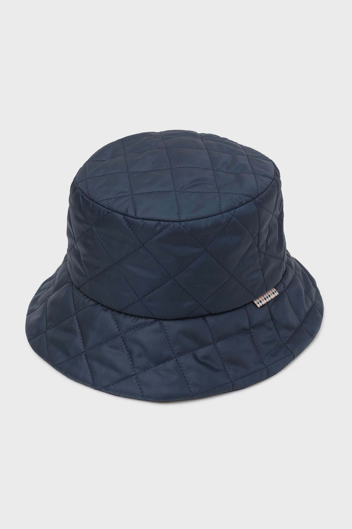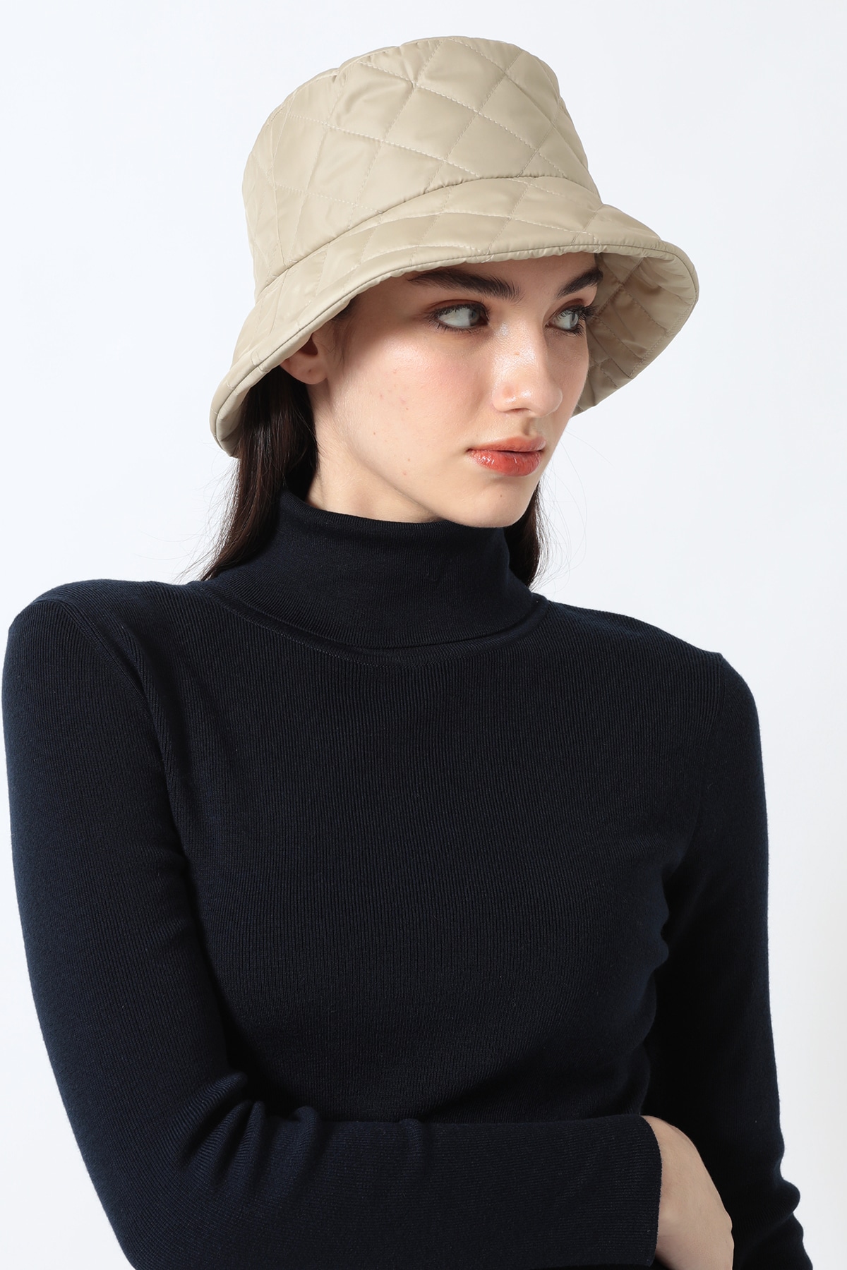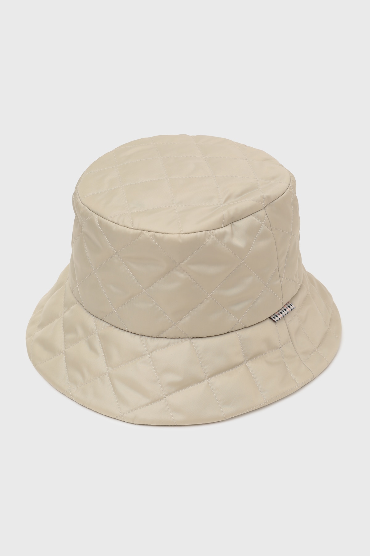 綿入りキルト素材を用いたバケットハット。内側にハウスチェックを配し、左サイドのピスネームやサイズ調整ビン革、ポケッタブル仕様で持ち運びにも便利です。