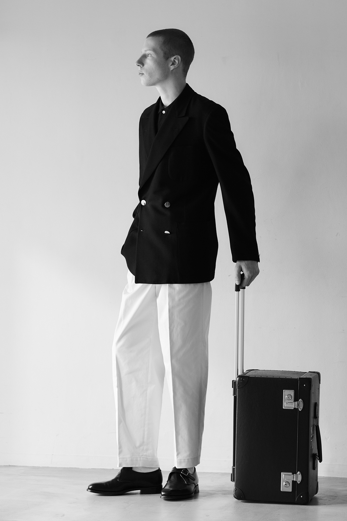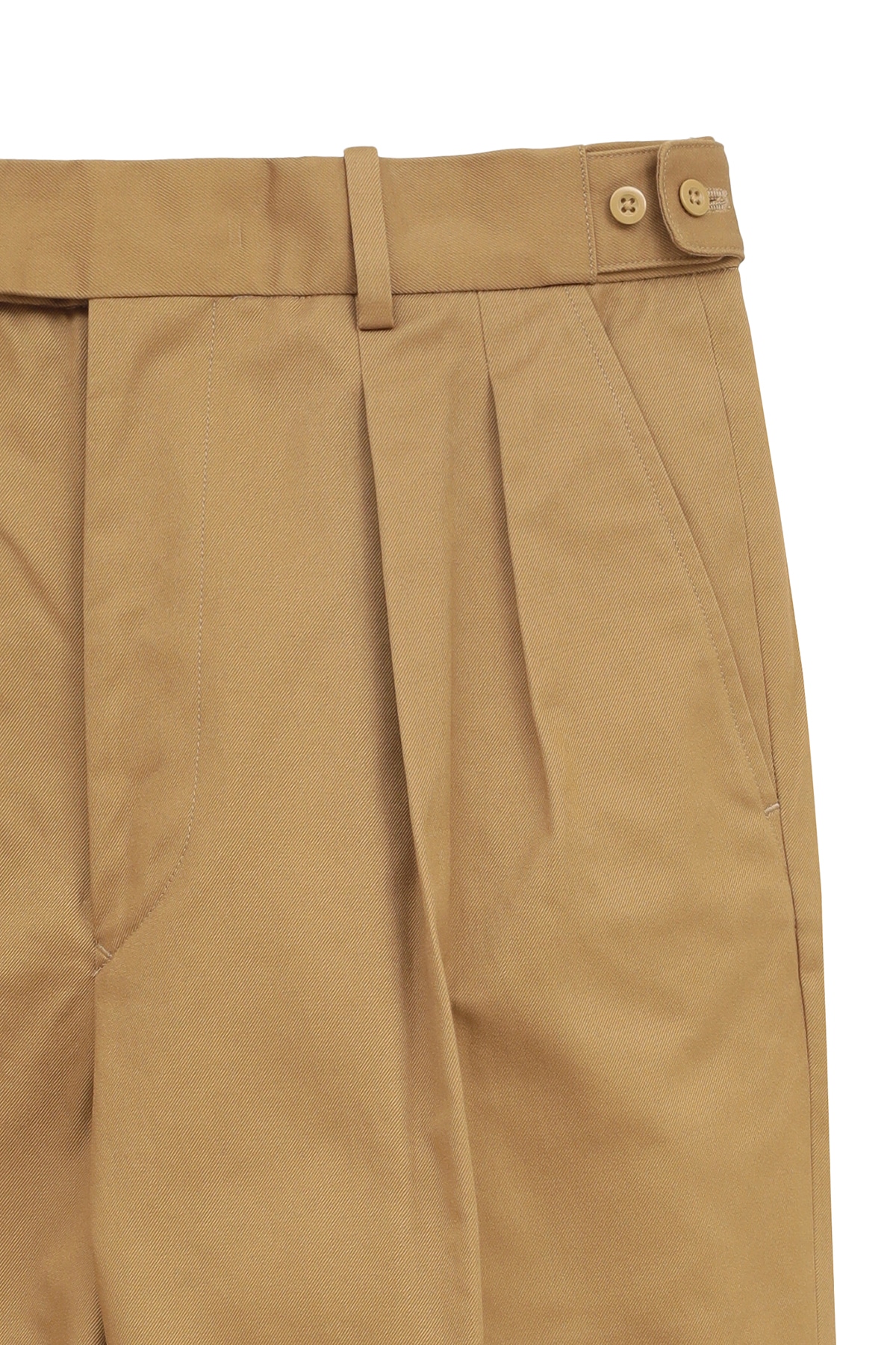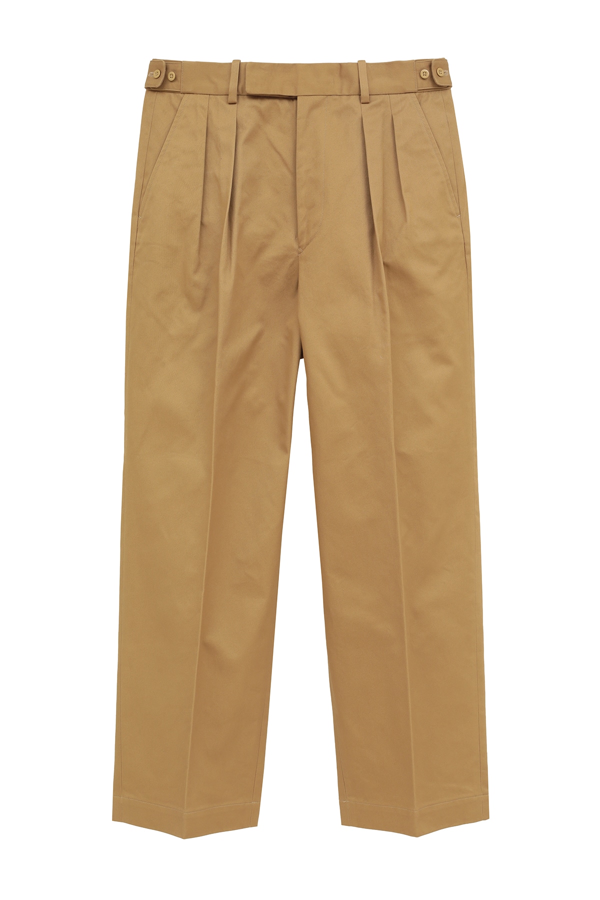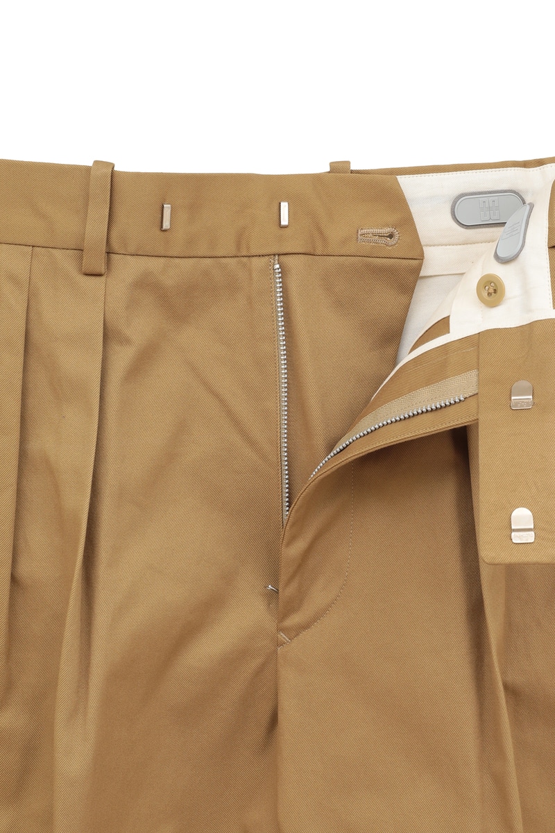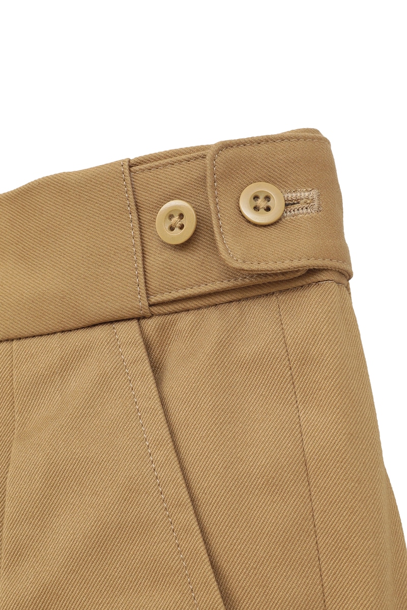英国紳士服の歴史を変えた「DAKS TOP」仕様を、上質なサンホアキンコットンチノで仕立てた2プリーツトラウザーズ。サイドアジャスターでウエストを調整するベルトレス仕様は、腰回りをすっきりとおさめ、ジャケットスタイルをより美しく格上げします。