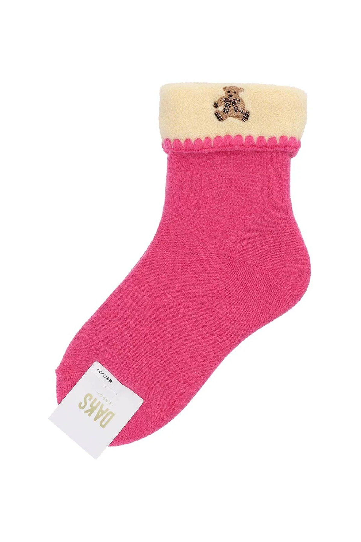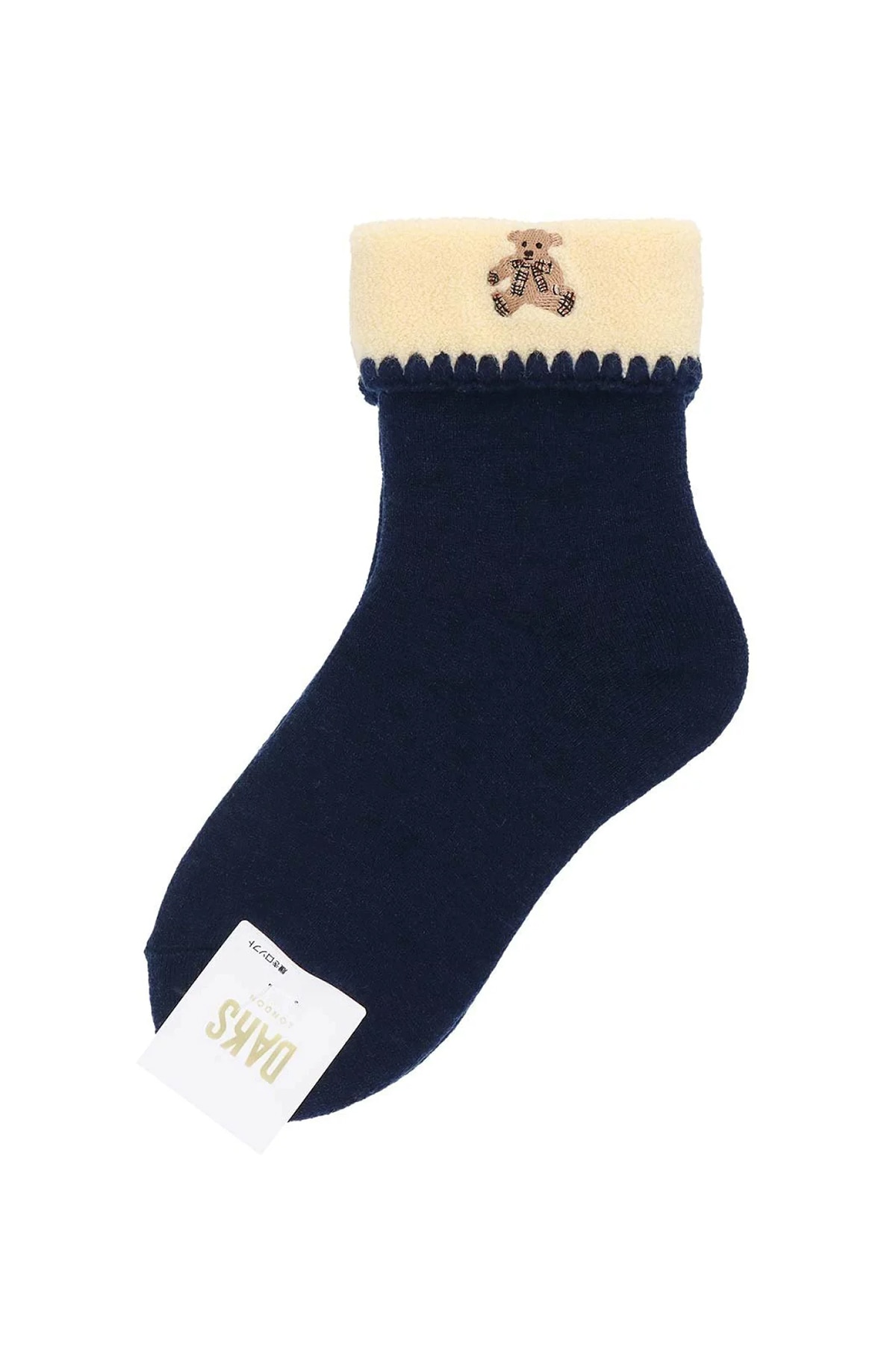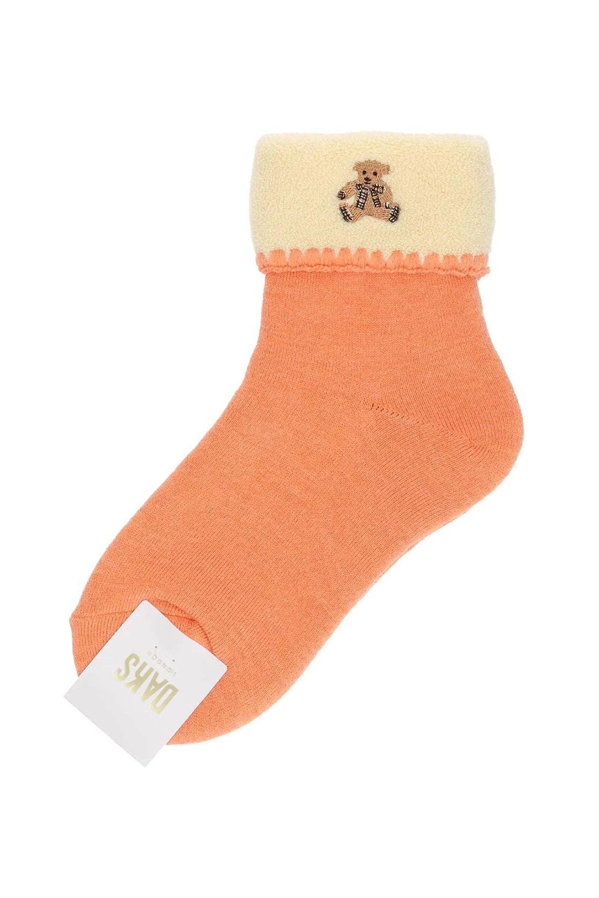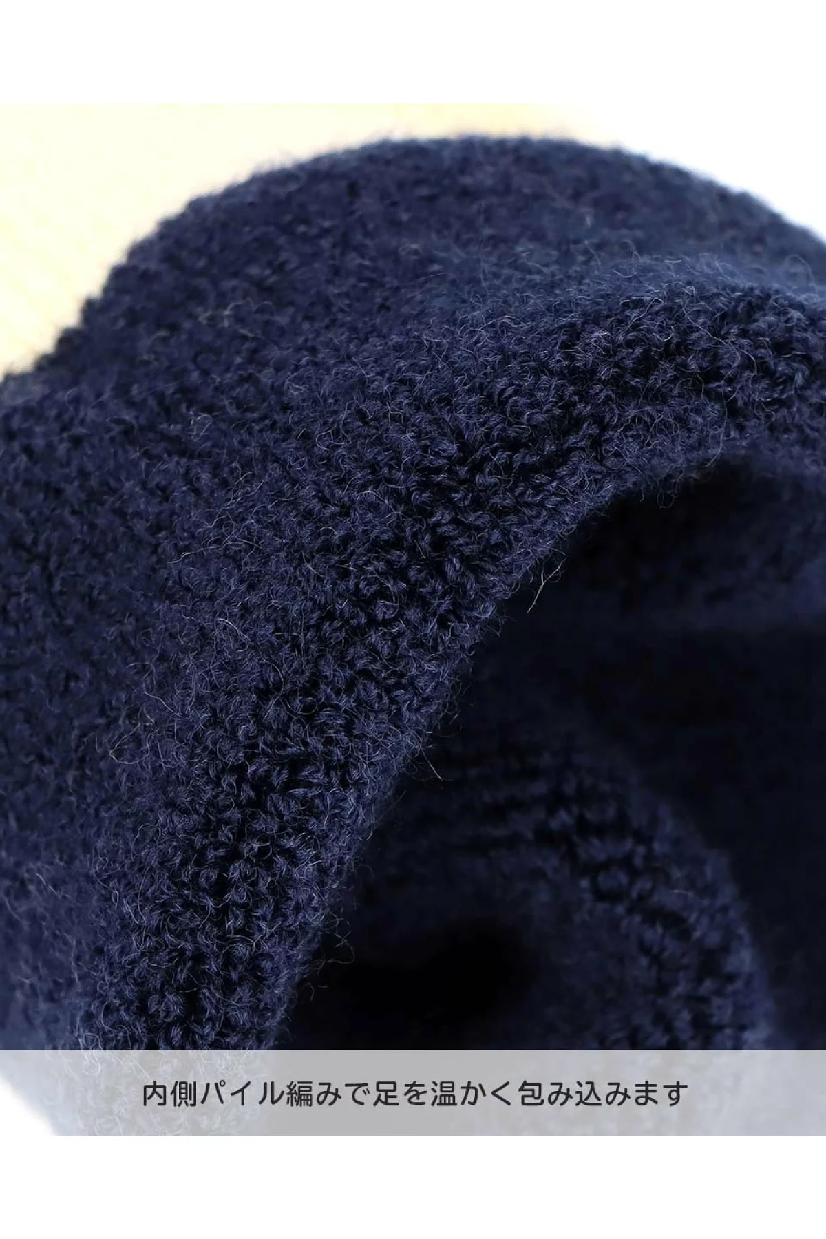アクリル混のあたたかい毛混素材を使用した総パイルのルームソックス。折り返しデザインとベア刺繍がポイントで、リラックスタイムにぴったりの一足です。