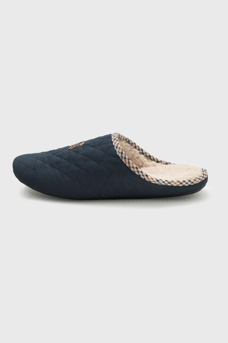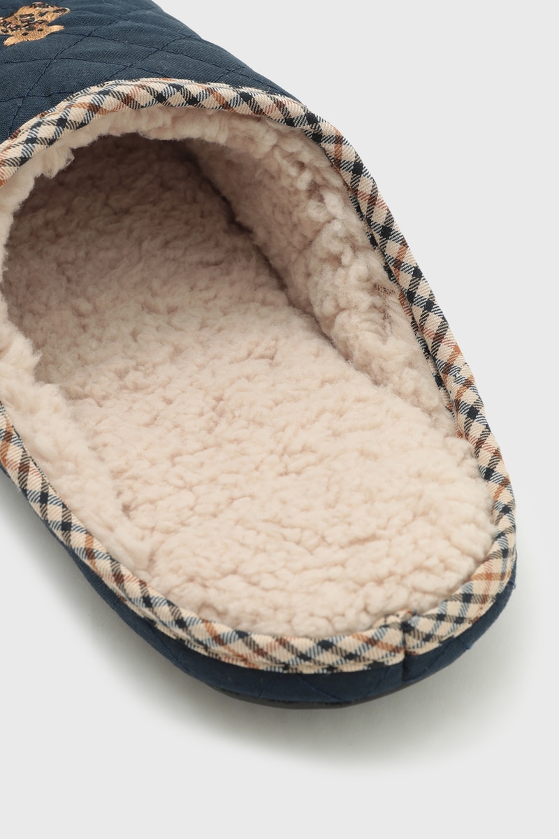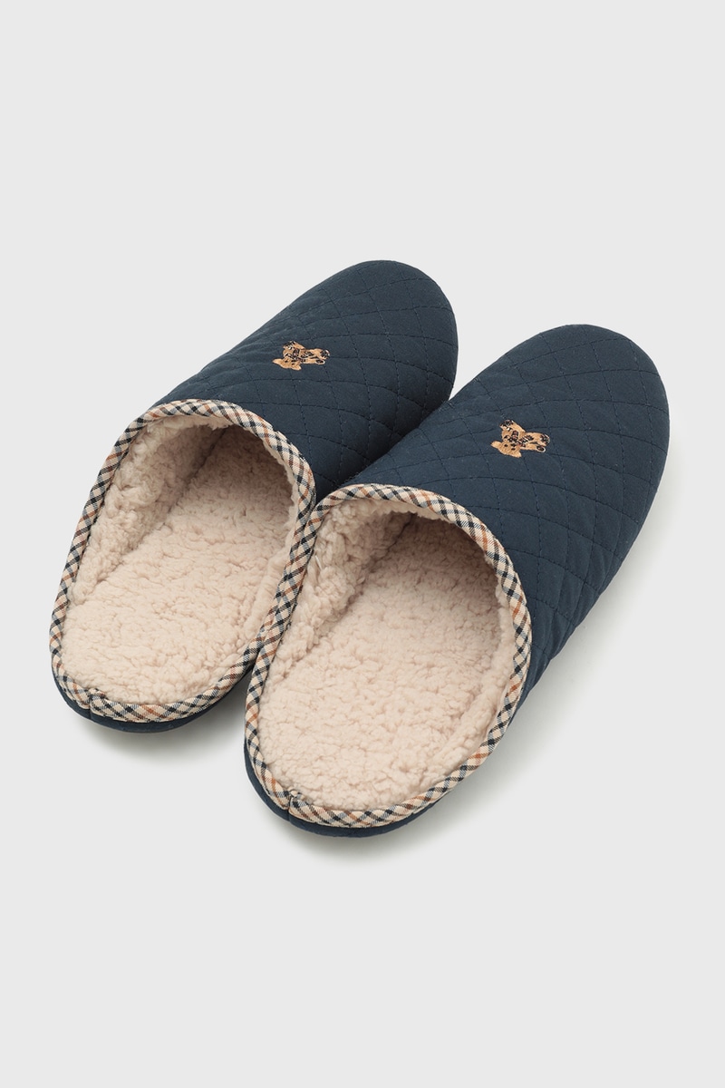 DAKSらしい上品さを落とし込んだメンズ向けルームスリッパ。表面は風合い良いキルティング生地、内側はふっくらとしたボアで足全体を包み込み、冷える季節も快適に過ごせます。さりげなく施したベアの刺繍とチェックパイピングが、リラックスタイムにさりげない上品さを演出。軽量で出し入れしやすいスリップオン仕様、安定感のある合成底で室内のちょっとした移動にも安心です。毎日使いたくなる、ギフトにも最適な一足です。