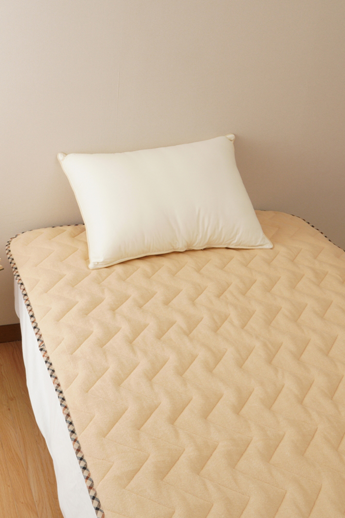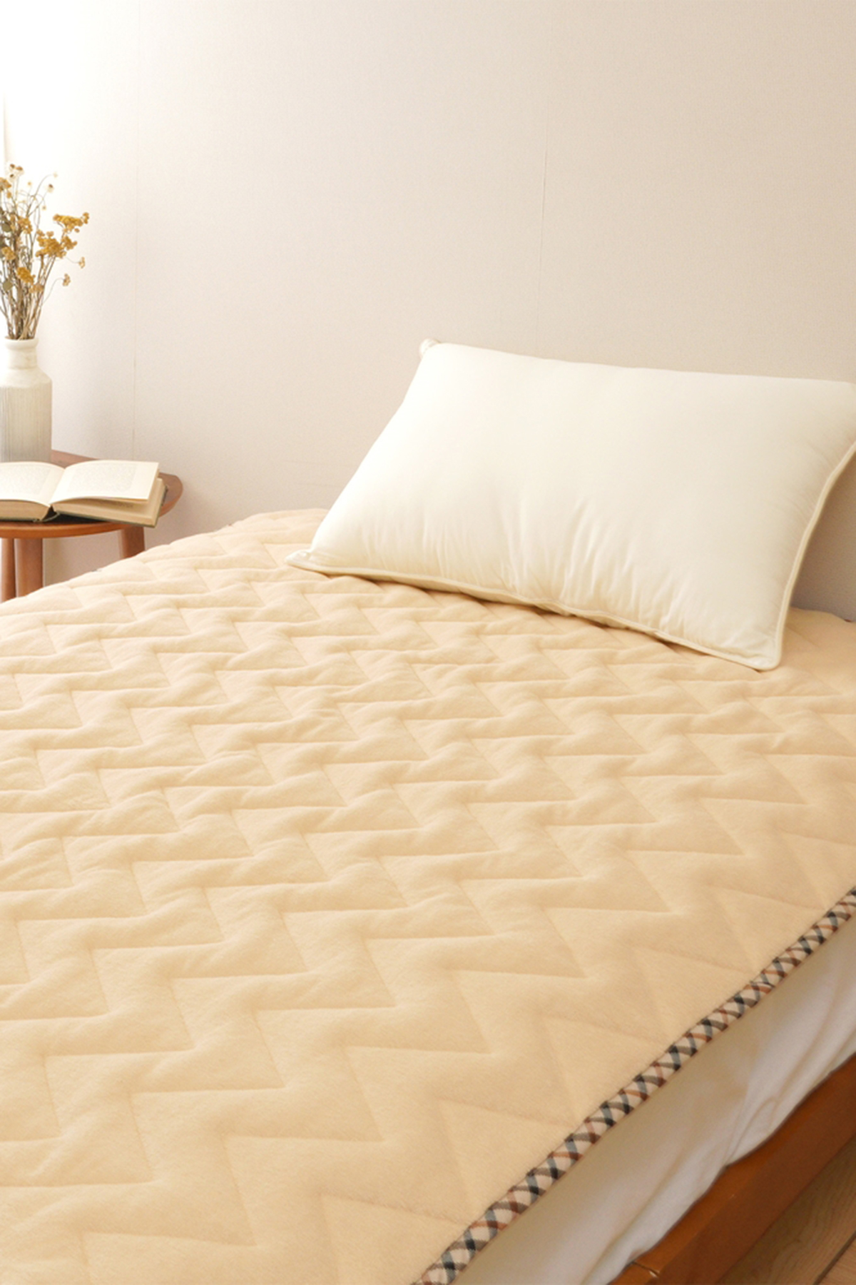 やわらかくふんわりとしたボリュームで、さらっとした感触でオールシーズンお使いいただけます。四隅ゴム付きでずれにくくお洗濯もカンタンです。
