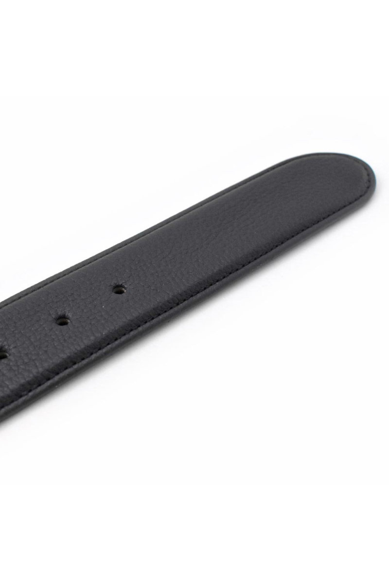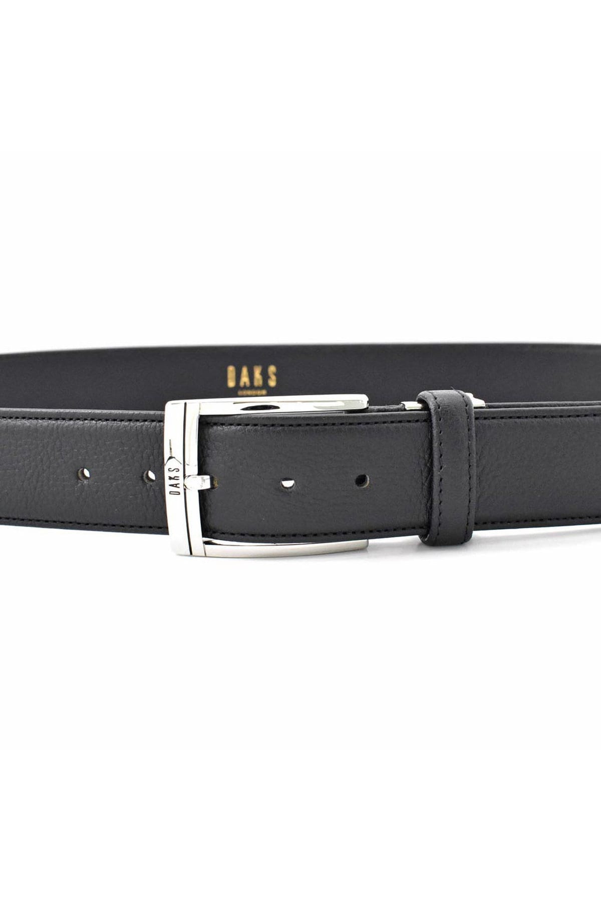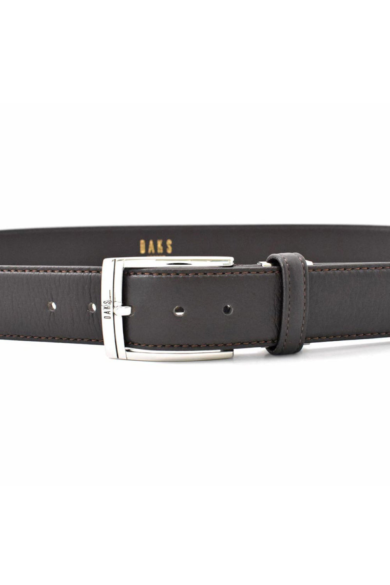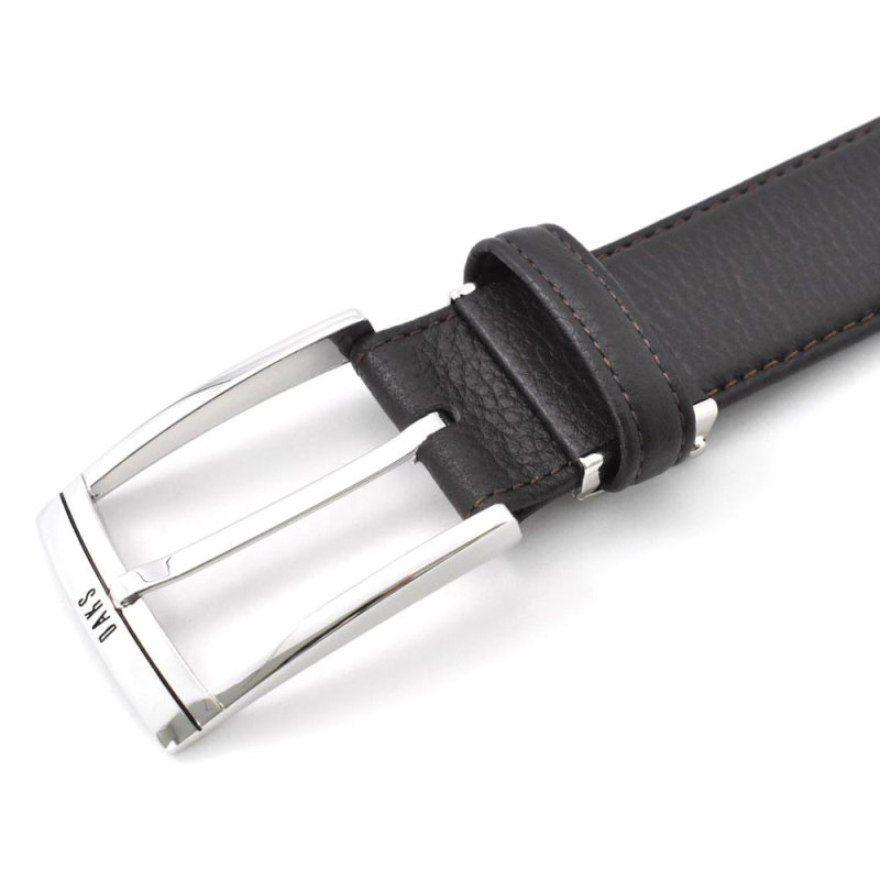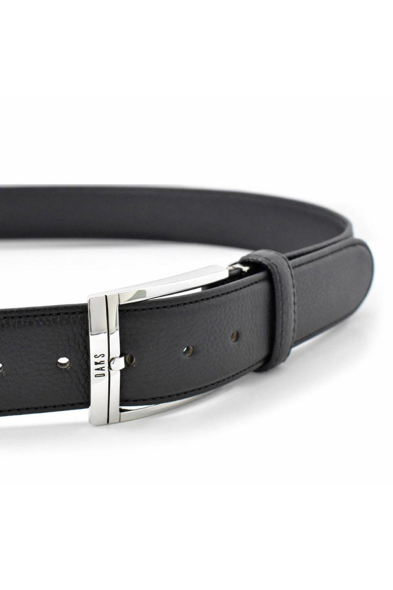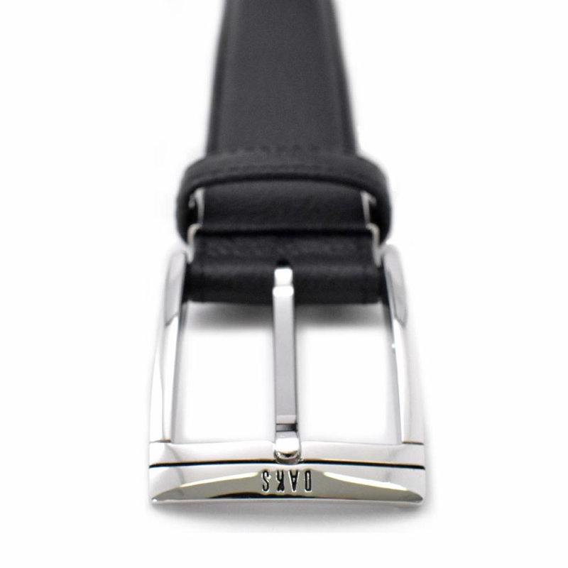通常のベルトよりも帯幅が5mm広い、35mm幅のシンプルなビジネスベルト。DAKSの刻印が入ったバックル。刻印と同じブラックのラインをアクセントに引いた通称「墨入れ」と呼ばれる手法を用いたシンプルなデザイン。