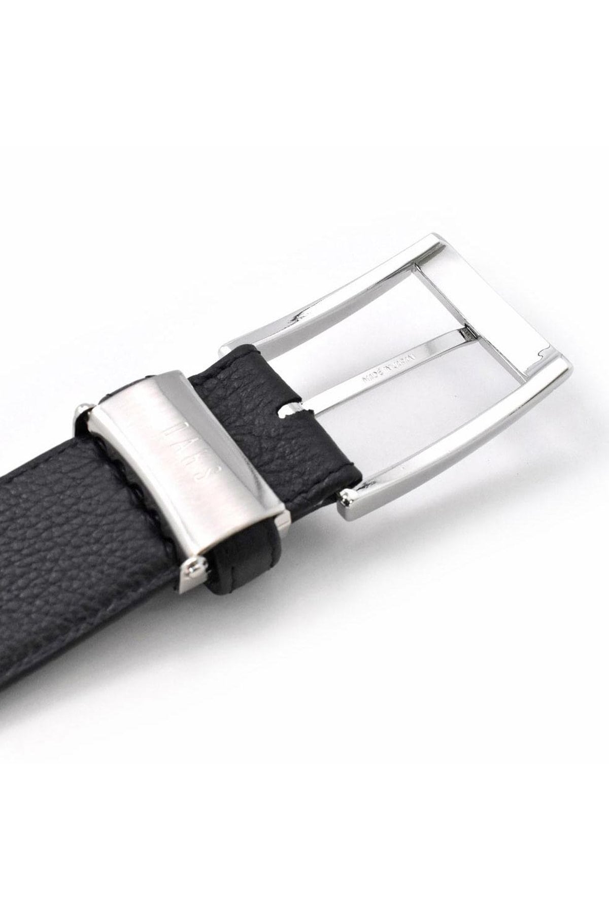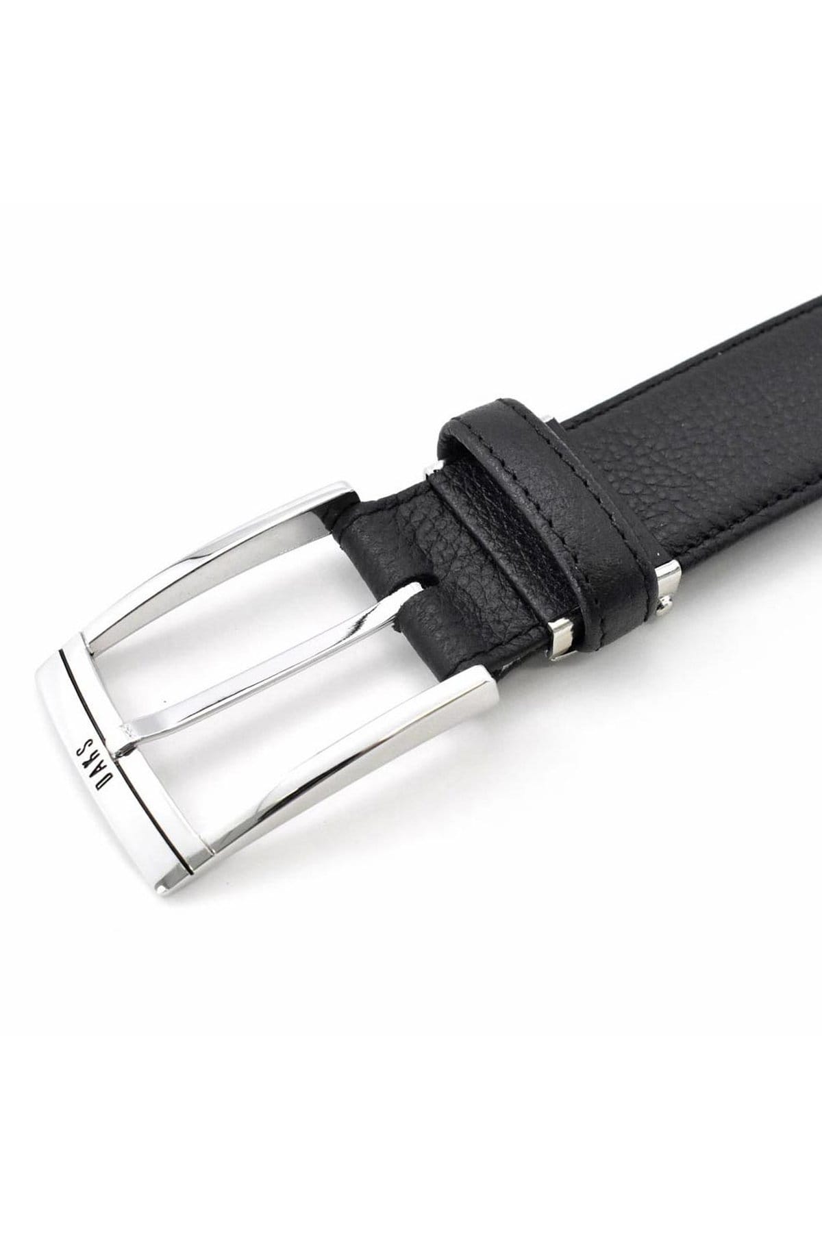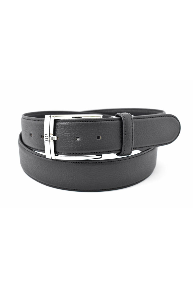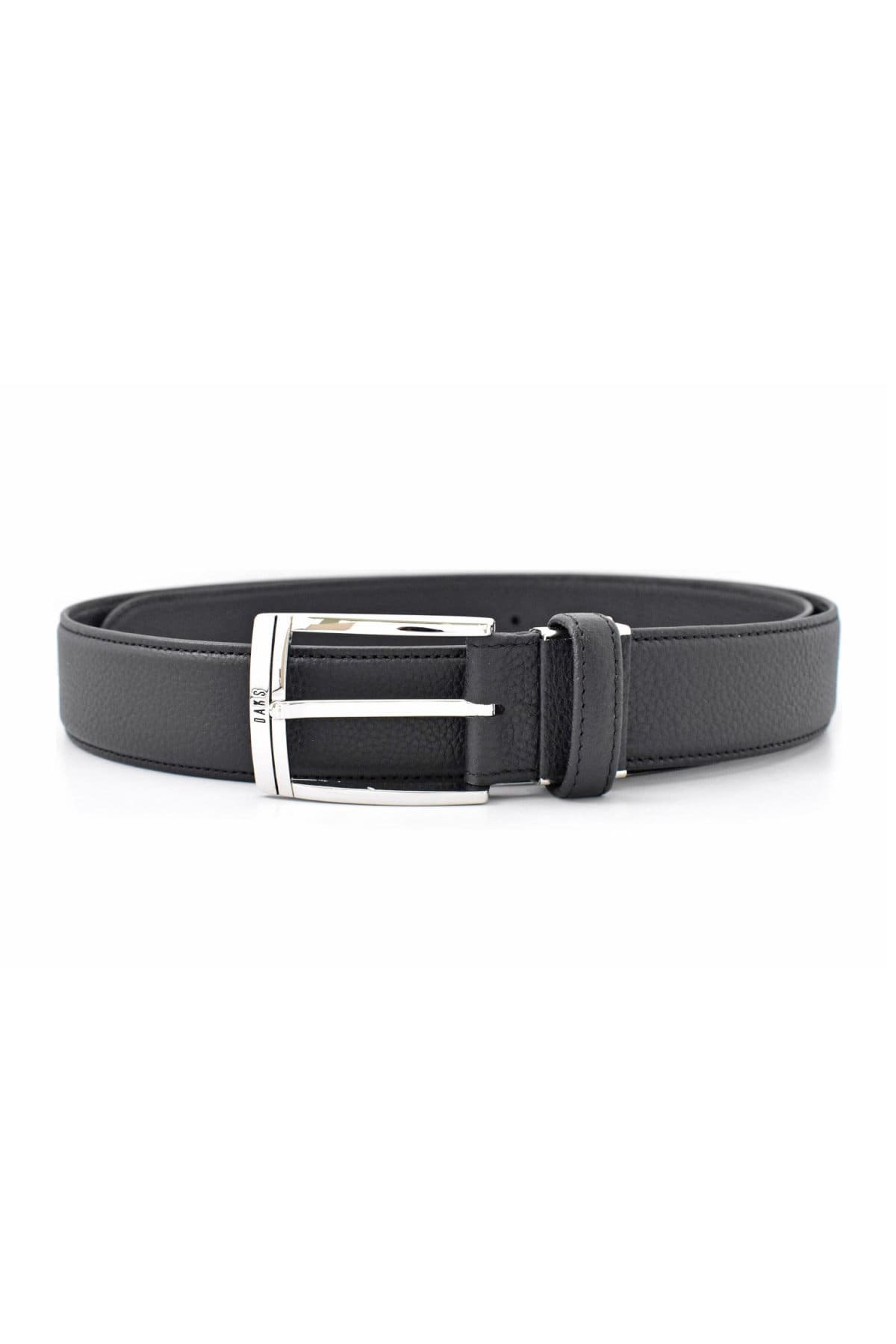 通常のベルトよりも帯幅が5mm広い、35mm幅のシンプルなビジネスベルト。DAKSの刻印が入ったバックル。刻印と同じブラックのラインをアクセントに引いた通称「墨入れ」と呼ばれる手法を用いたシンプルなデザイン。