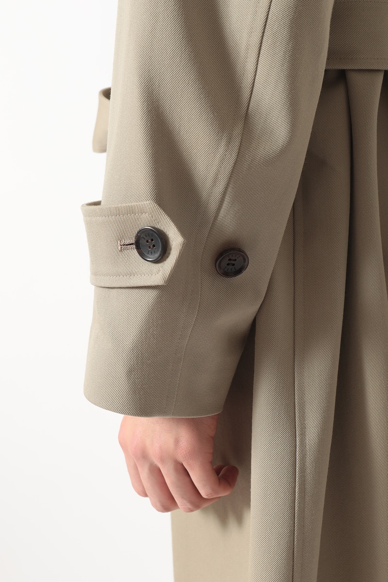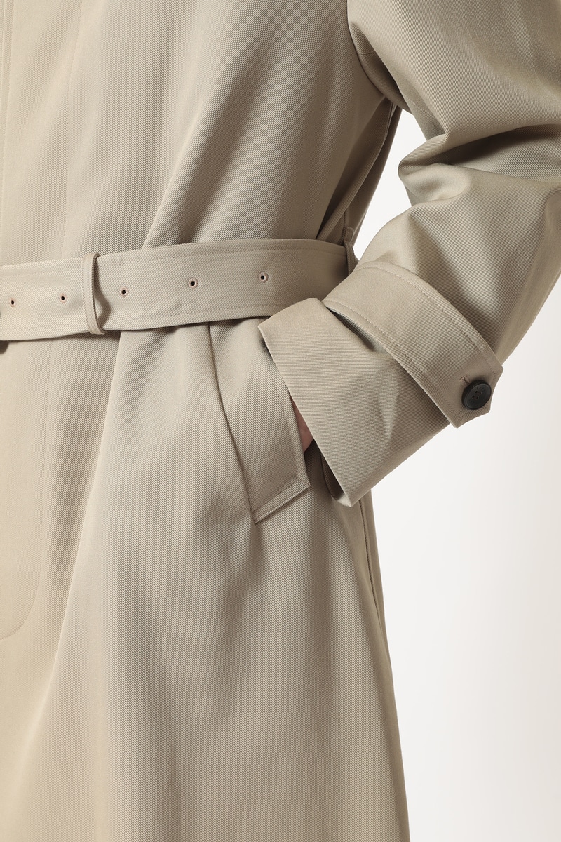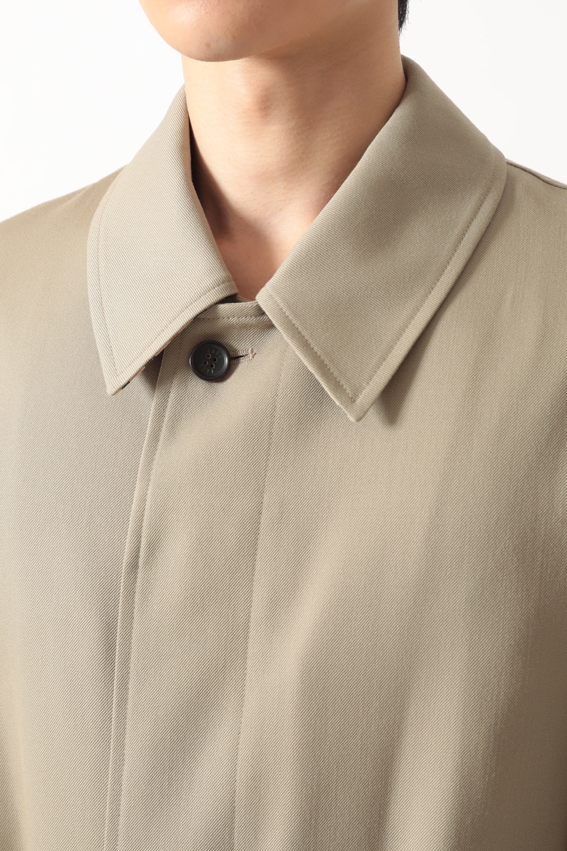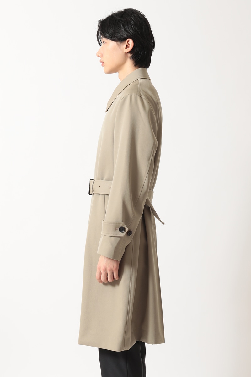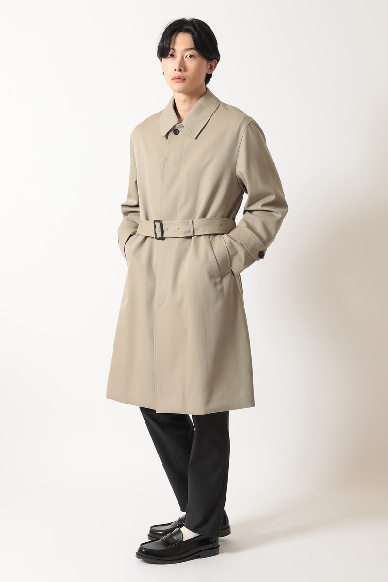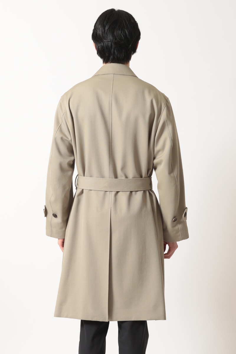 経糸に3/60、緯糸に2/48ウールを極限まで打ち込んだギャバジン素材です。仕上げにウレタンを含浸加工することで、高密度なハリ感を持ちながら、さらに反発感を生み出しています。DAKSが厳選した、しなやかで上品な光沢を持つ上質な素材です。