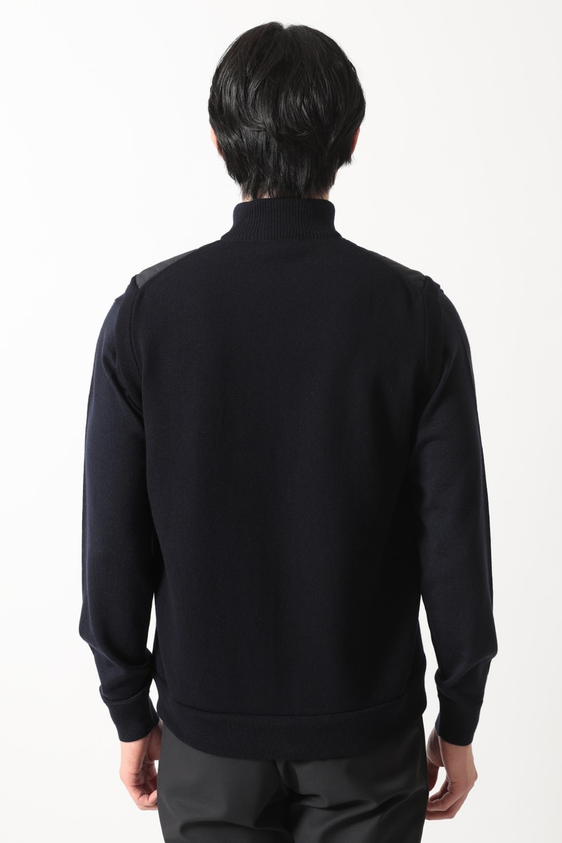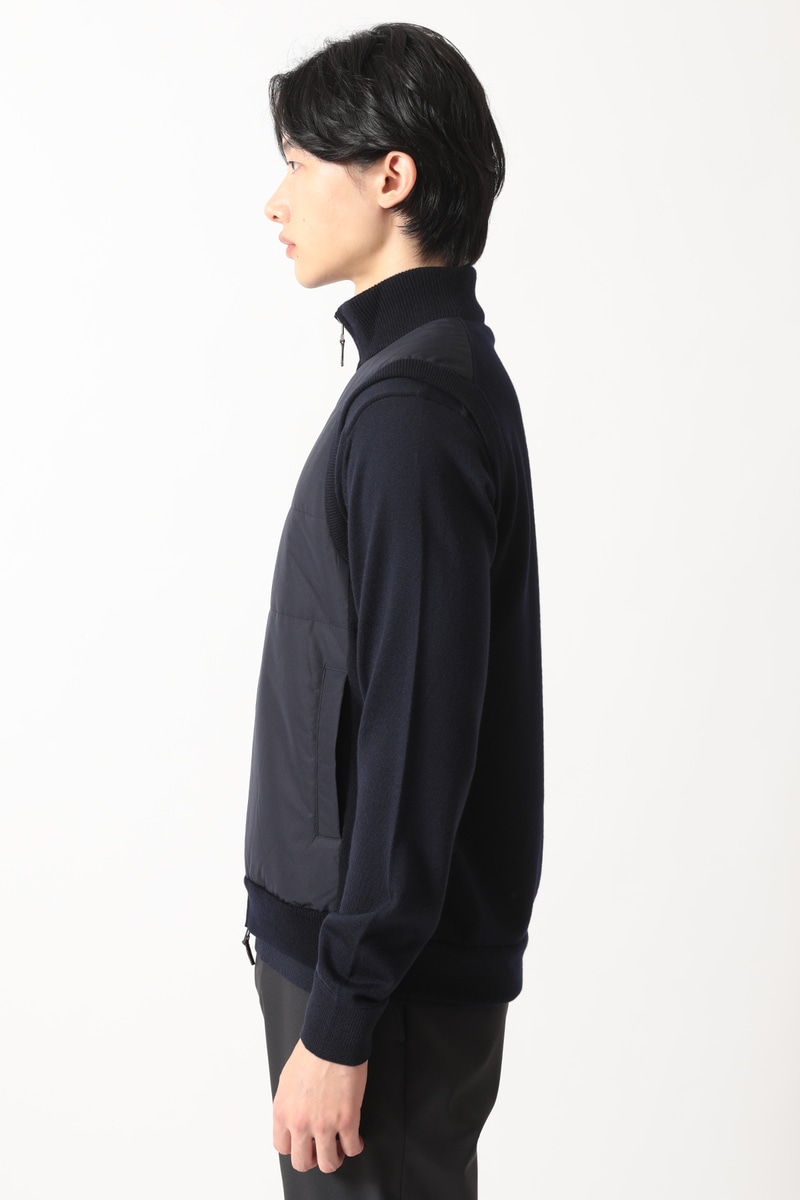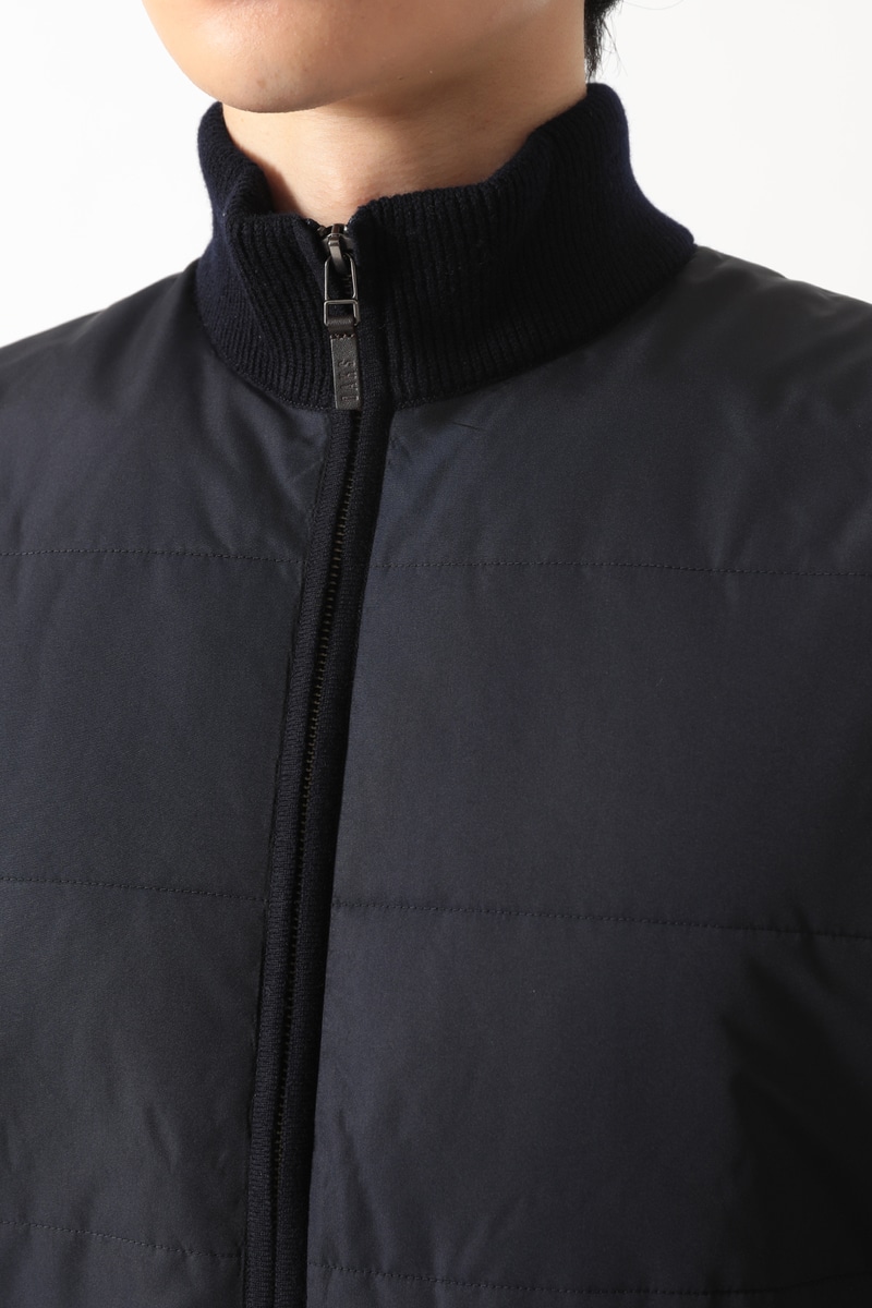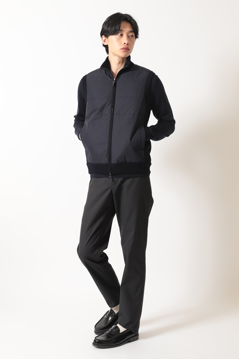 2/30 10G 2PLY天竺編みと、DICROS SOLERA IV(ディクロス ソレラ フォー)タフタパディングを組み合わせたスポーティーなニットベストです。フロントには高機能タフタを使用し、中綿にはシンサレートを採用することで優れた保温性を実現しました。DAKSらしい上質な素材感と機能性を両立した、これからの季節に活躍する一着です。