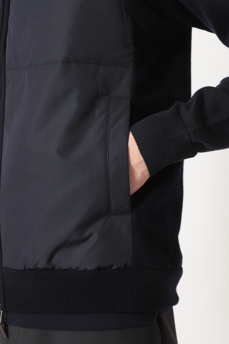 ニット部分には17.5マイクロンのエキストラスーパーファインウールを使用。非常に繊細で、綺麗な発色性に優れた原料で編み立てられています。また、タフタ部分には、特殊な撚糸工程を経たマルチ構造の糸を使用。高捲縮(こうけんしゅく)で膨らみがあり、高密度に織られた機能的な素材を組み合わせています。