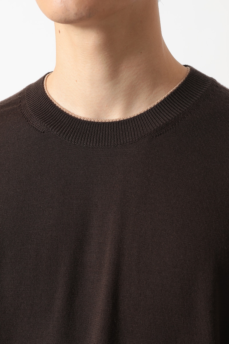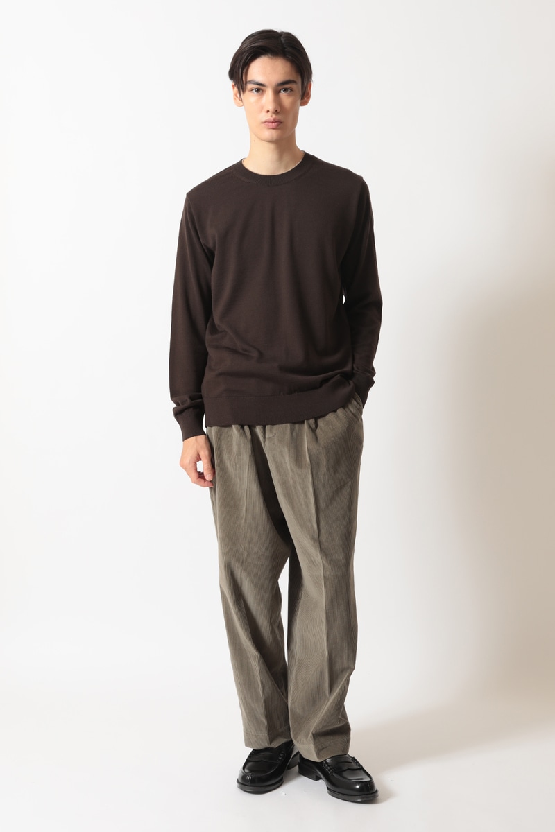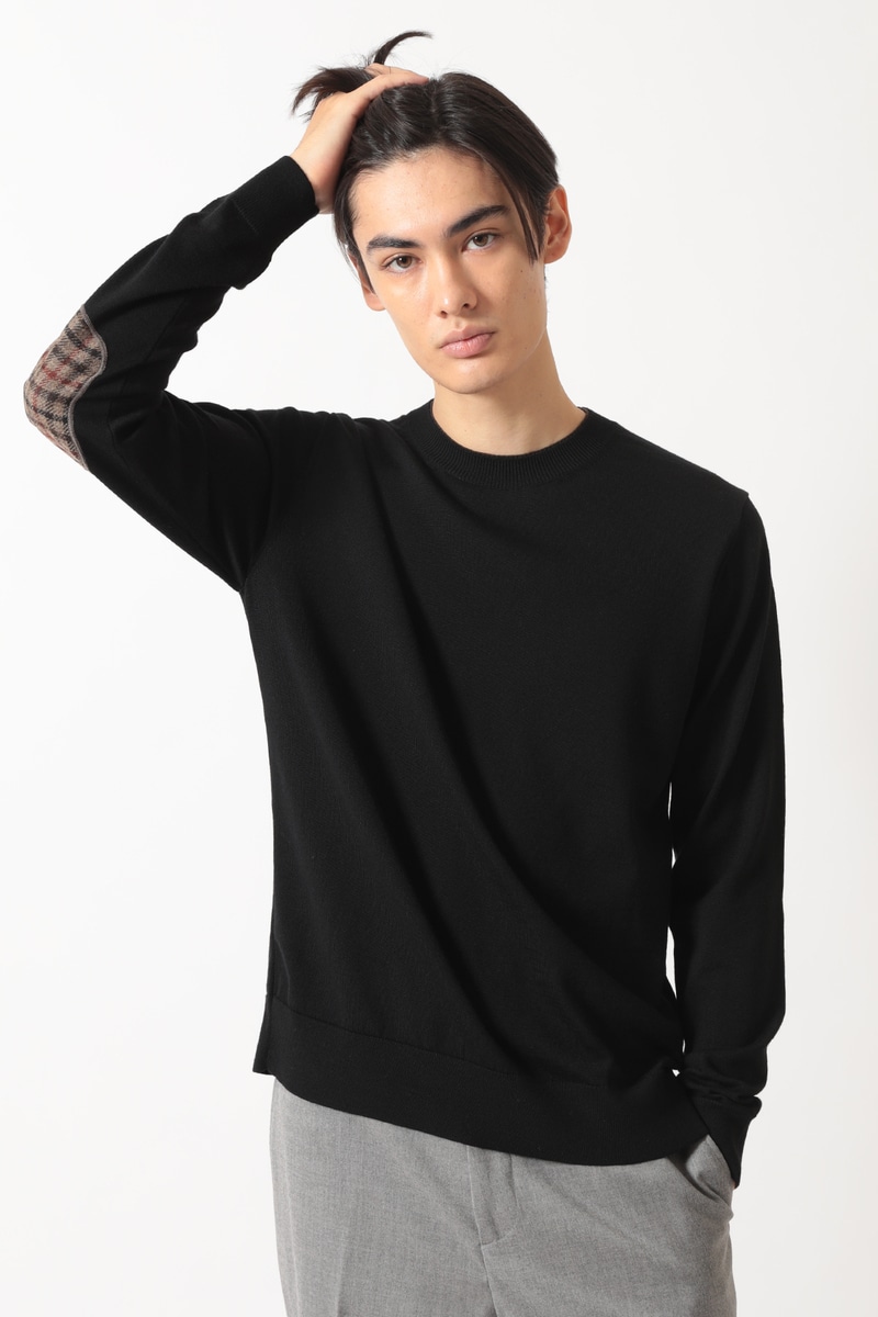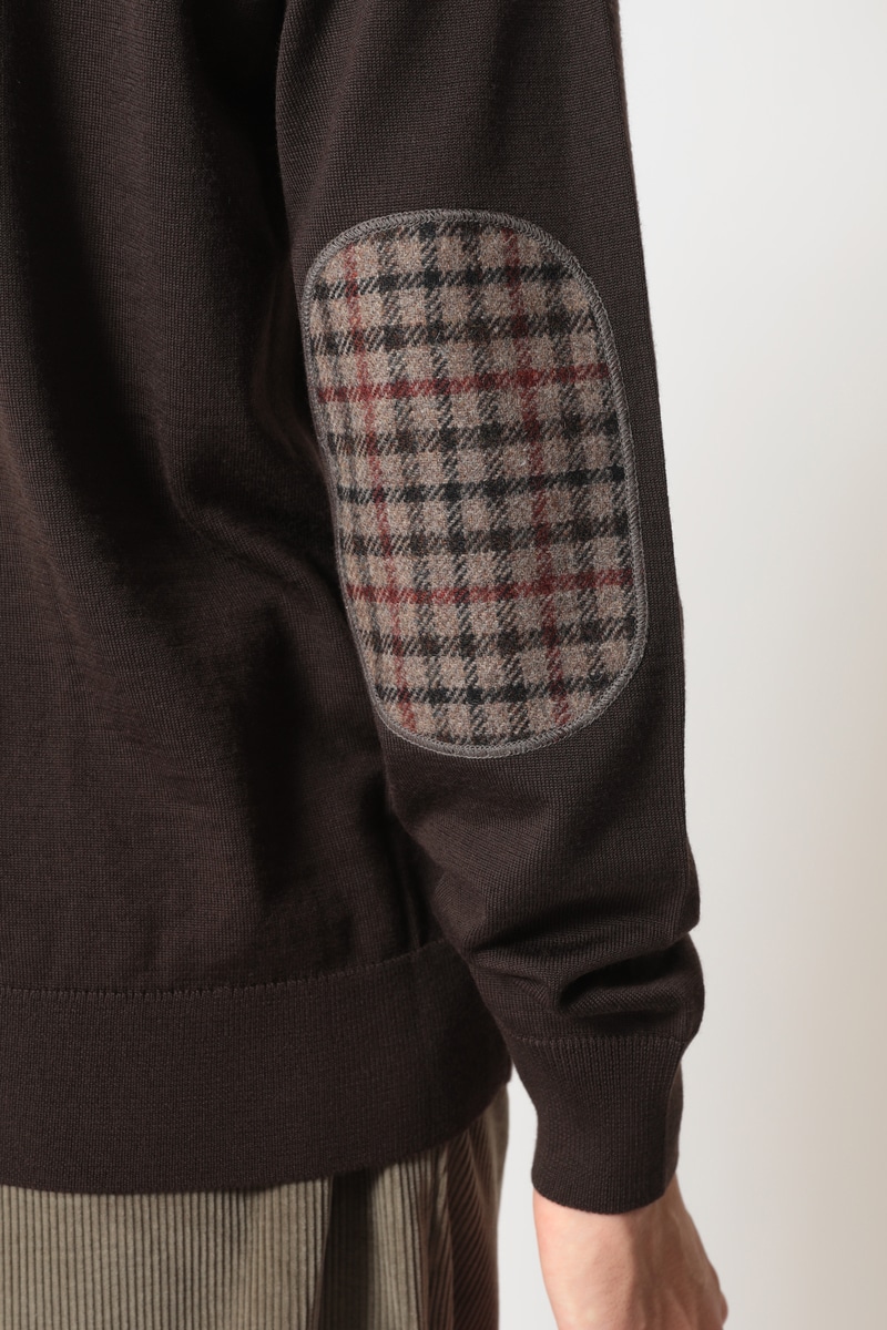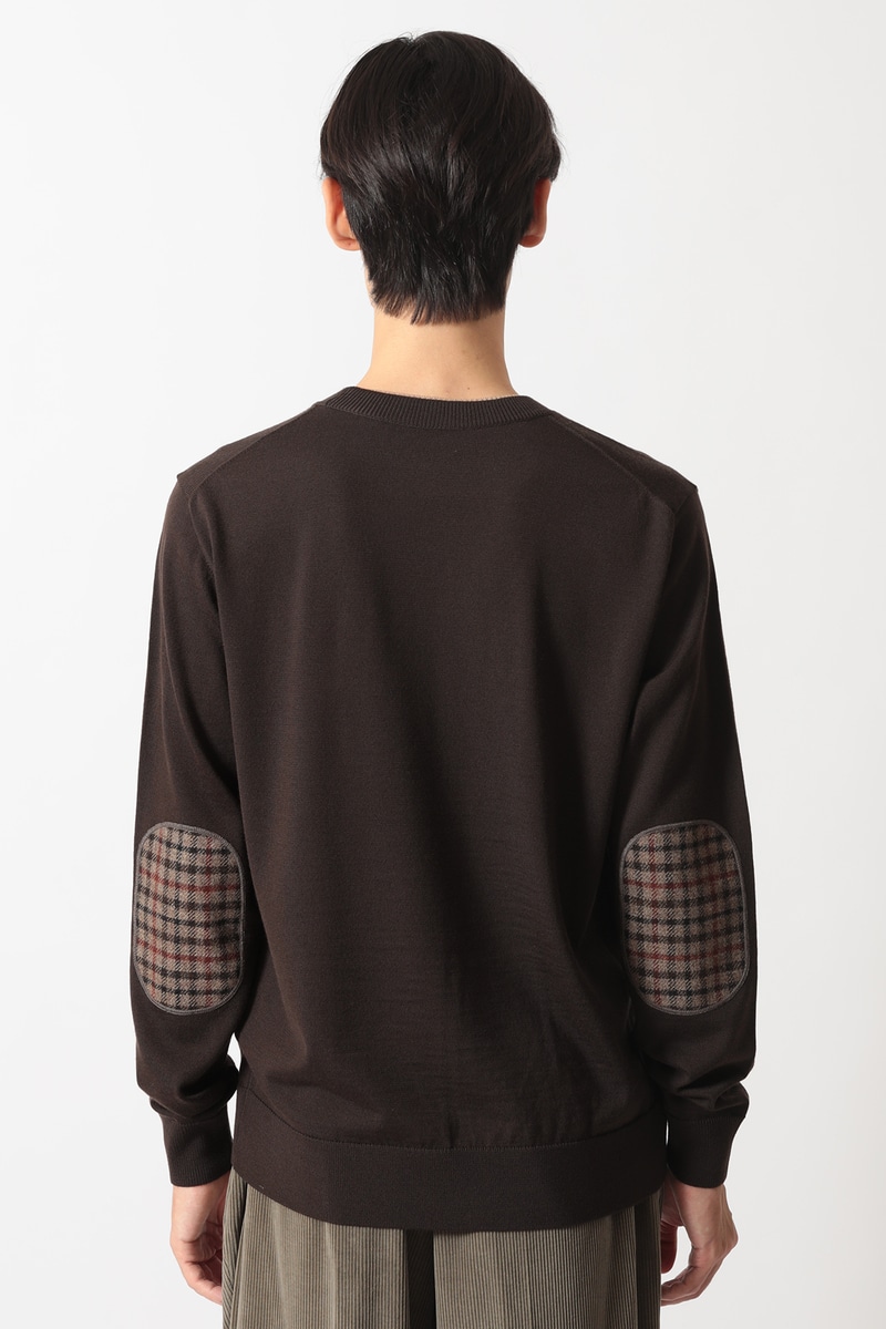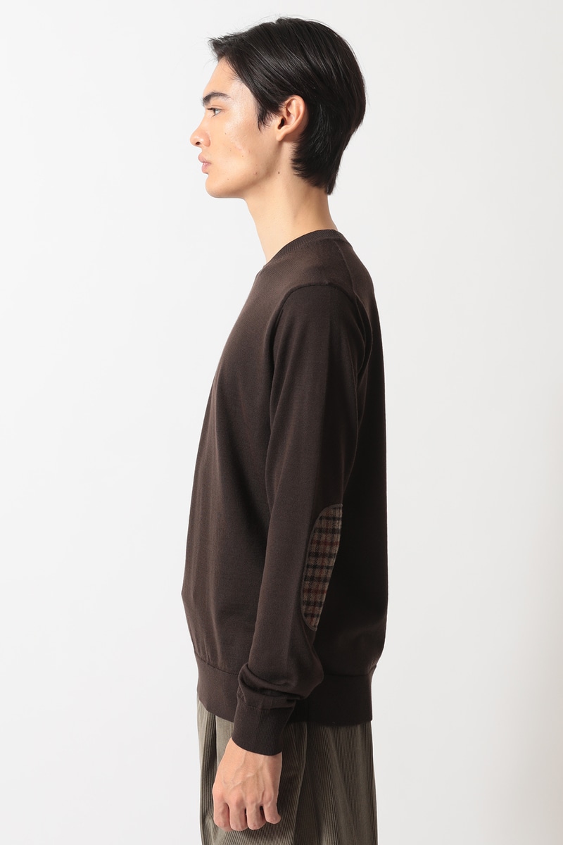 2/60 14G 2PLY天竺編みとHOUSE TWEEDを組み合わせたクルーネックニットです。配色のダブルカラーがデザインのポイント。エルボーパッチには、ロンドンDAKSがMOON社に別注したHOUSETWEEDを使用し、ブリティッシュ感を演出しています。DAKSらしい上品な素材感と、洗練されたデザインが魅力の一枚です。