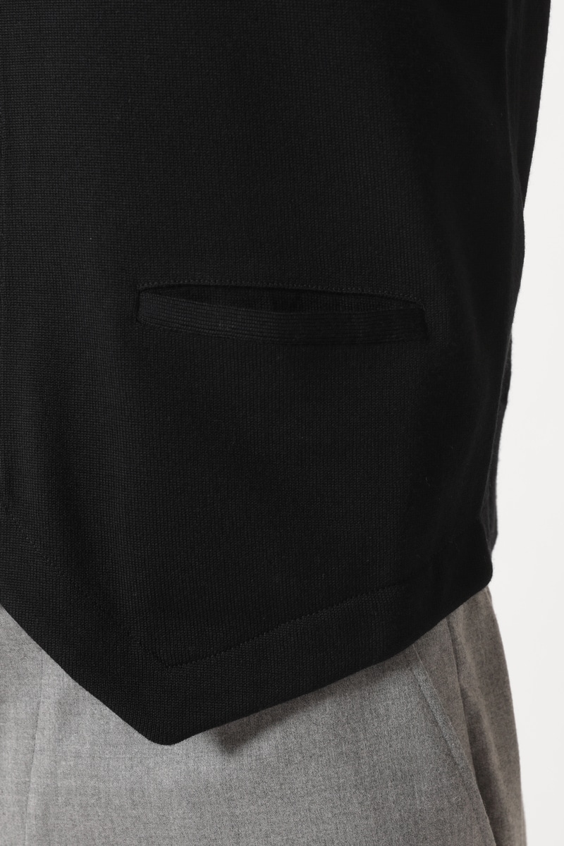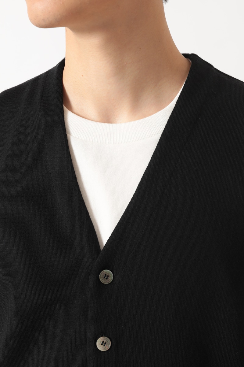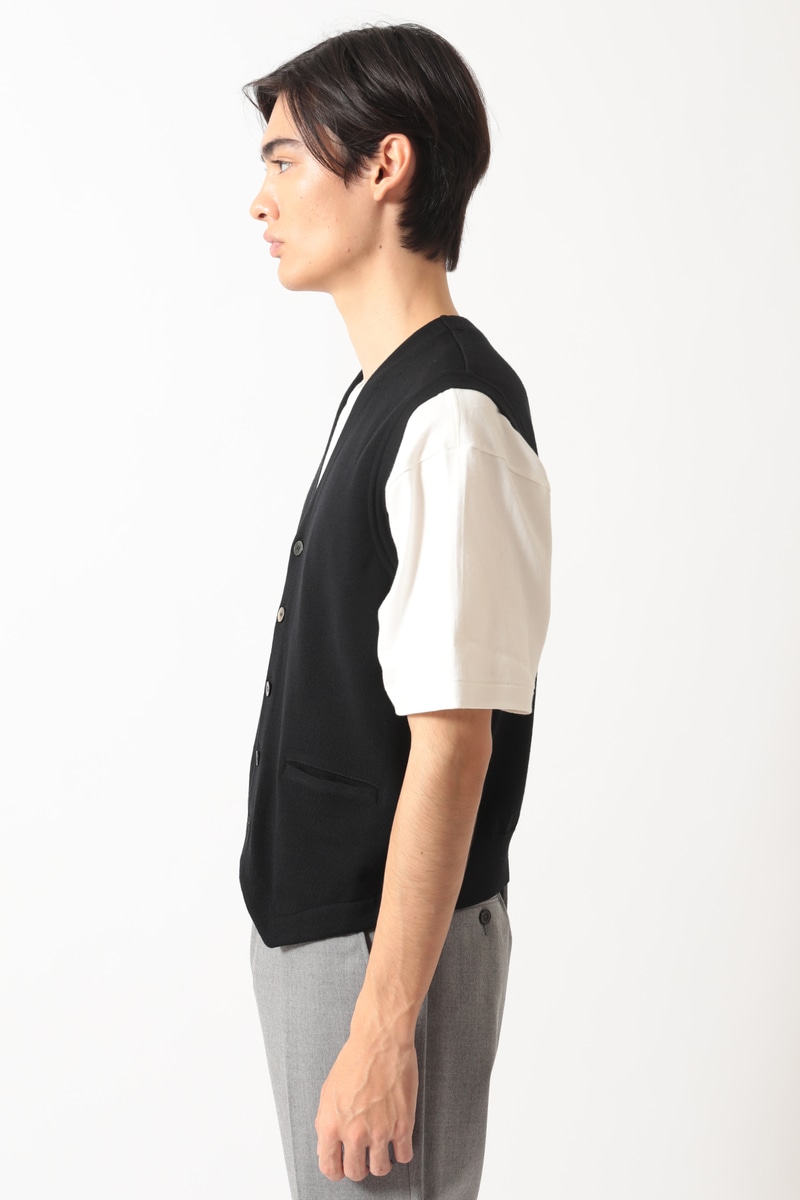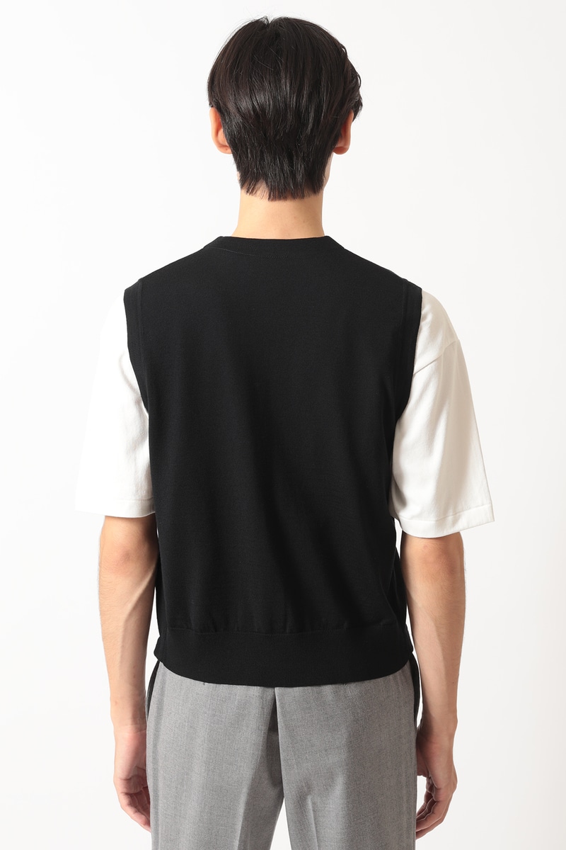 前身頃には3/60 14G 2PLY、後身頃には2/60 2PLY天竺を使用し、異なる肉感に仕上げたニットベストです。前身頃はしっかりとした印象を与えつつ、後身頃は柔らかく体にフィットするようデザインされています。ブルゾンやジャケットのインナーとして、快適な着心地とDAKSらしい上品なスタイリングを両立する一枚です。
