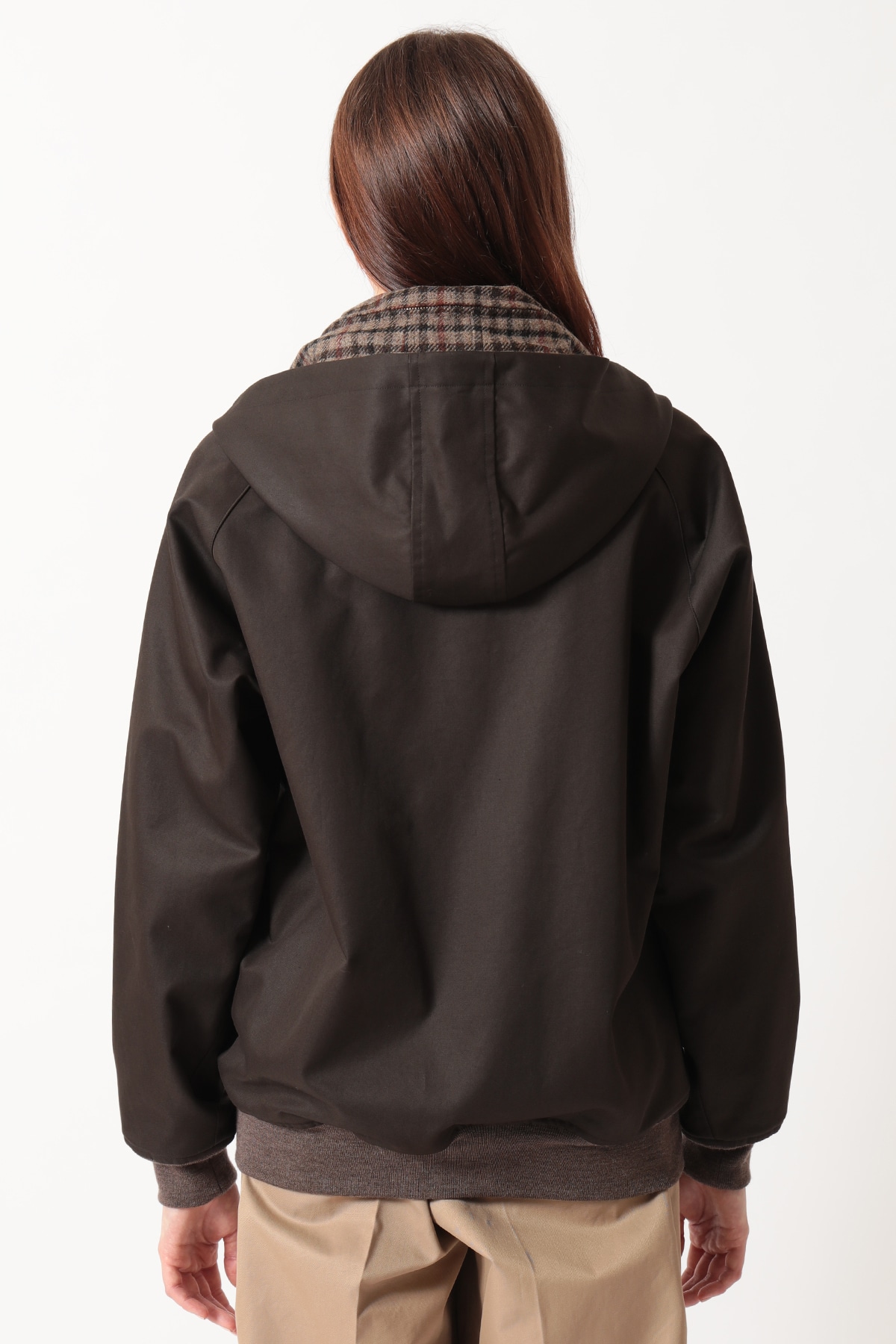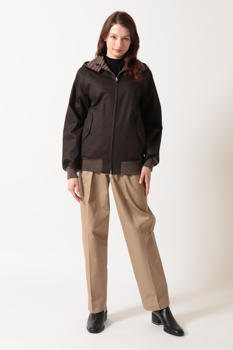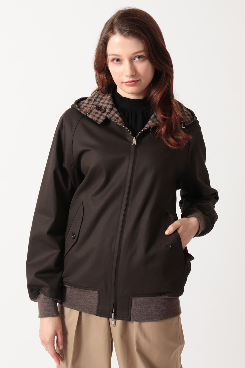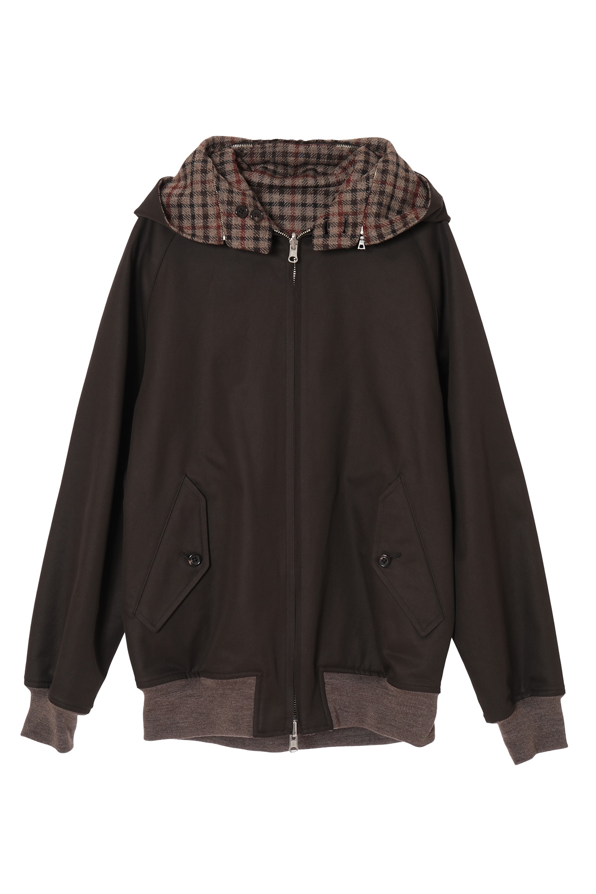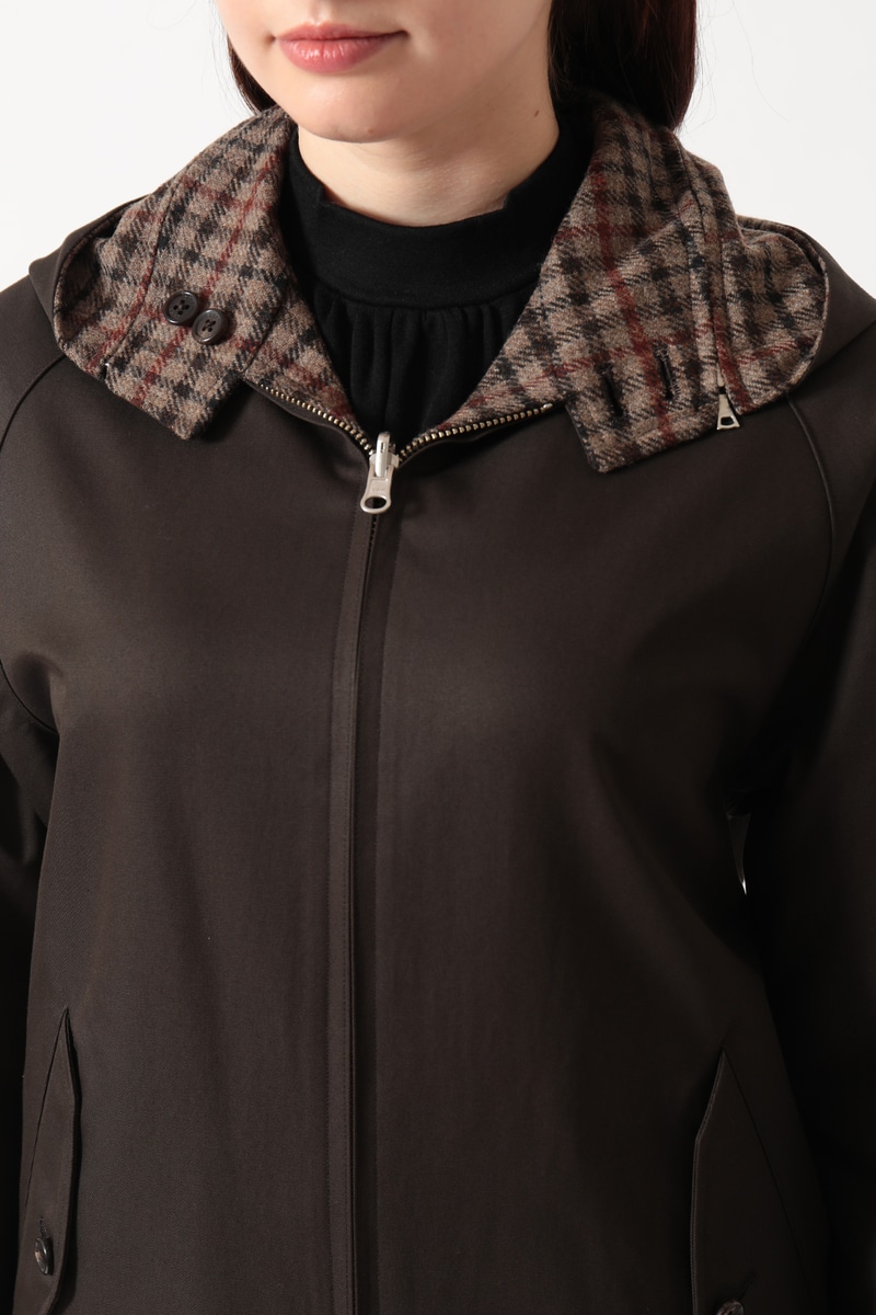 DAKSとScyeの融合から生まれた、4通りの着こなしが楽しめるリバーシブルハリントンジャケットです。ハリントンジャケットの特徴であるドッグイヤーカラーにはオープンファスナーを内蔵し、フードの着脱が可能です。「表裏」と「フードの有無」を組み合わせることで、一つのアイテムで多彩な表情を楽しめます。表面はFinxコットン生地、裏面にはDAKSのハウスチェックを再解釈した英国・ムーン社のハウスツイード生地を採用。異素材のコントラストと機能性を兼ね備えた、汎用性の高いアウターです。