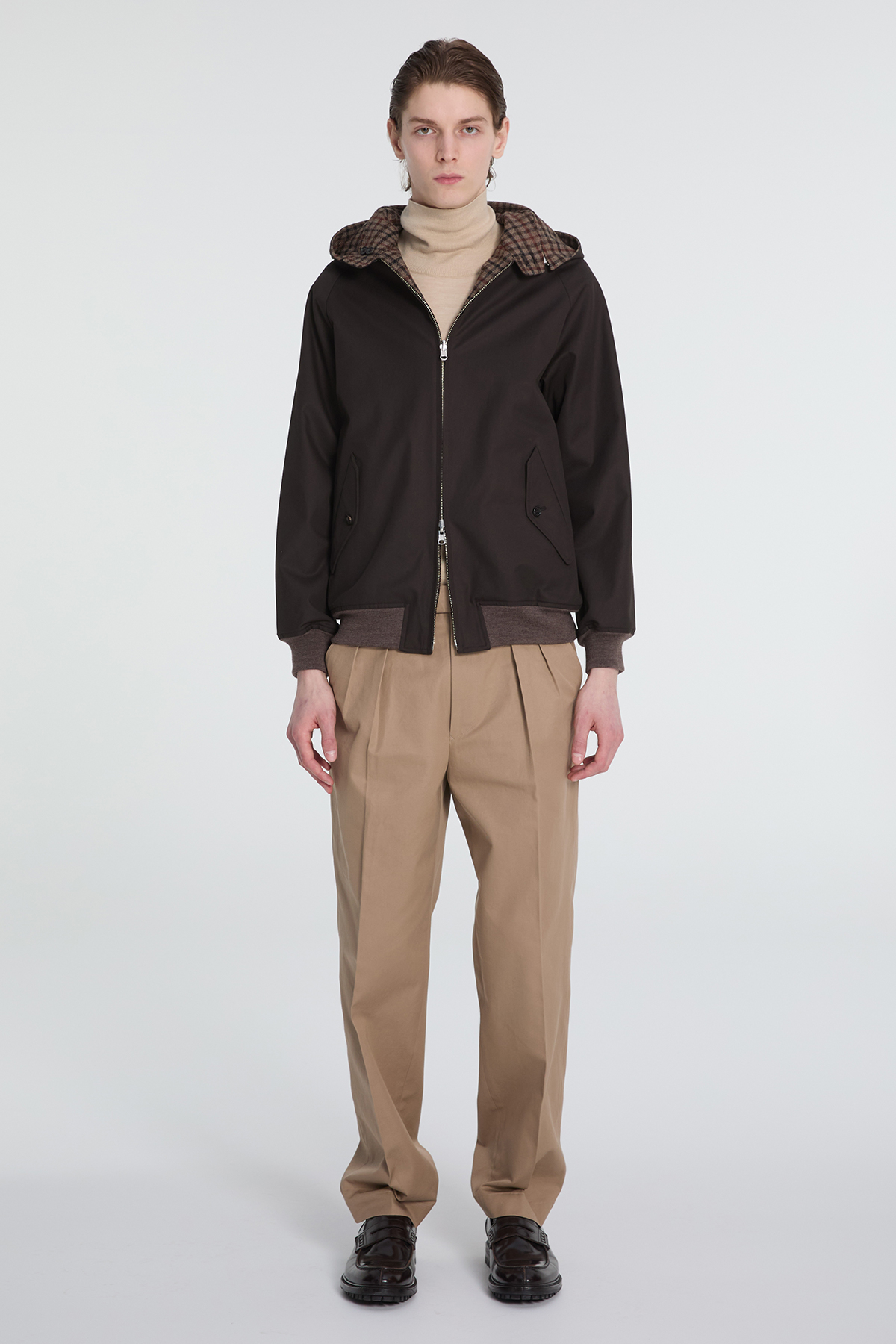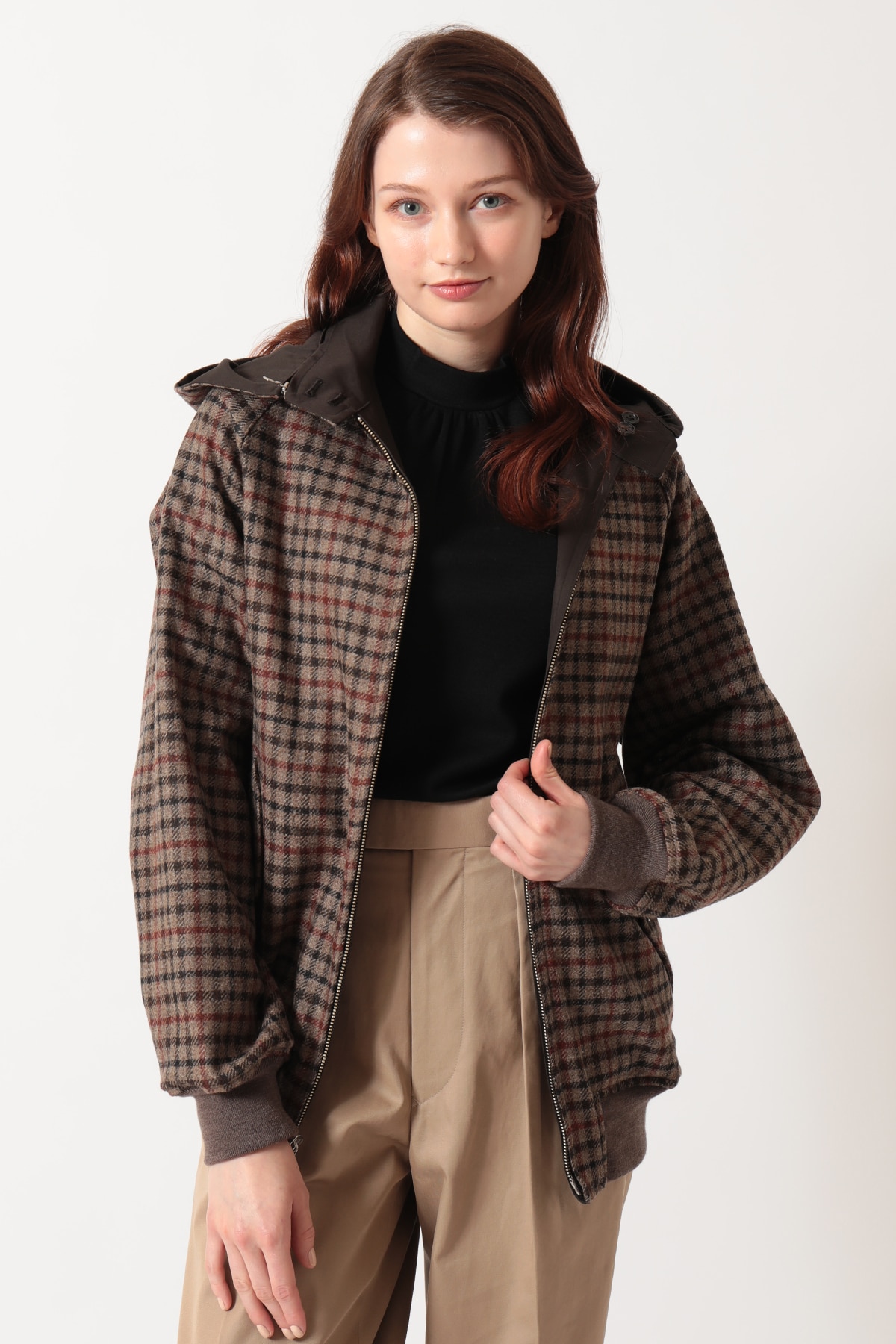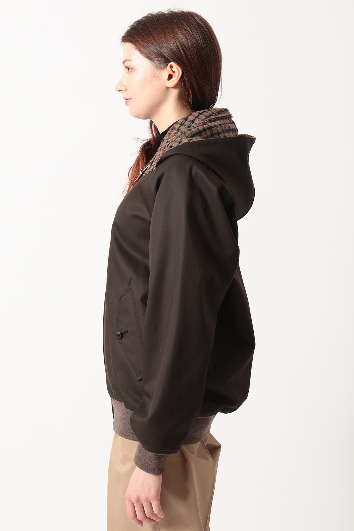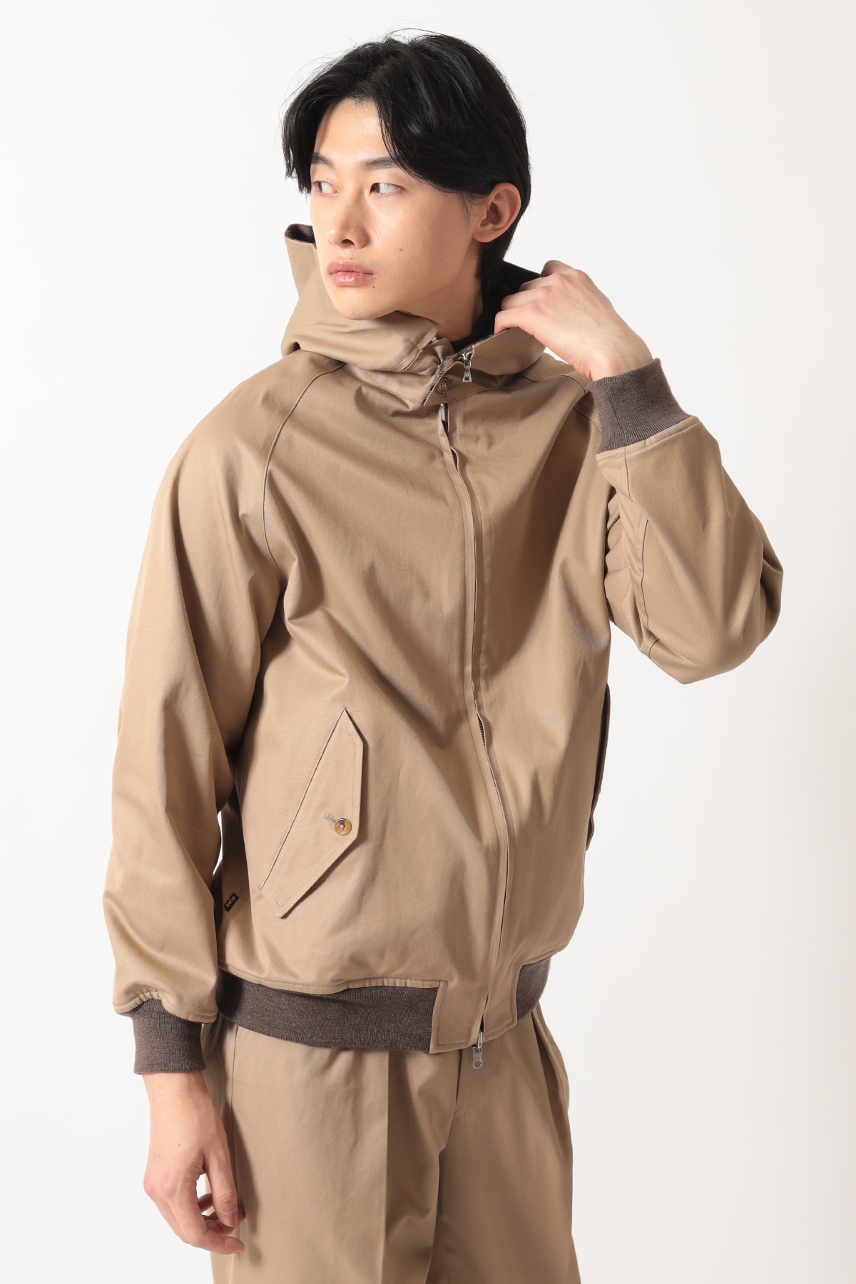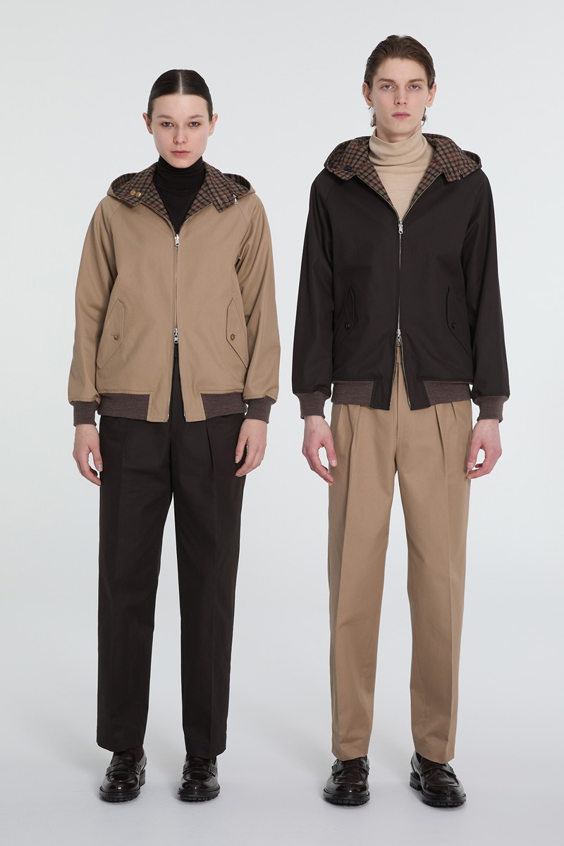 DAKSとScyeの融合から生まれた、4通りの着こなしが楽しめるリバーシブルハリントンジャケットです。ハリントンジャケットの特徴であるドッグイヤーカラーにはオープンファスナーを内蔵し、フードの着脱が可能です。「表裏」と「フードの有無」を組み合わせることで、一つのアイテムで多彩な表情を楽しめます。表面はFinxコットン生地、裏面にはDAKSのハウスチェックを再解釈した英国・ムーン社のハウスツイード生地を採用。異素材のコントラストと機能性を兼ね備えた、汎用性の高いアウターです。