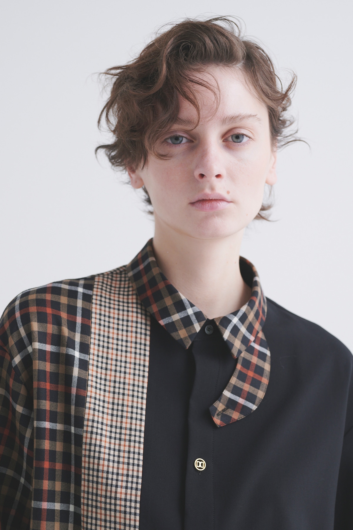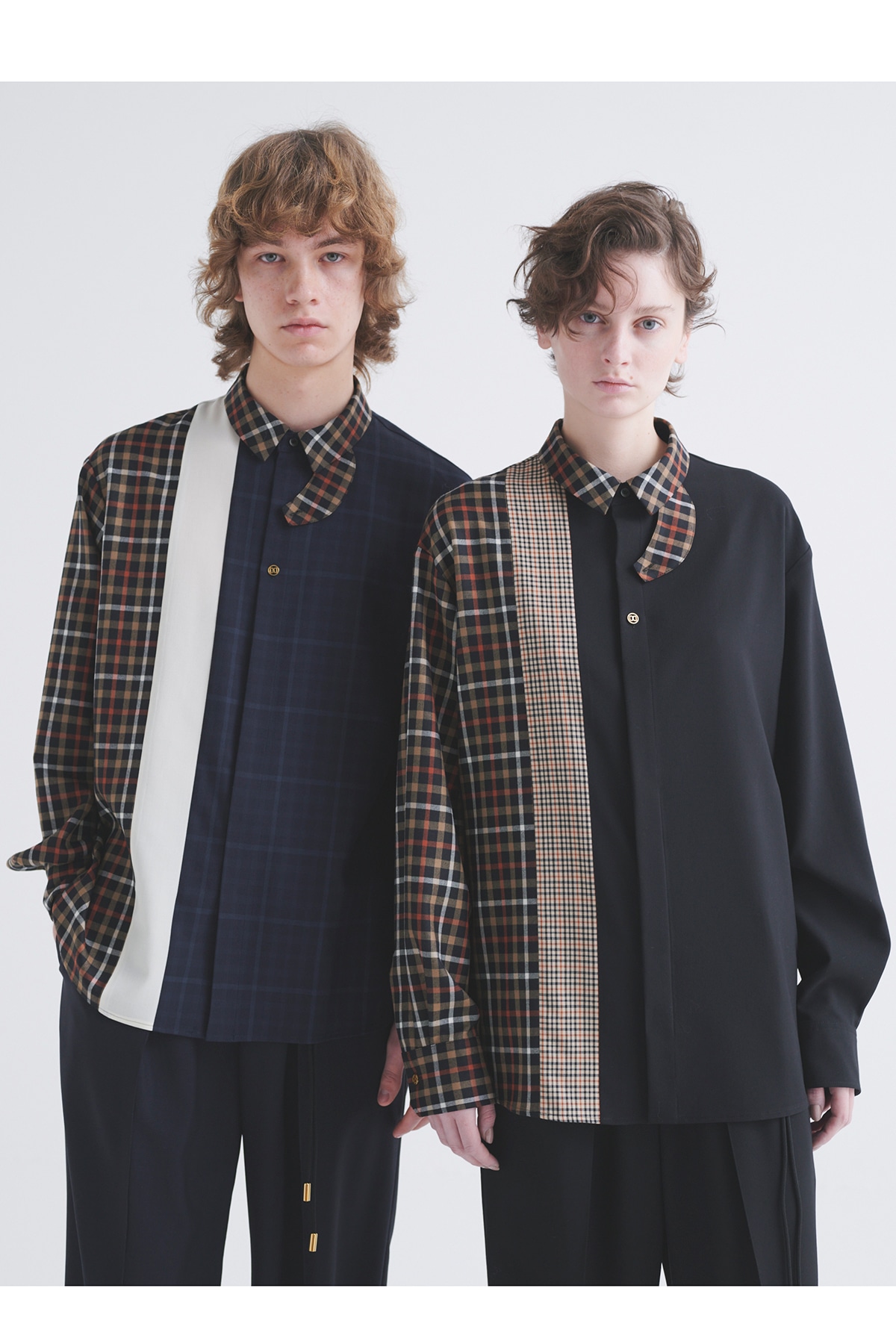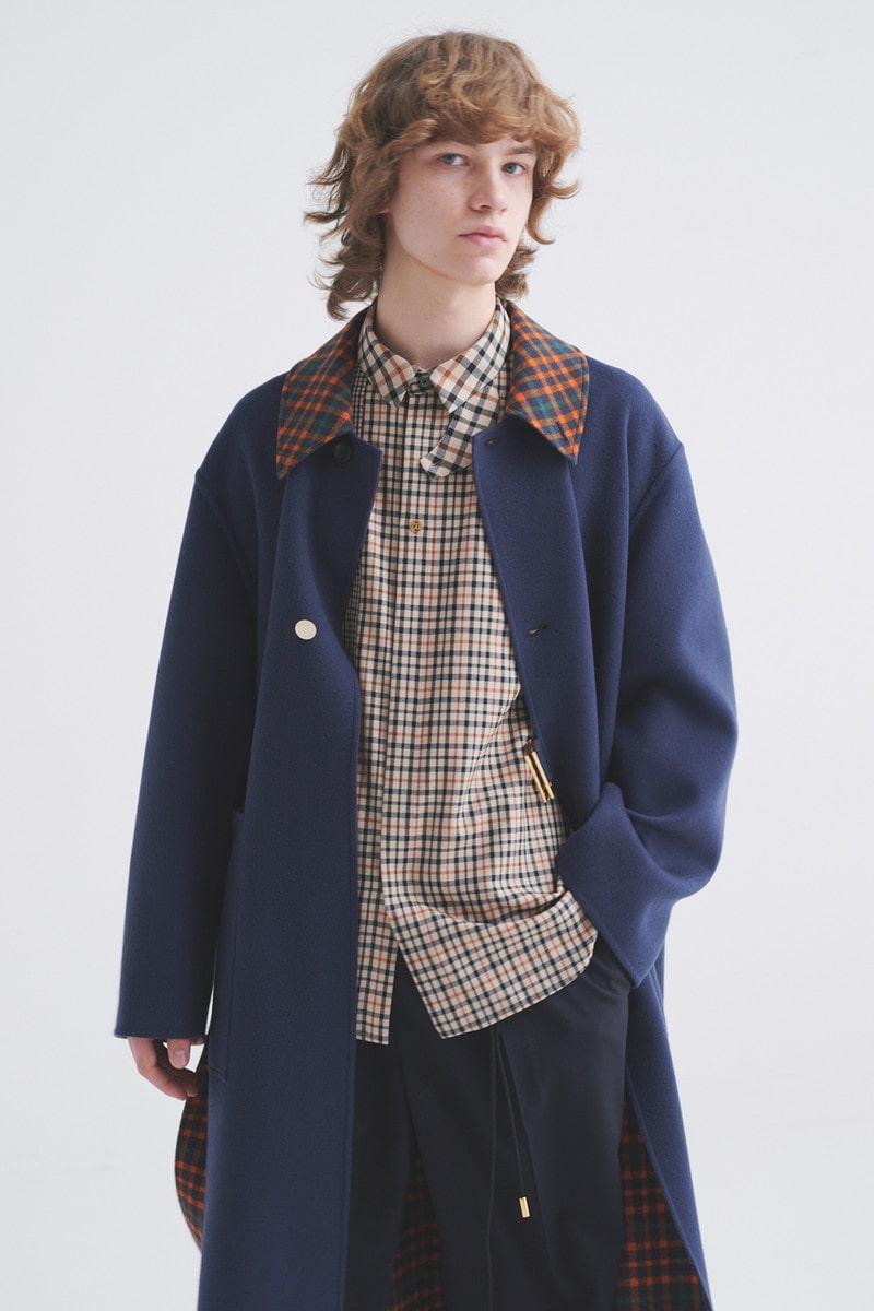 DAKSのアイコンであるハウスチェック柄の柔らかなウール生地を贅沢に使用し、ミニマルな比翼仕立ての前立てに配色のアクセントを効かせました。襟元のアシンメトリーチンタブが、CULLNIらしい現代的なひねりを加えています。