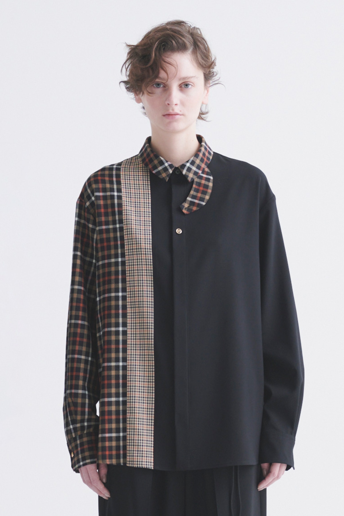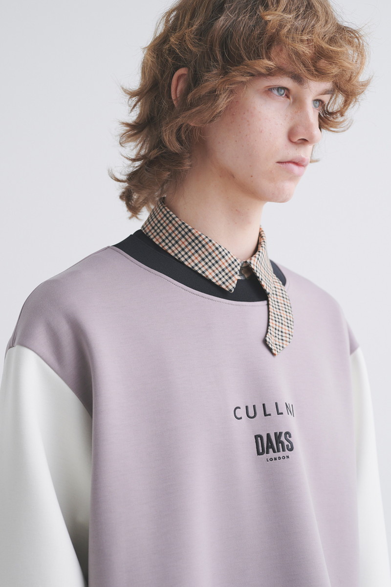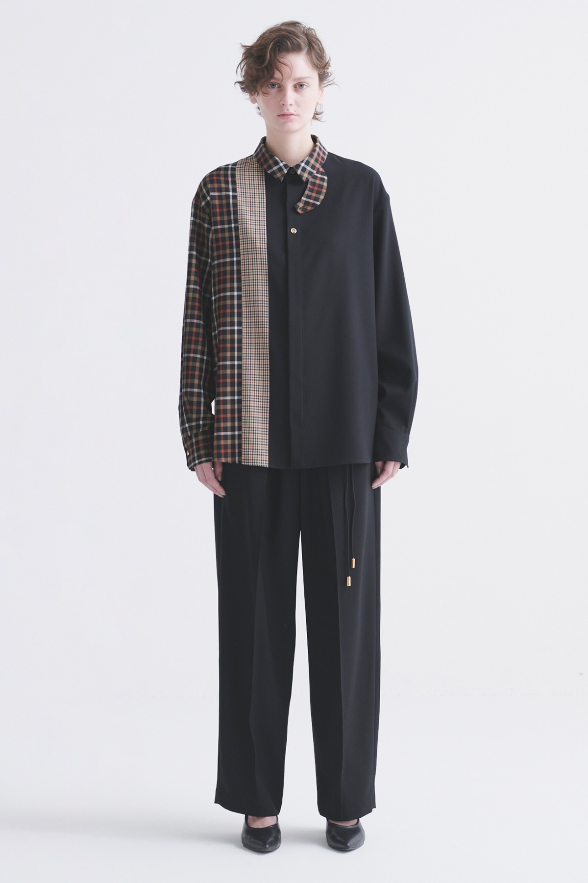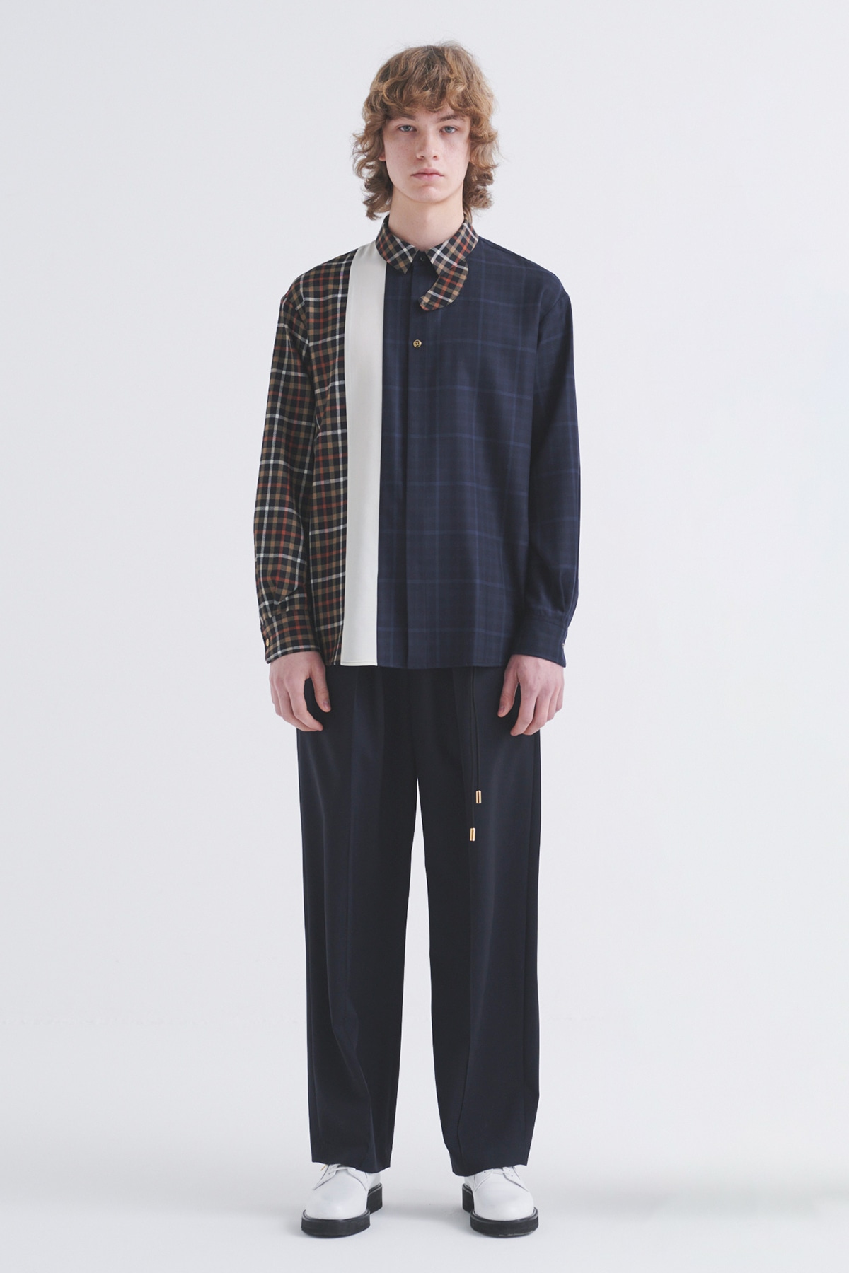 DAKSのアイコンであるハウスチェック柄の柔らかなウール生地を贅沢に使用し、ミニマルな比翼仕立ての前立てに配色のアクセントを効かせました。襟元のアシンメトリーチンタブが、CULLNIらしい現代的なひねりを加えています。