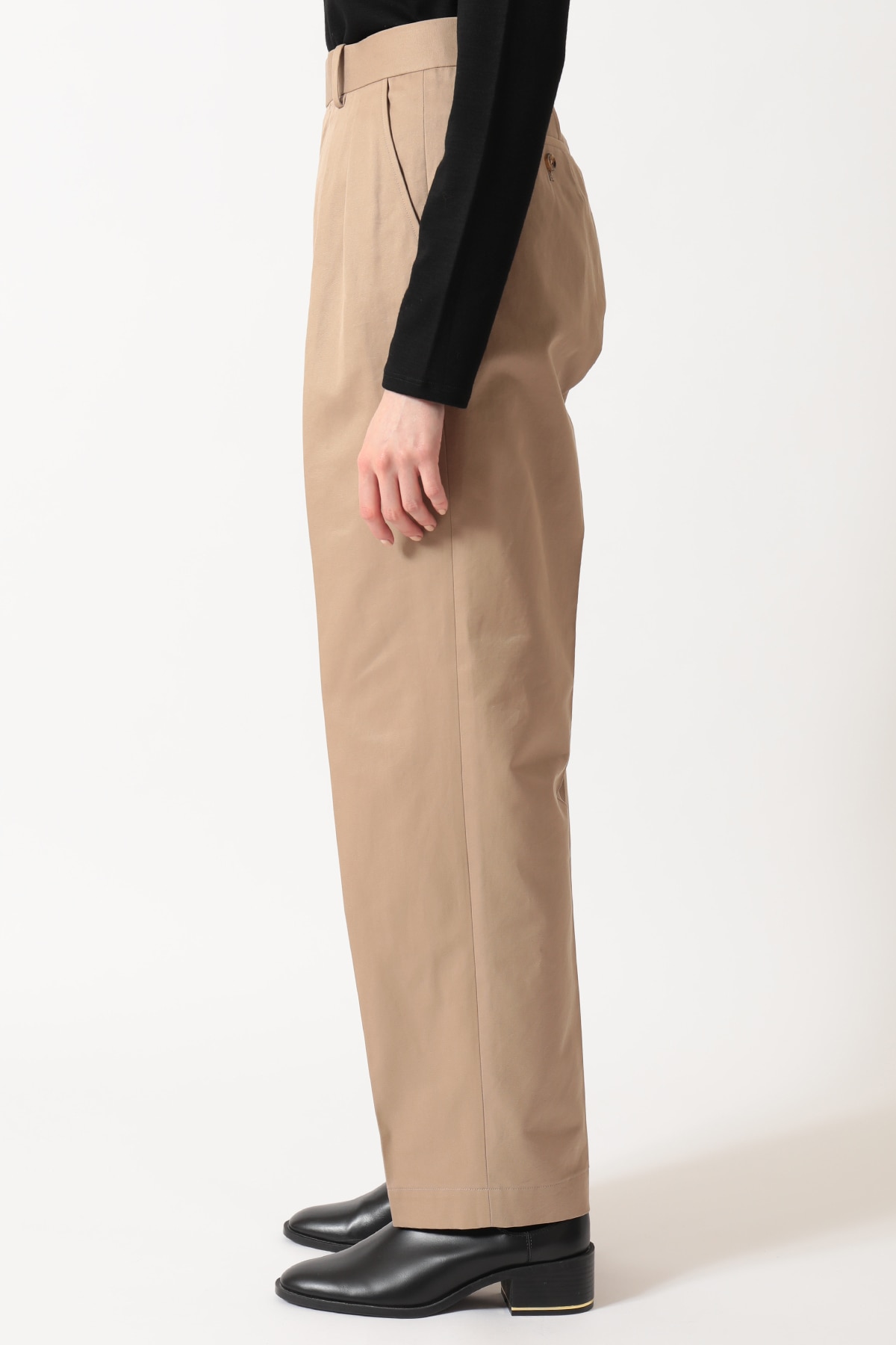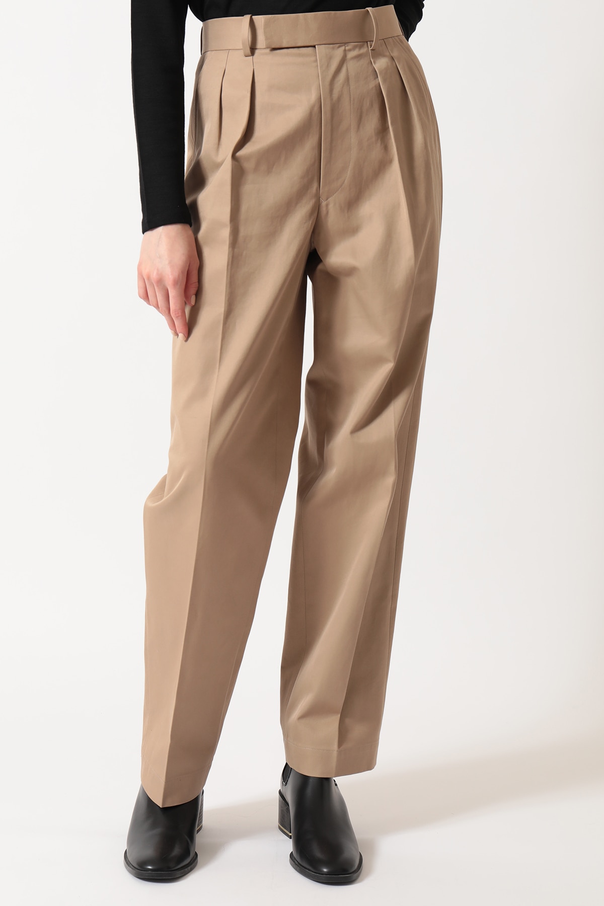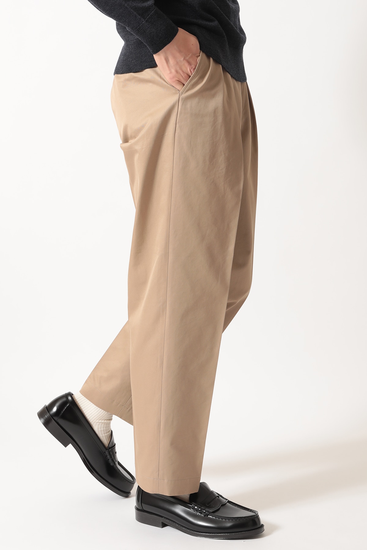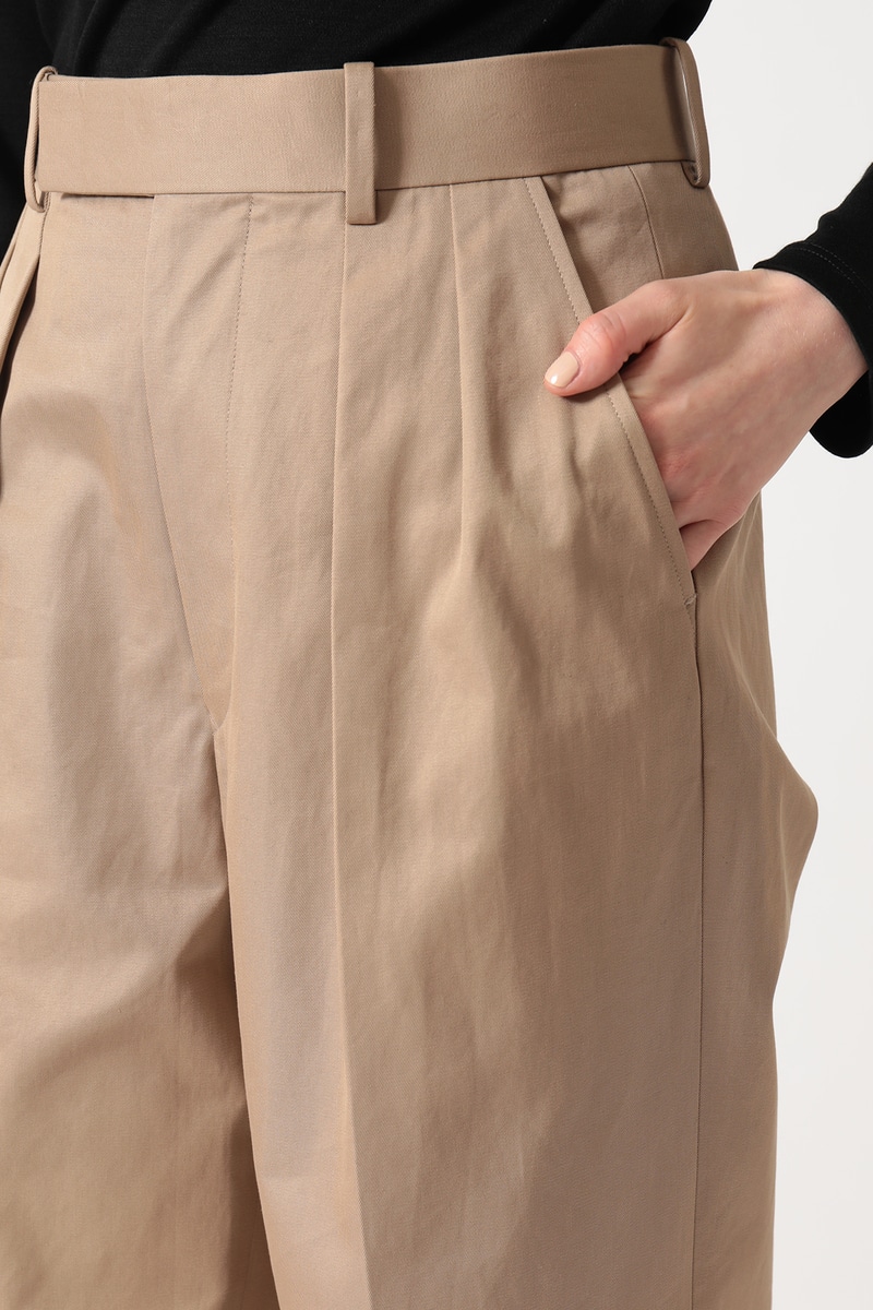 カジュアルなFinxコットン生地を用いながらも、ややドレス寄りに仕立てた、DAKSとScyeの融合を感じさせるトラウザーズです。左右2本のインタック(内向きのプリーツ)によるゆとりある渡り(わたり)から、裾にかけて緩やかにテーパードさせたモダンなセミワイドシルエットが特徴です。リラックスした穿き心地と、上品で洗練されたルックスを両立させた、幅広いシーンに対応する一本です。