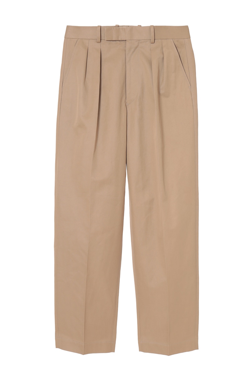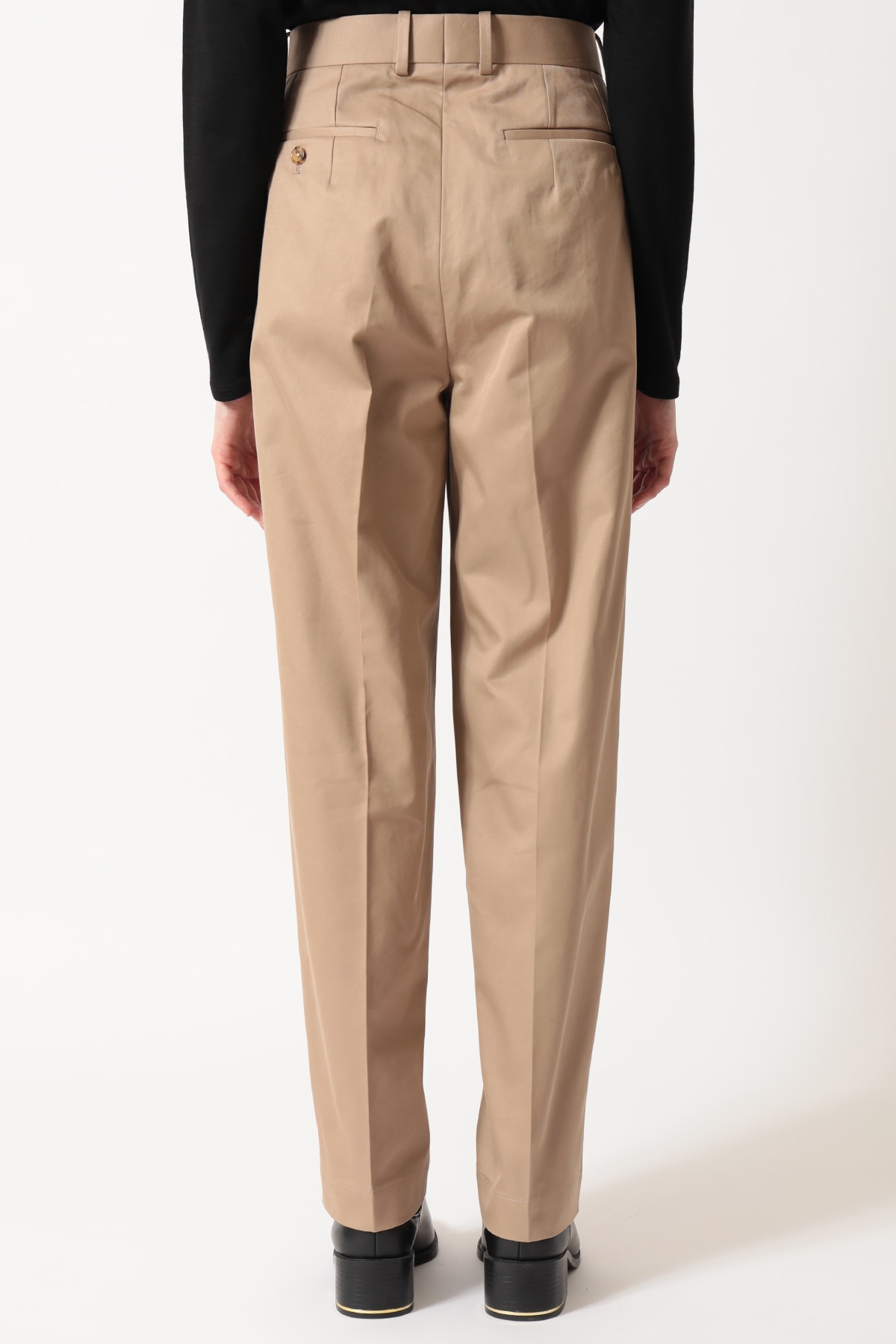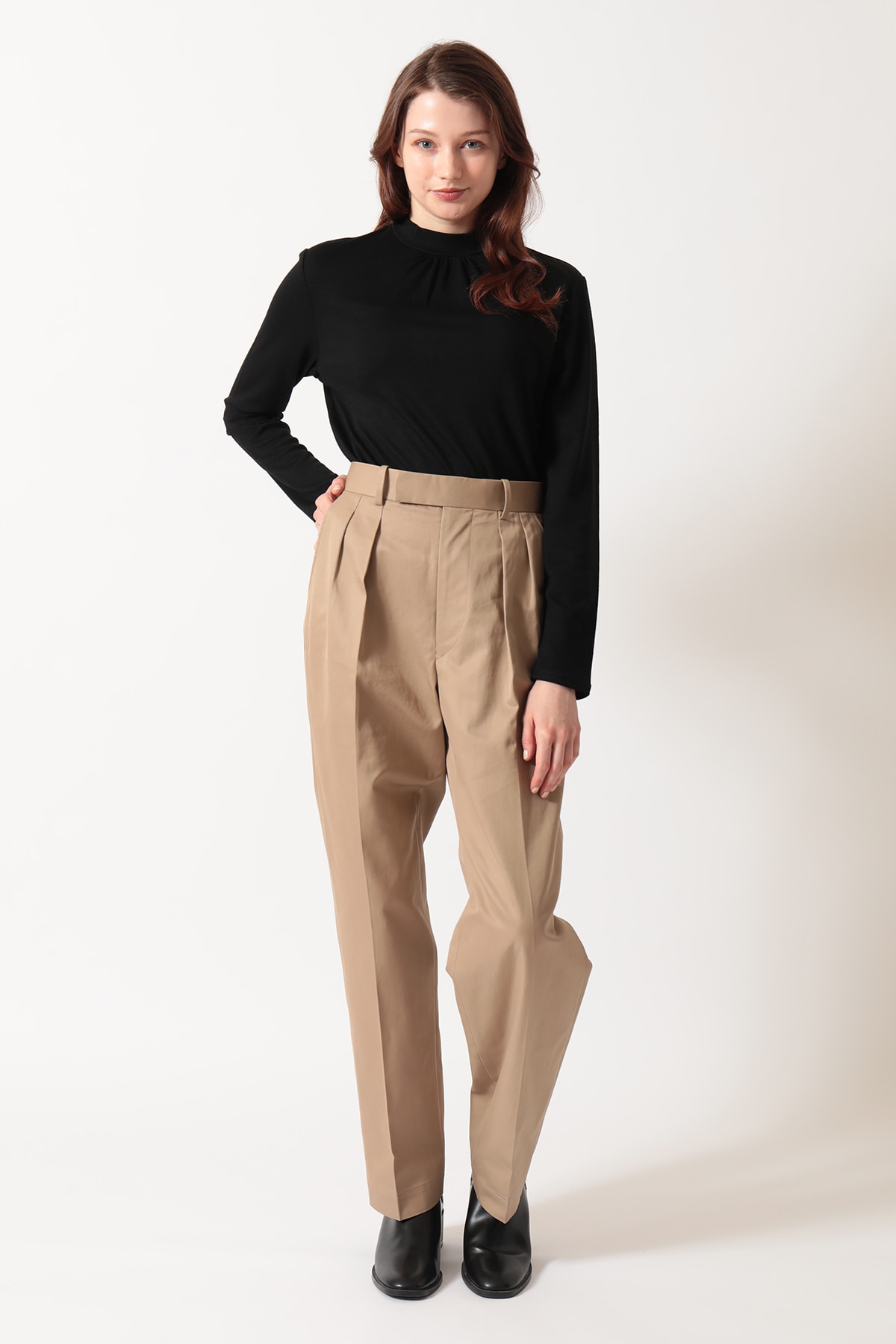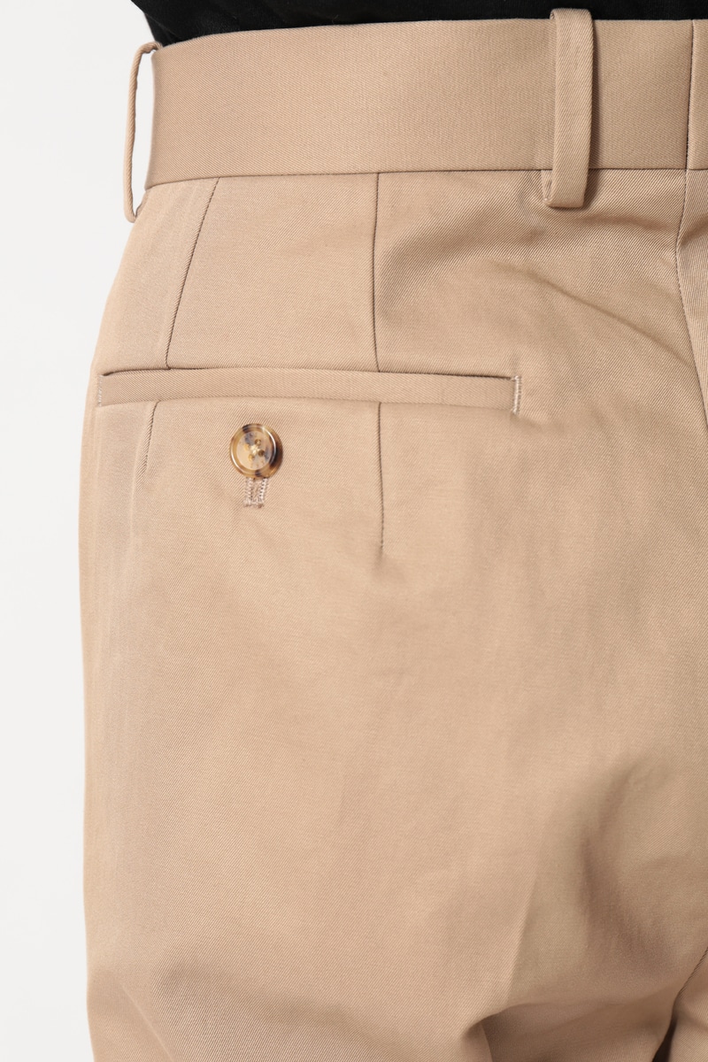 カジュアルなFinxコットン生地を用いながらも、ややドレス寄りに仕立てた、DAKSとScyeの融合を感じさせるトラウザーズです。左右2本のインタック(内向きのプリーツ)によるゆとりある渡り(わたり)から、裾にかけて緩やかにテーパードさせたモダンなセミワイドシルエットが特徴です。リラックスした穿き心地と、上品で洗練されたルックスを両立させた、幅広いシーンに対応する一本です。